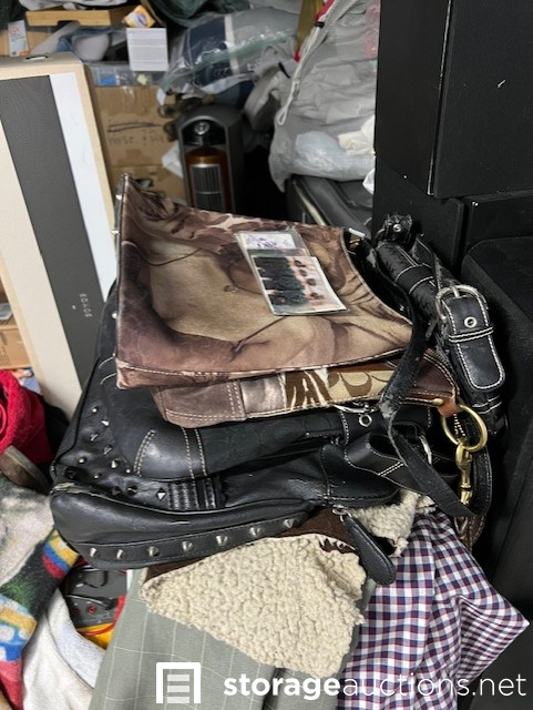 Tools, Many Purses, Camping Chairs, Coffeemaker, Clothing, Personal items, Many boxes and totes, Pots & Pans, Several Duffle Bags, Women Boots, Luggage, Golf Clubs, Safe, Tool Box, Material Dog Crate, Fishing Poles, Deep Fryer, Tool Cart