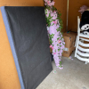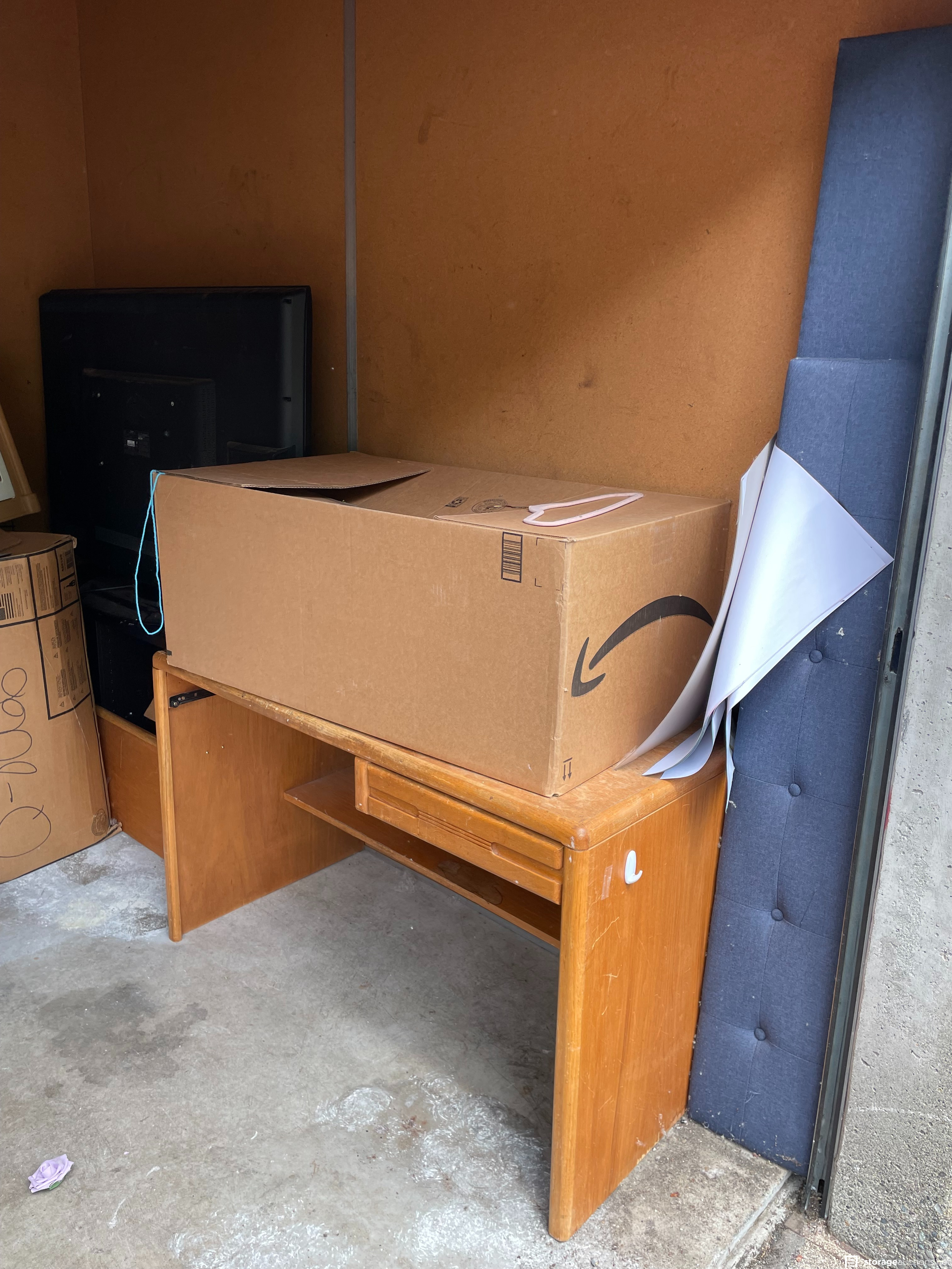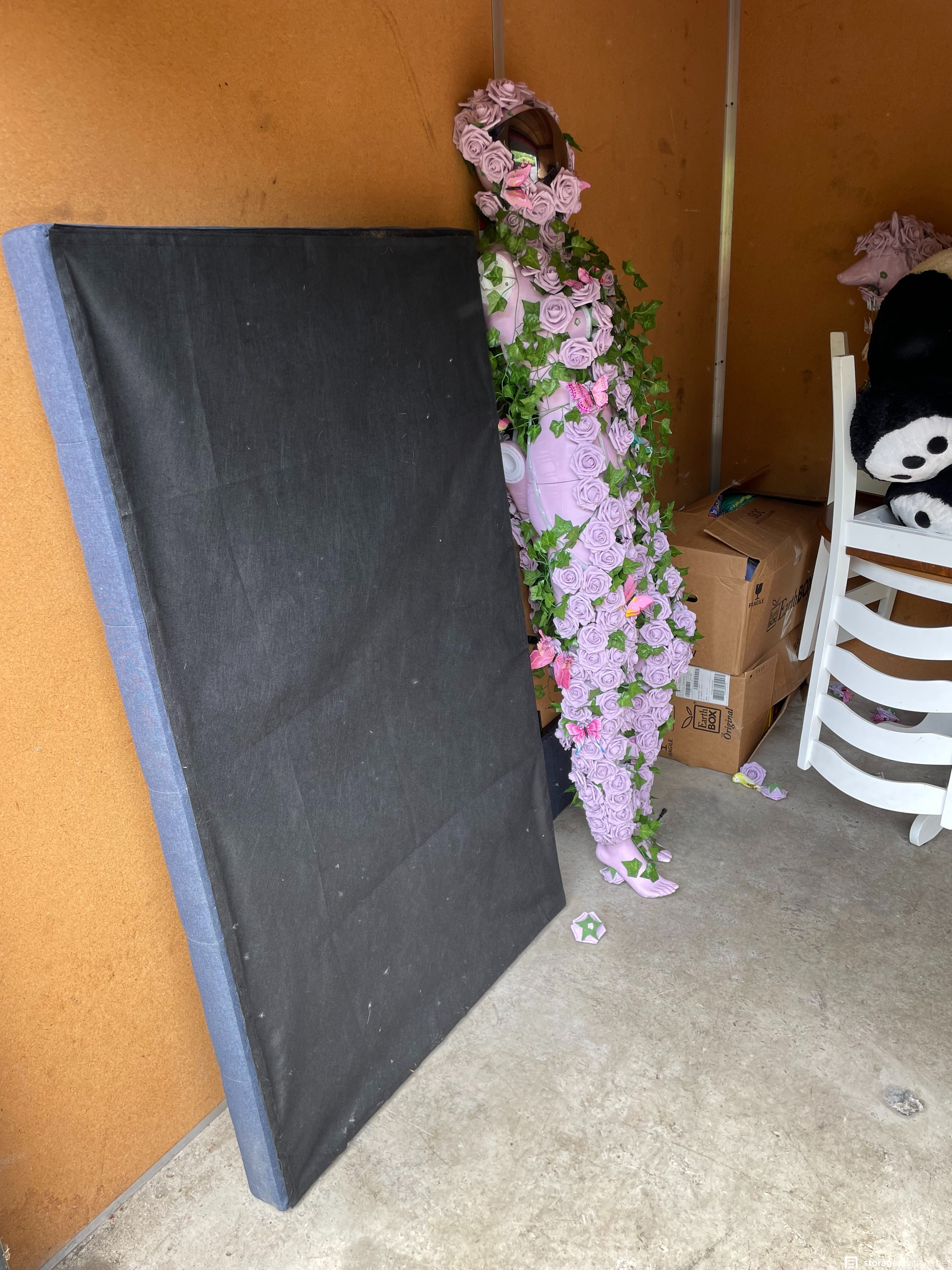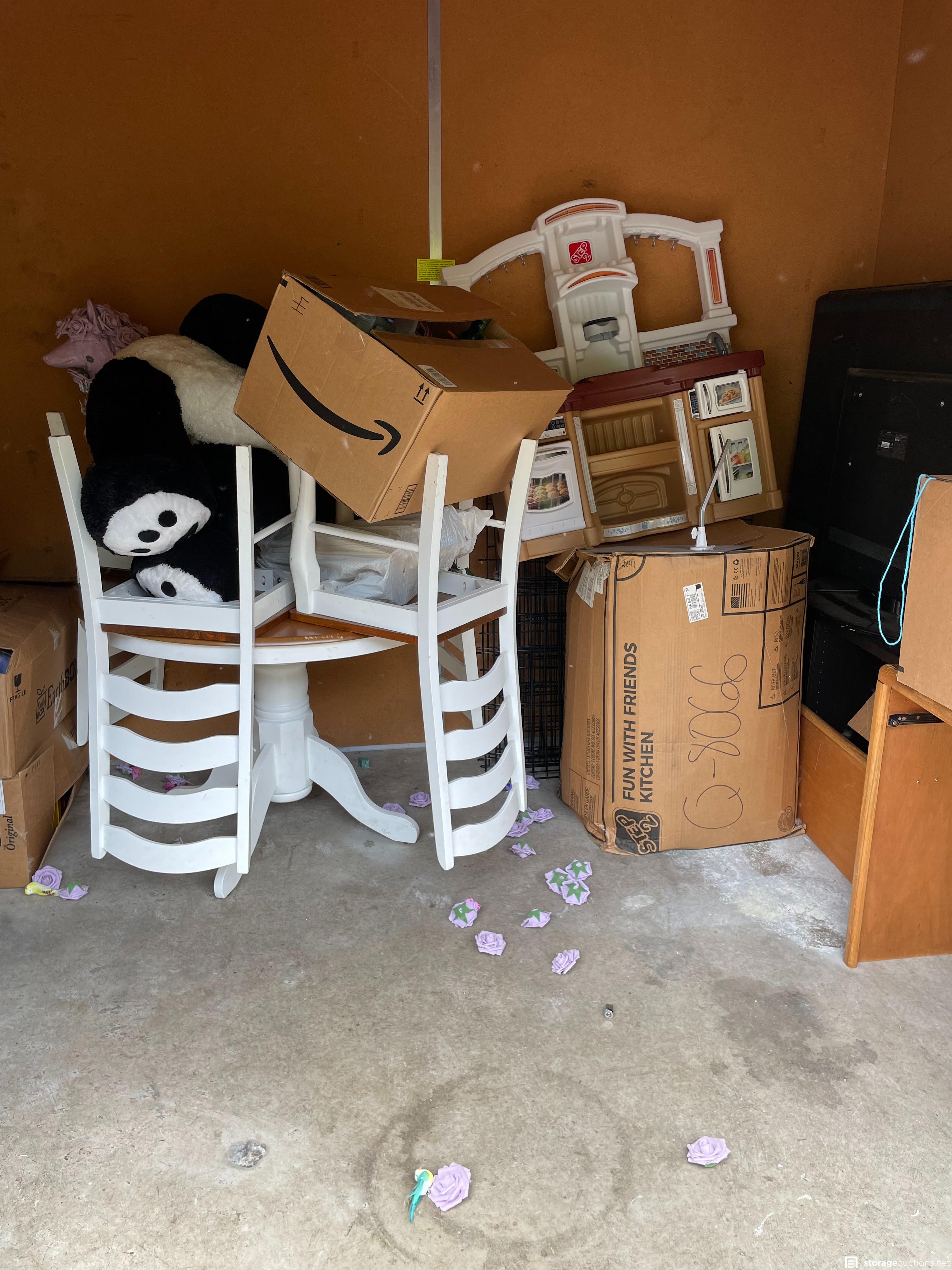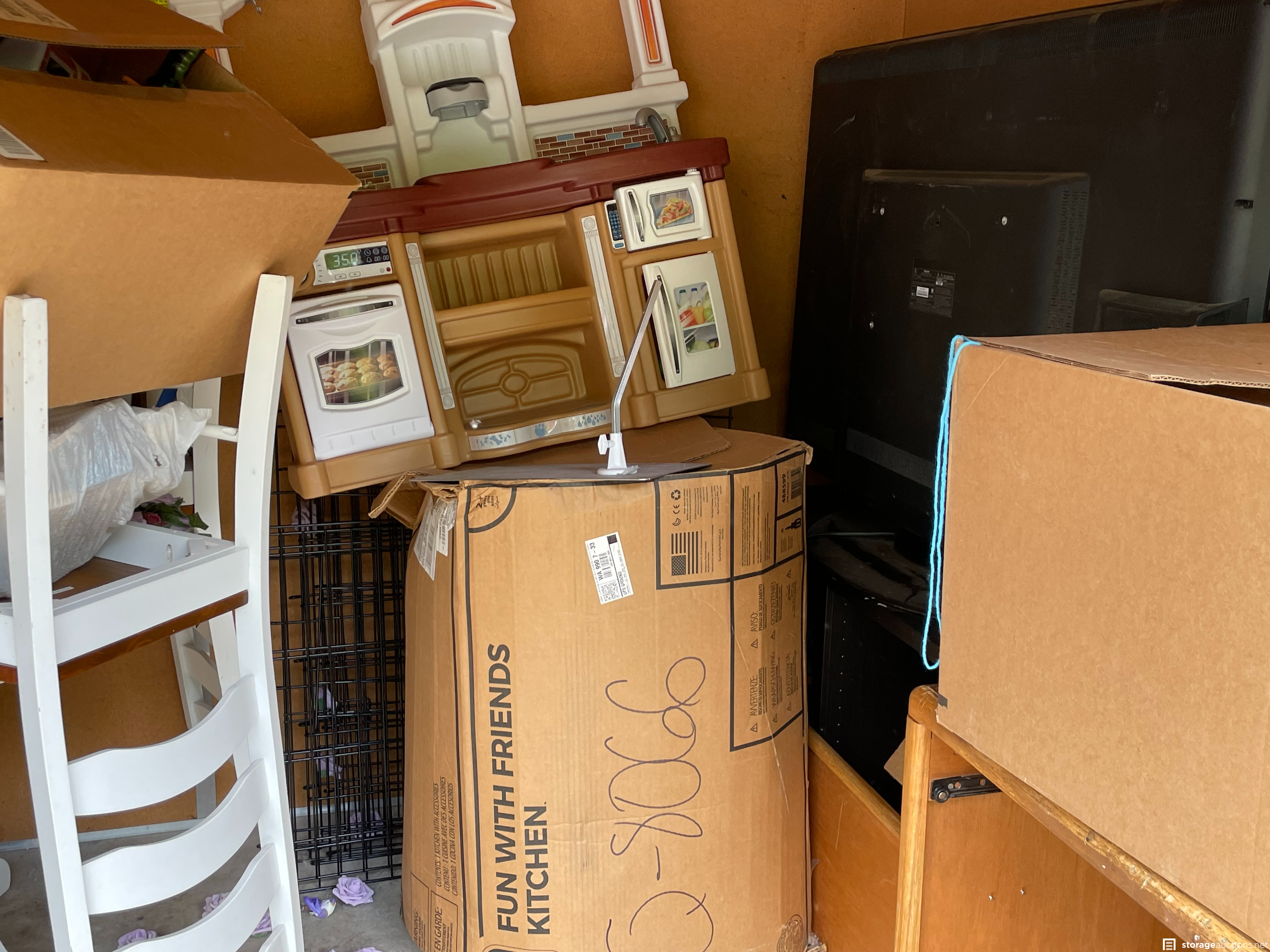 headboard, footboard, desk, boxes, kids play kitchen, TV, stuffed animals