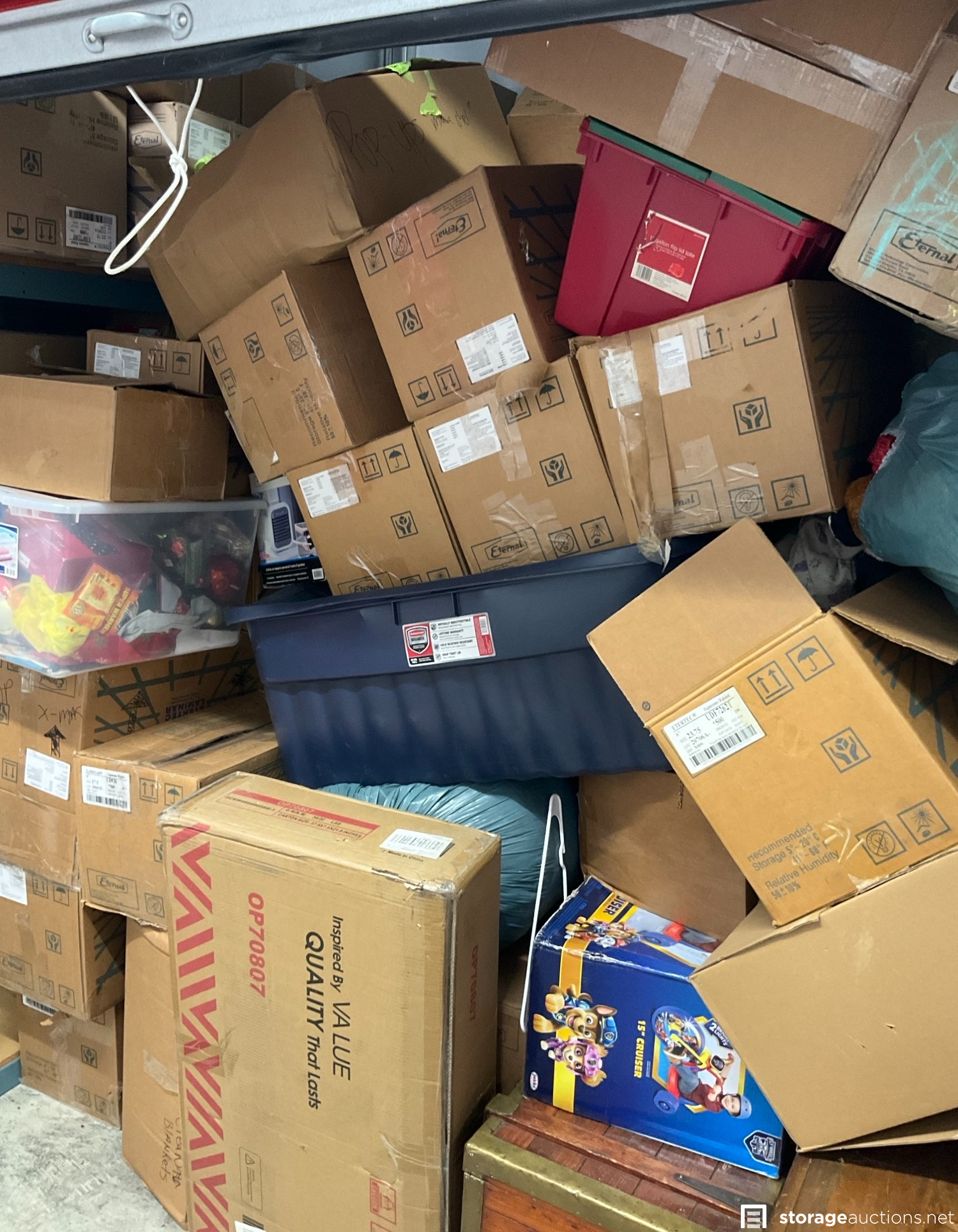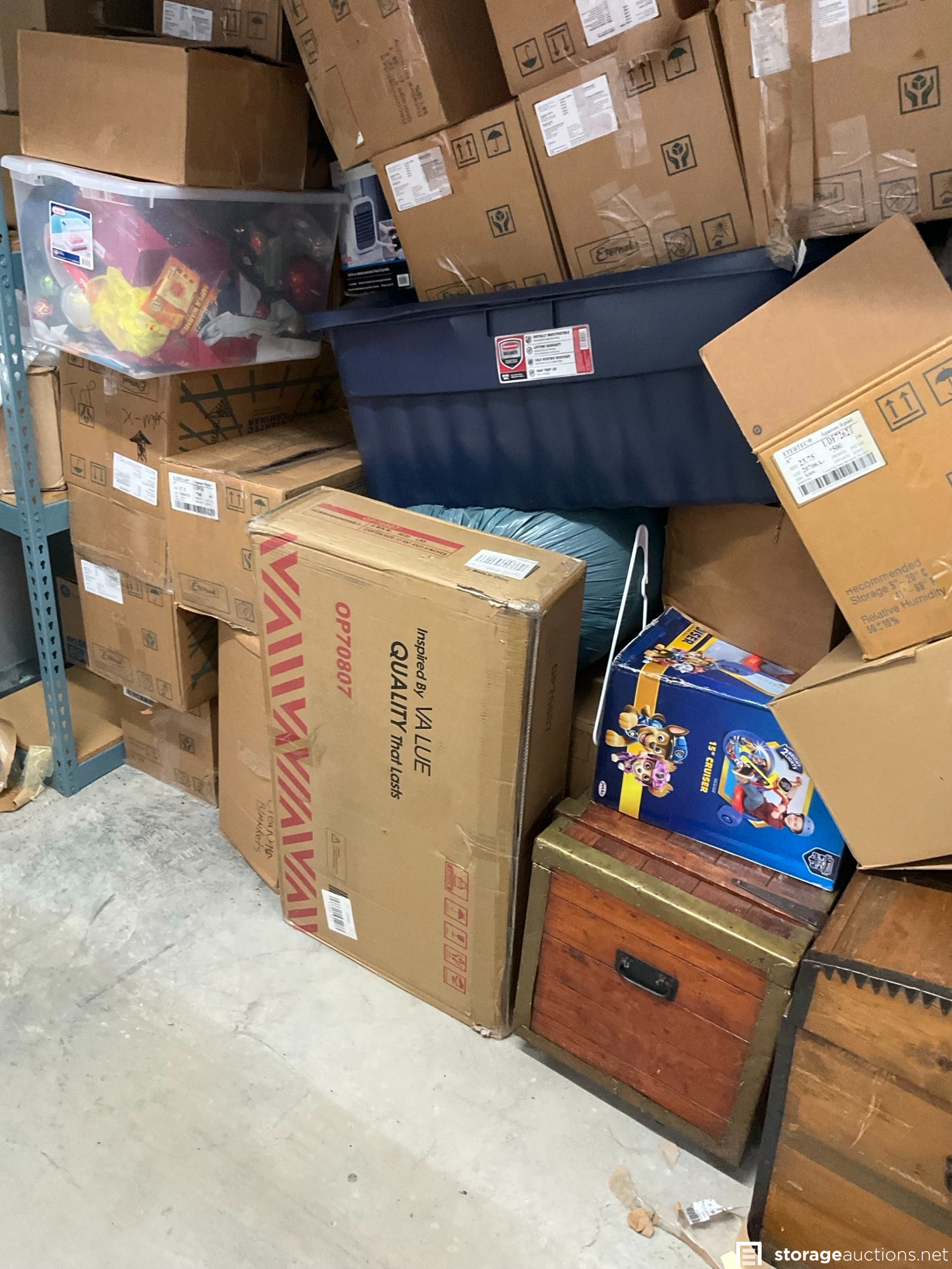 Kids Toys, Trunks, Plastic Totes, Boxes, Metal rack,Plastic Bags, Clothing.