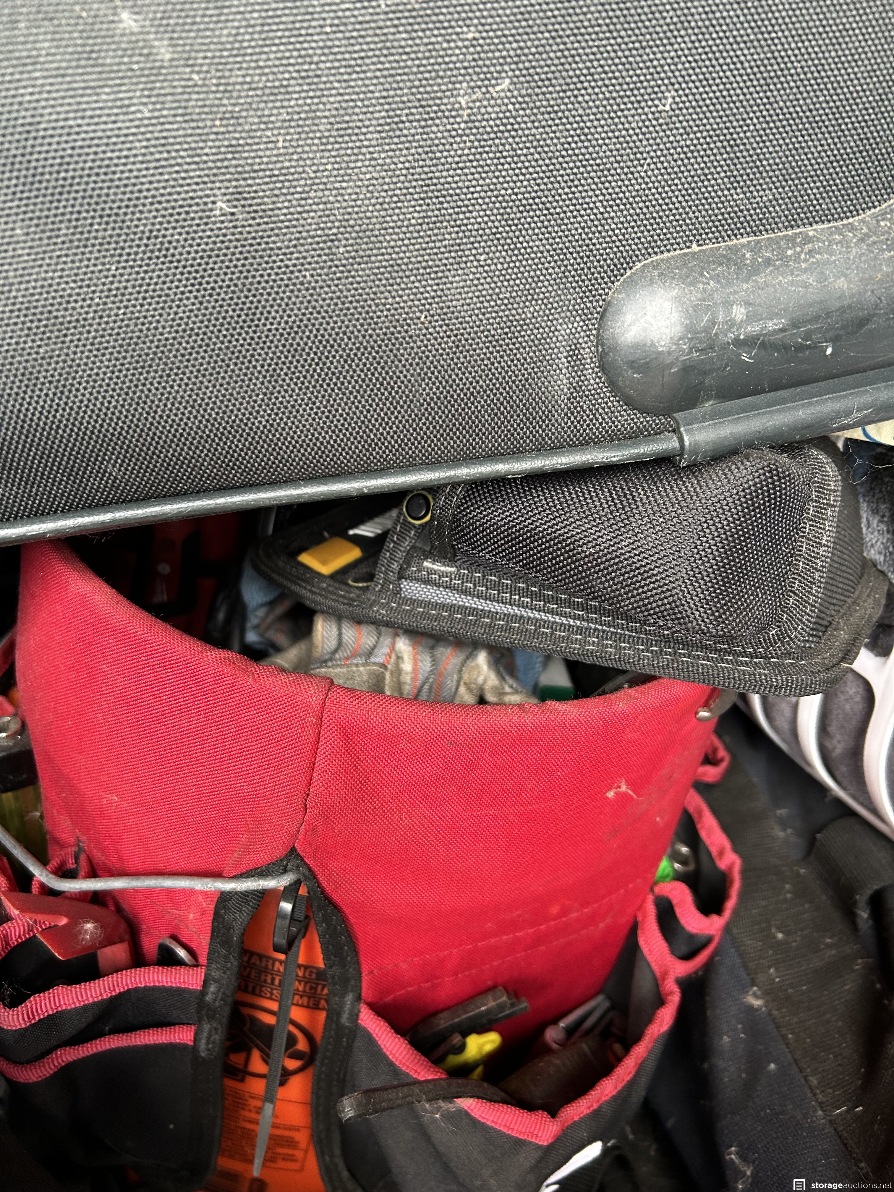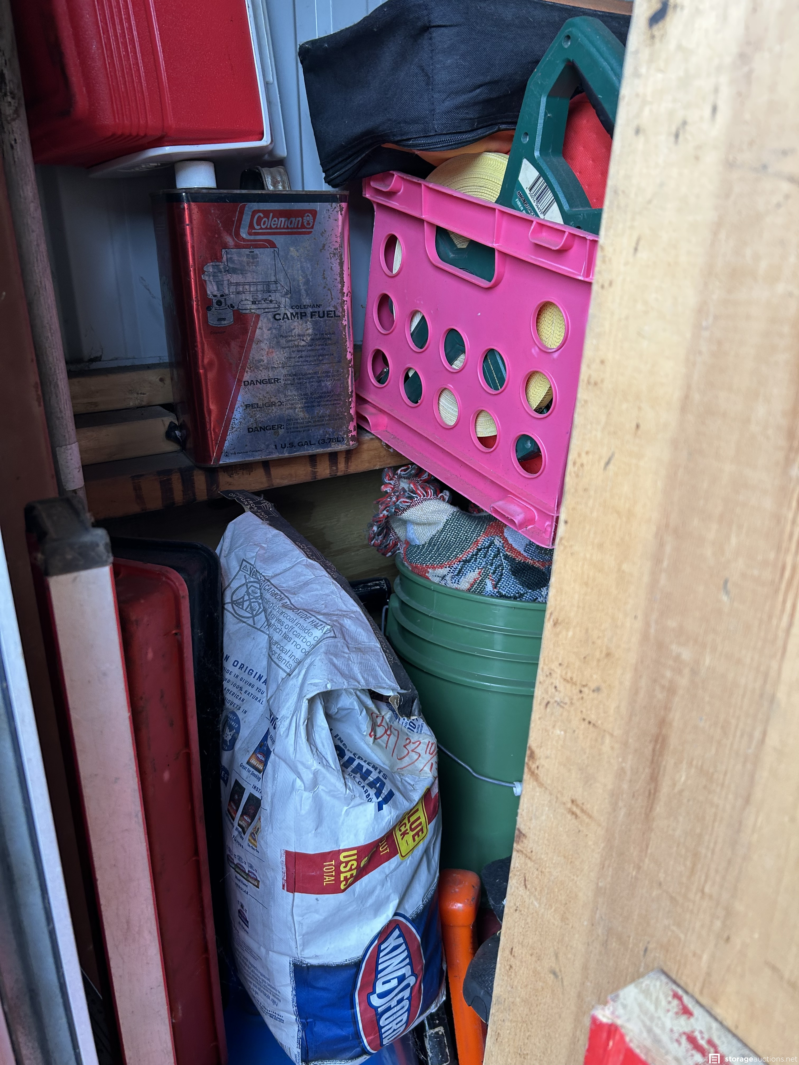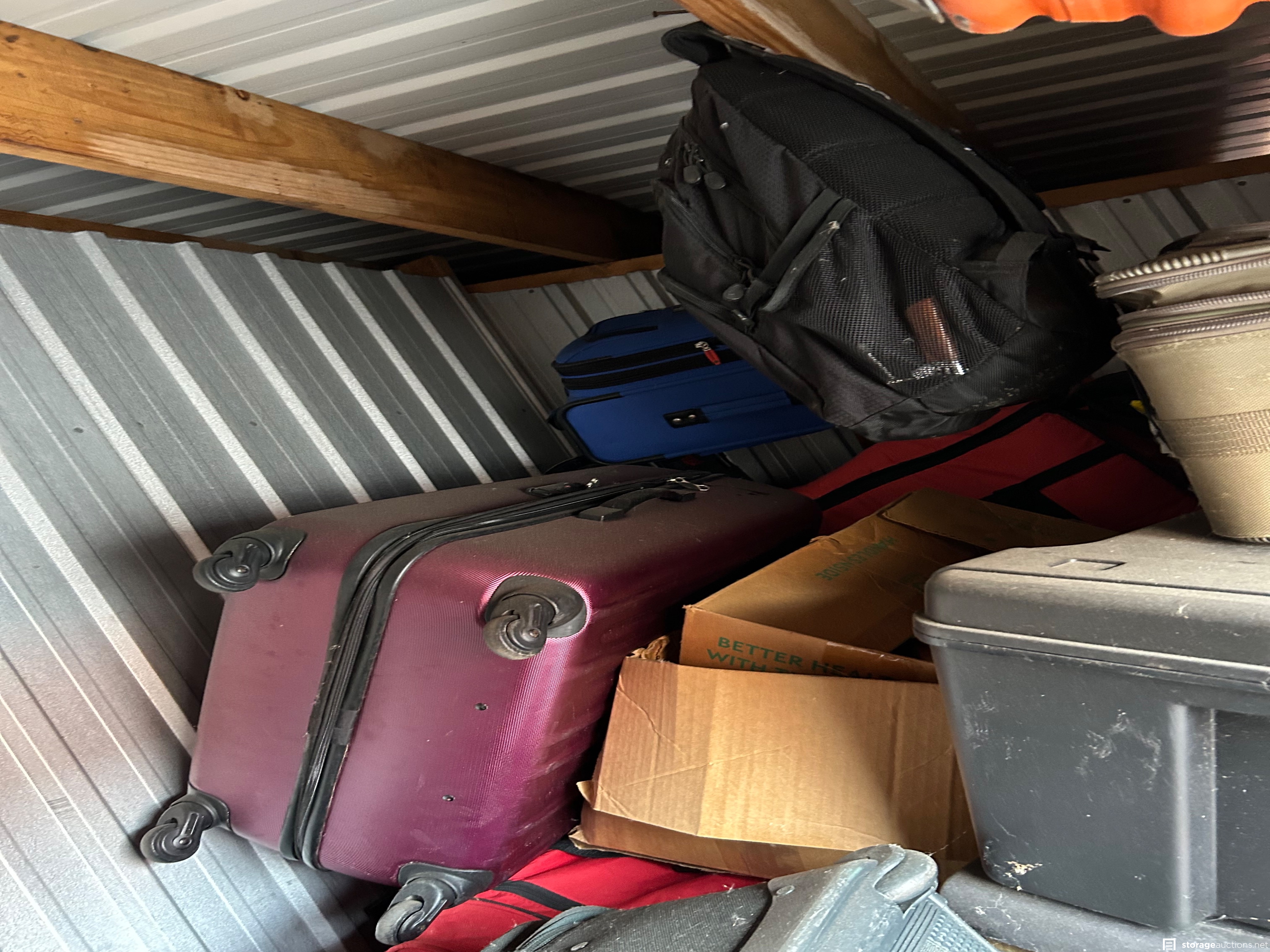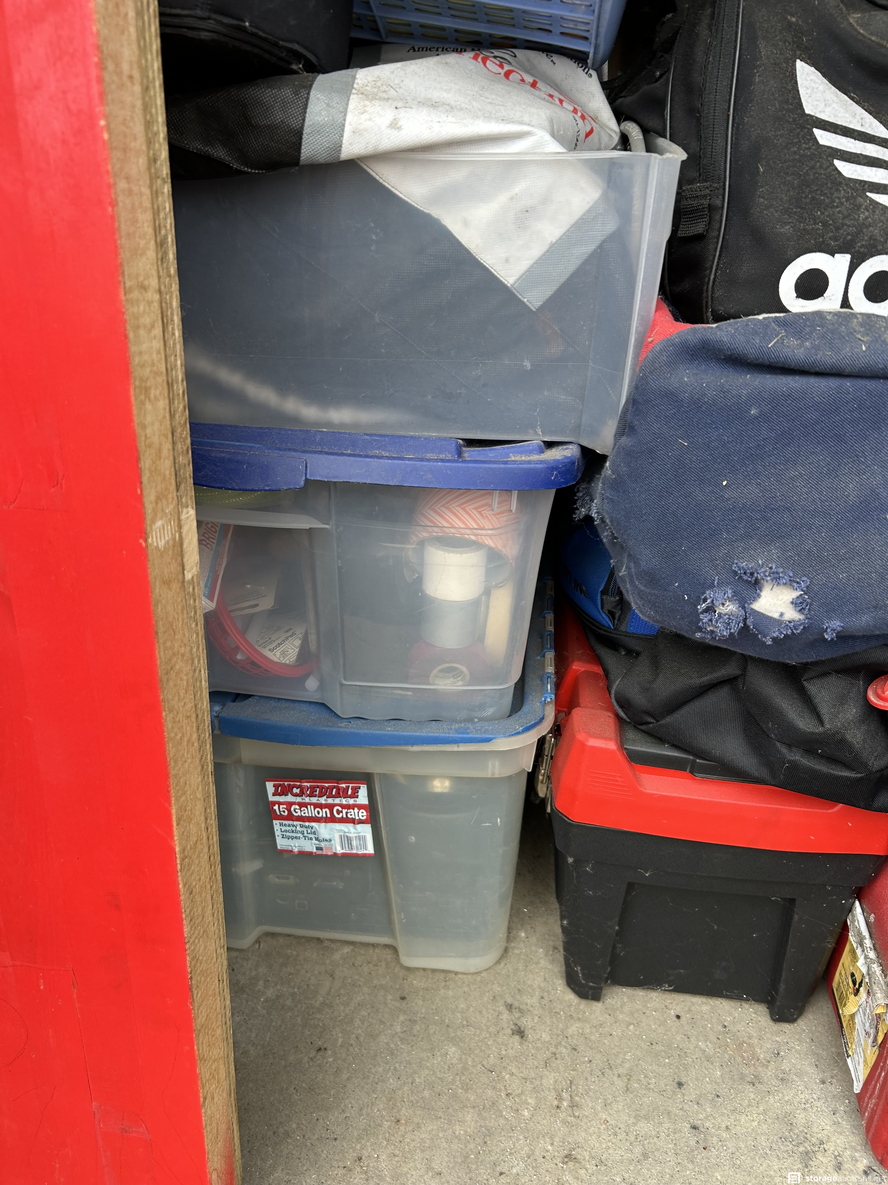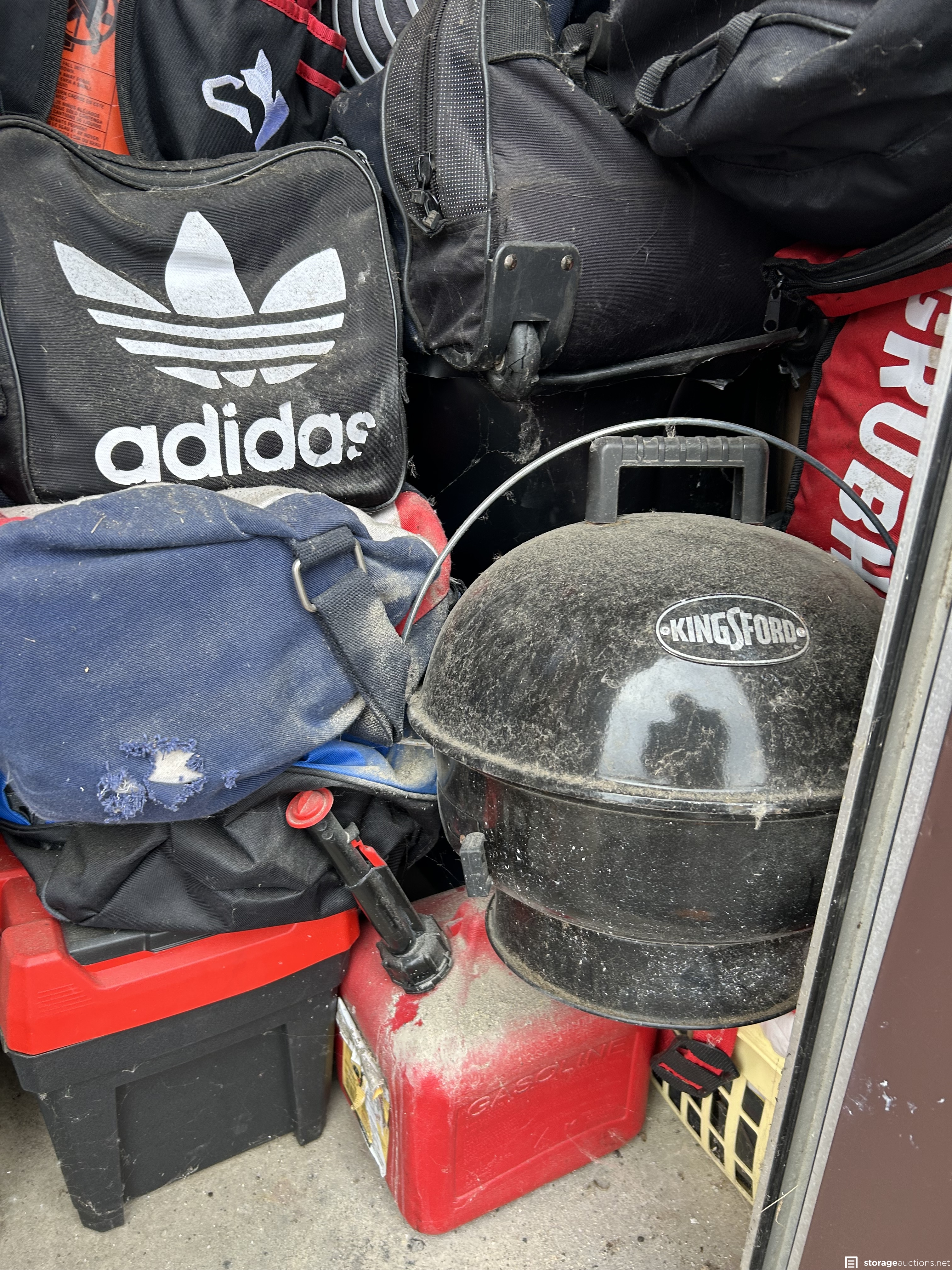 This unit appears to contain duffle bags, luggage, tools, tool bags tool bucket, tool boxes, rake, roof rake, bins, cases, work boots, shovel Denon receiver, charcoal and more