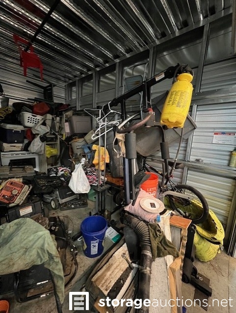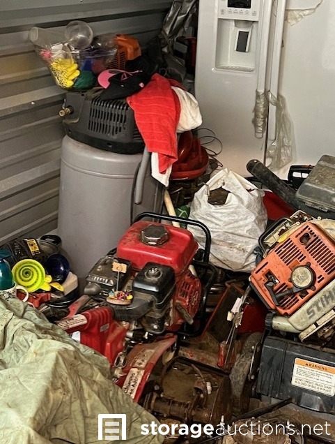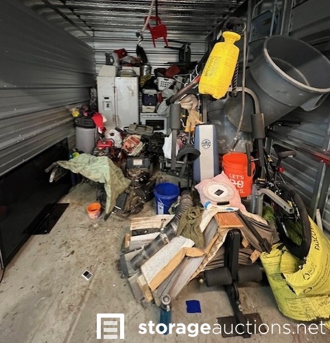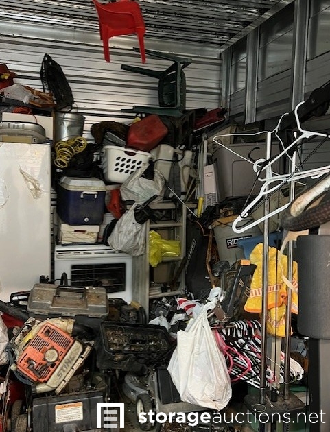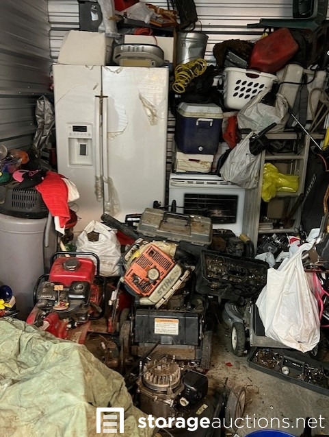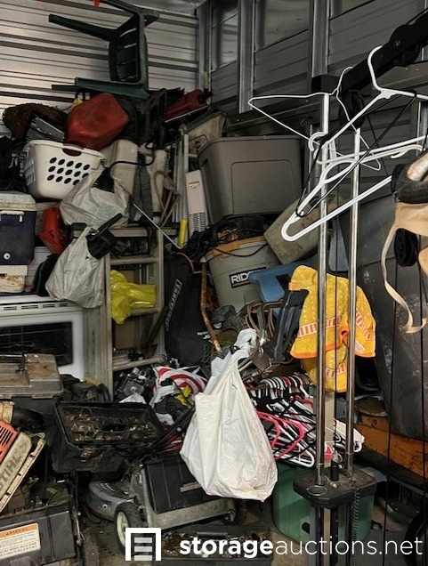 Unit appears to contain car parts, tools, electronics, shelves, appliances, bike parts, outdoors items, totes, boxes, and other items.