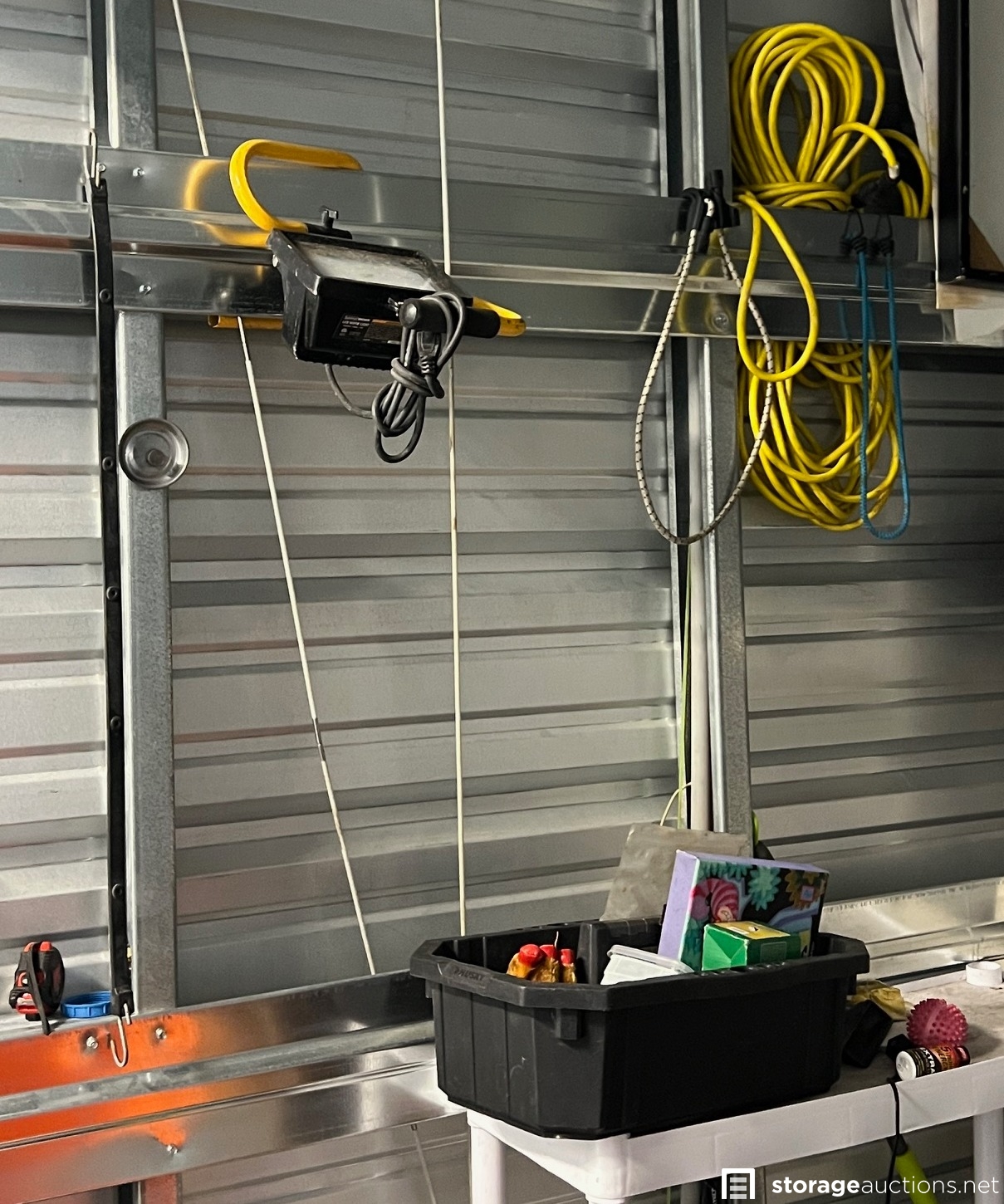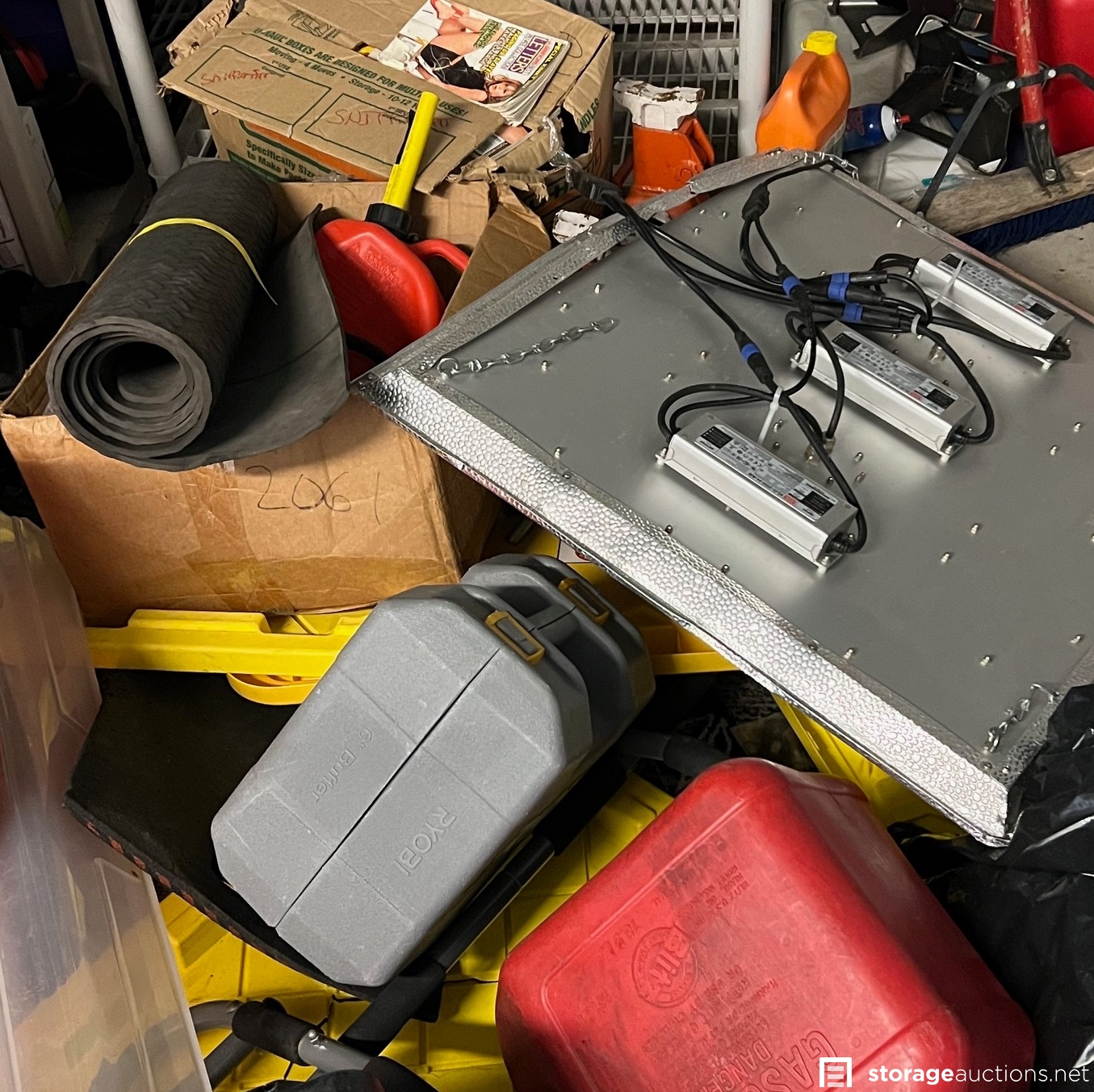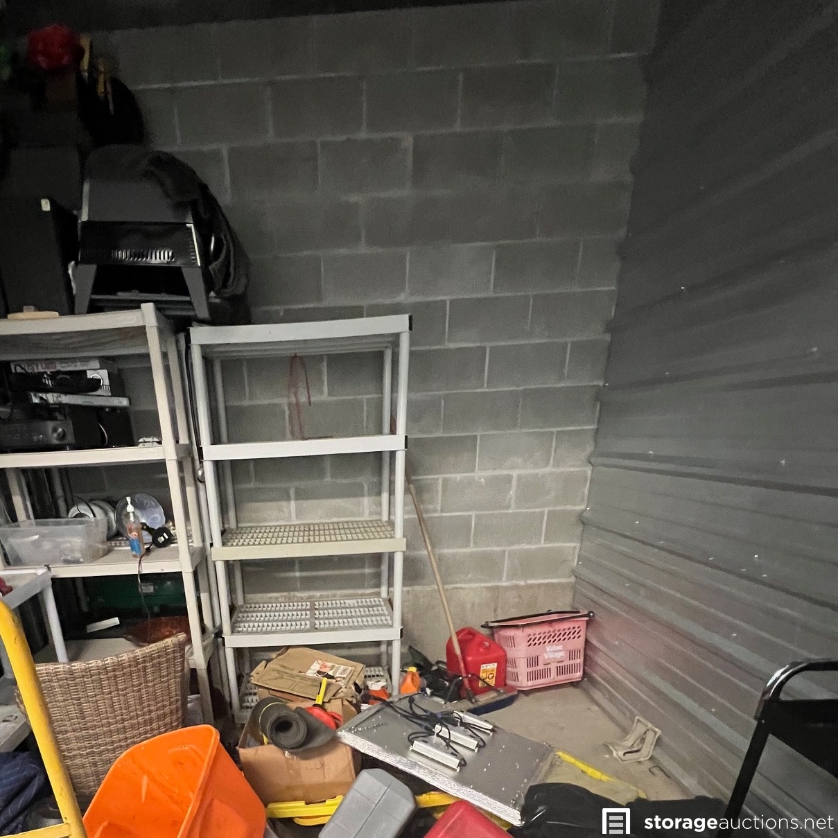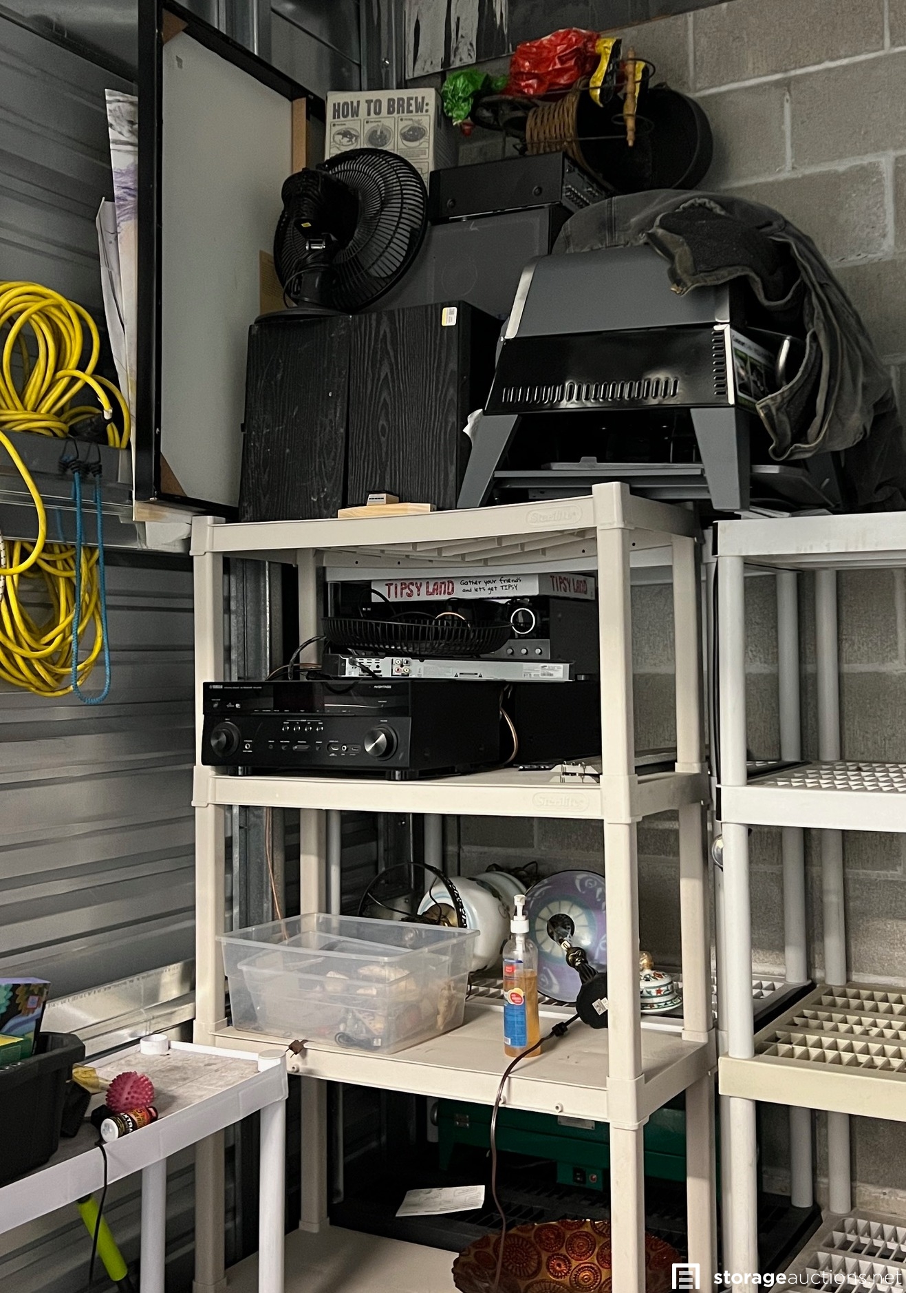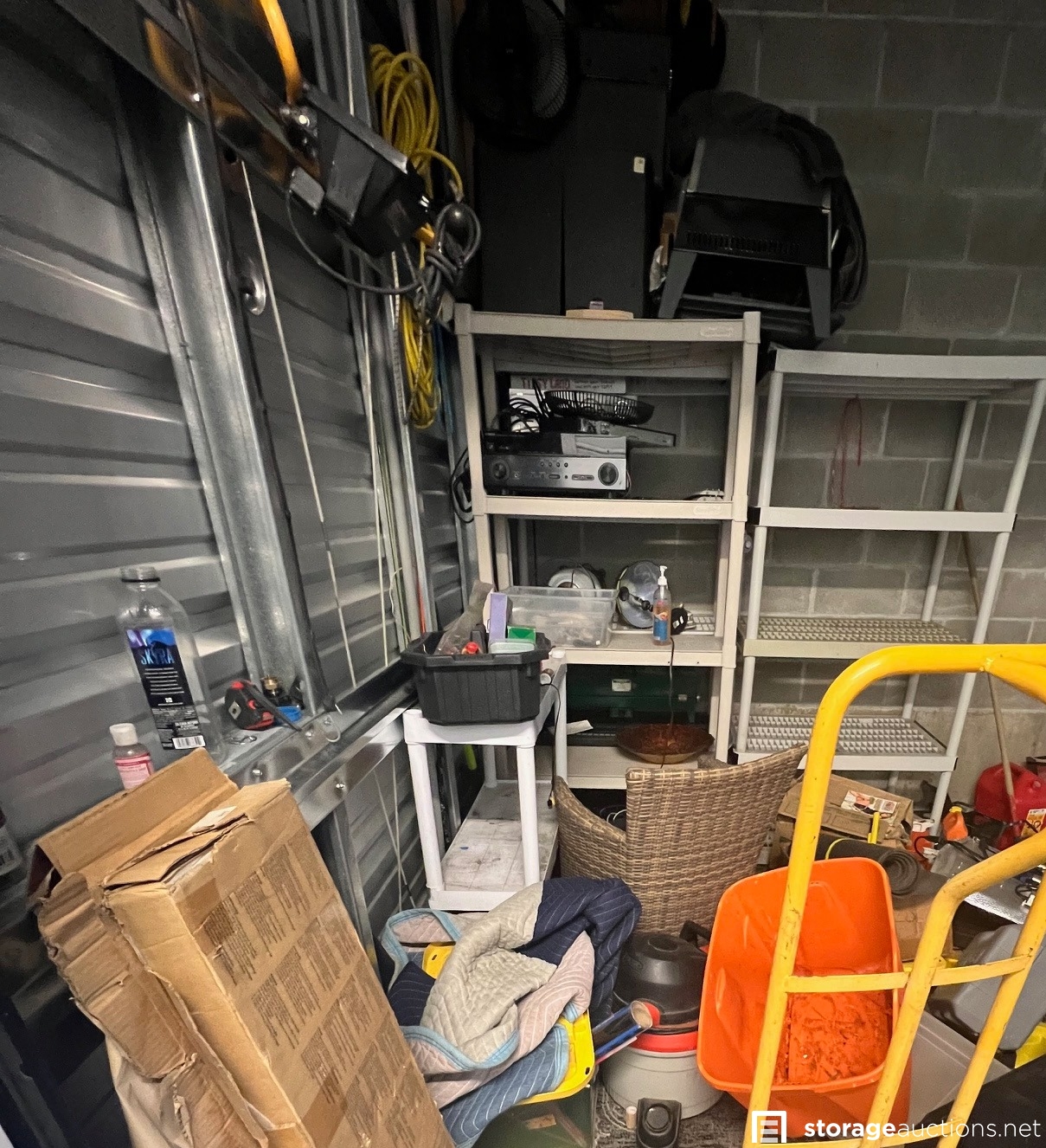 Unit appears to contain totes, bedding, tools, shelves, electronics, boxes, games, and pictures.