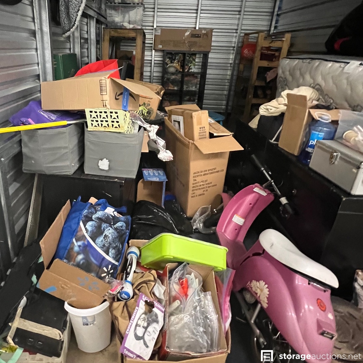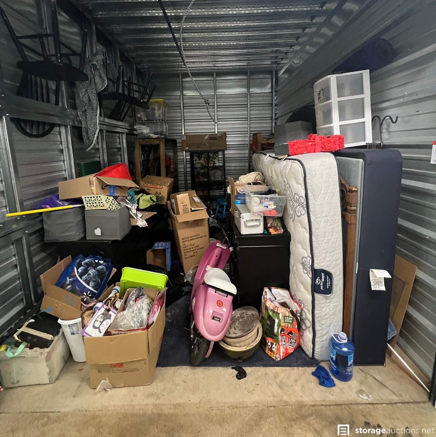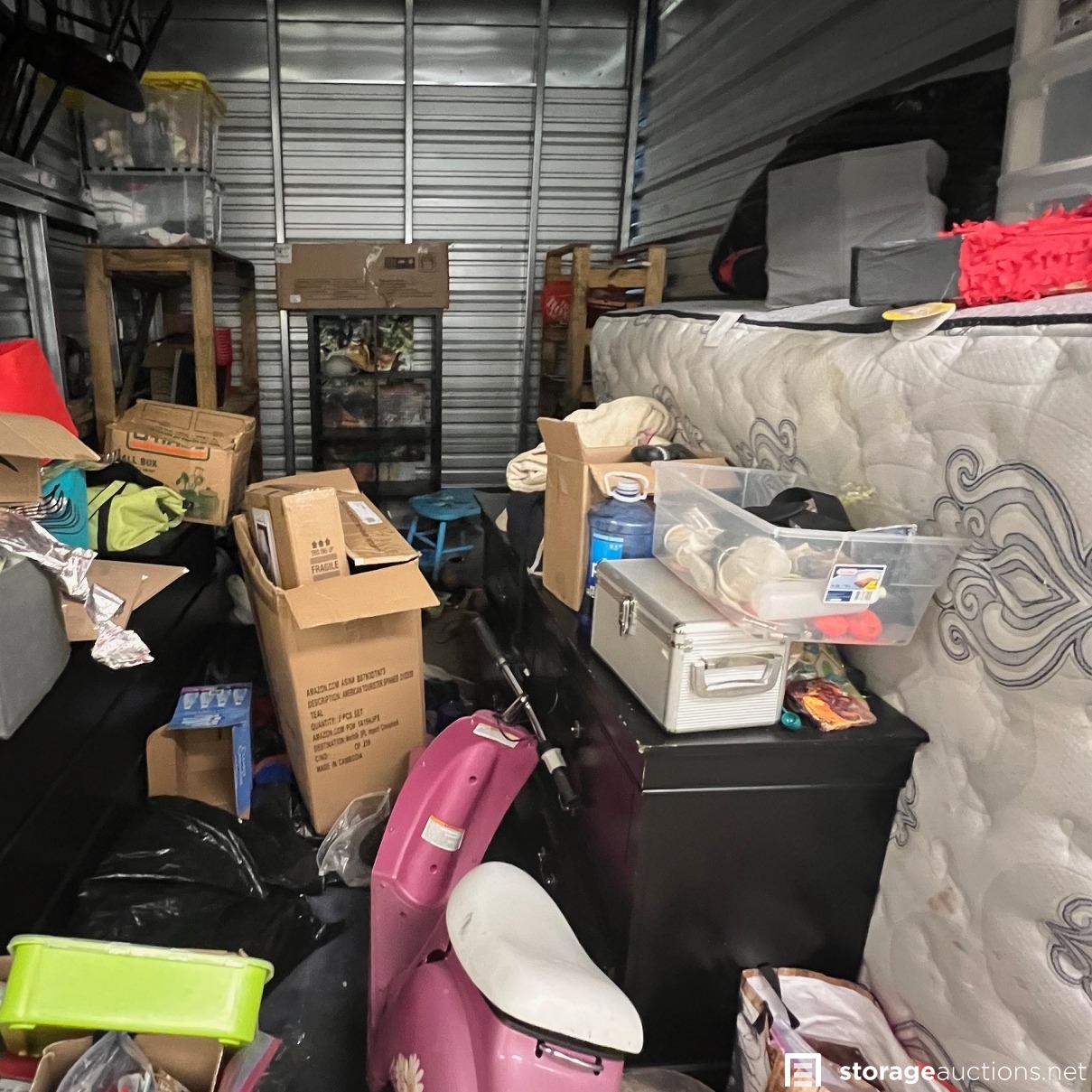 Unit appears to contain boxes, totes, furniture, electronics, toys, clothes, personal items, shelves, a scooter and other items.