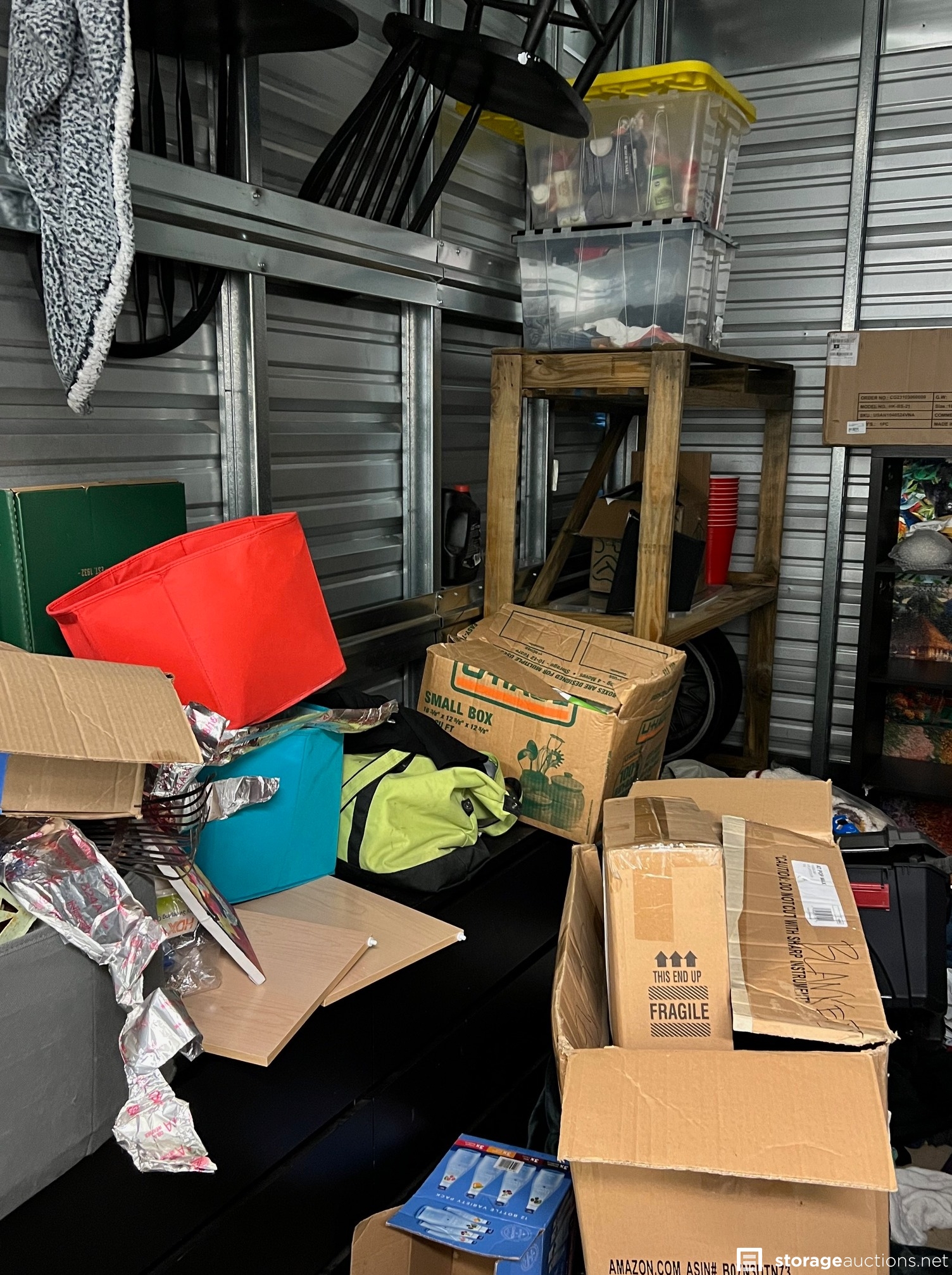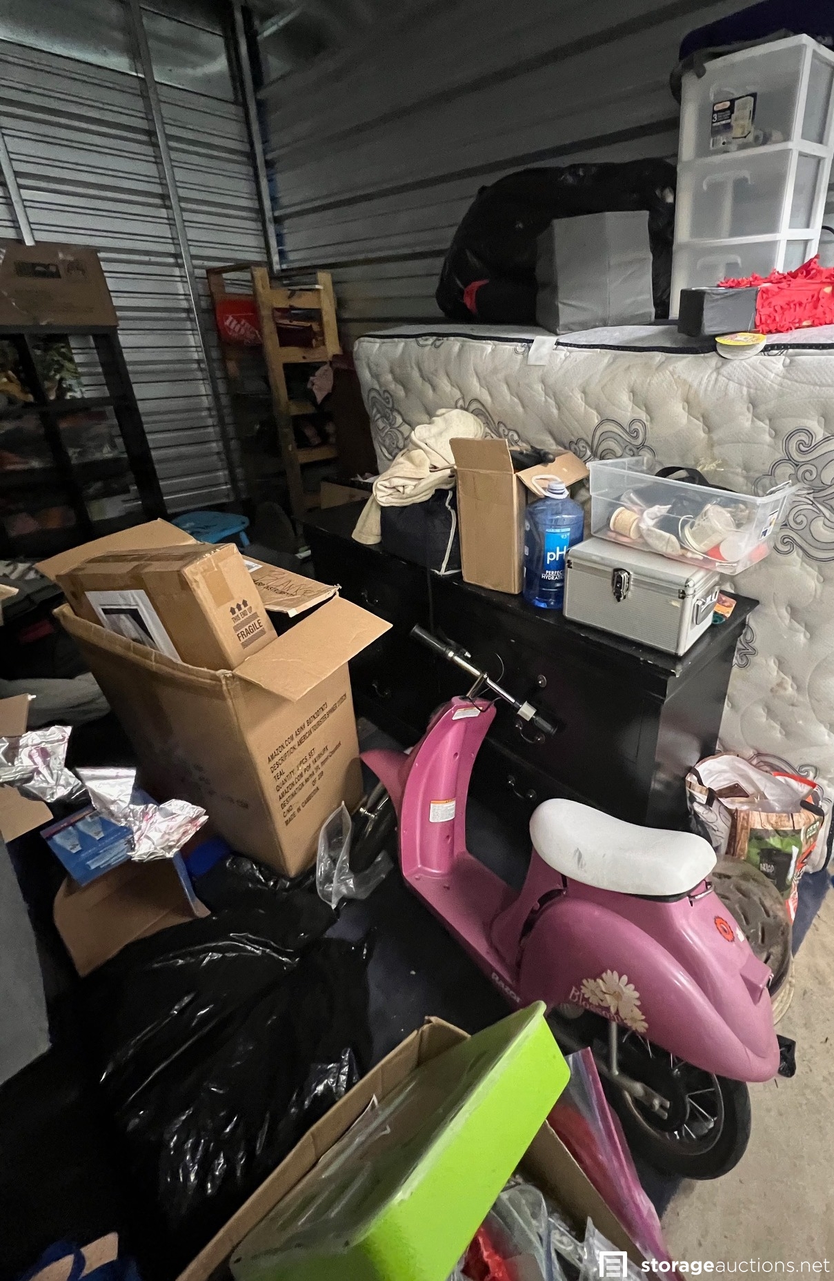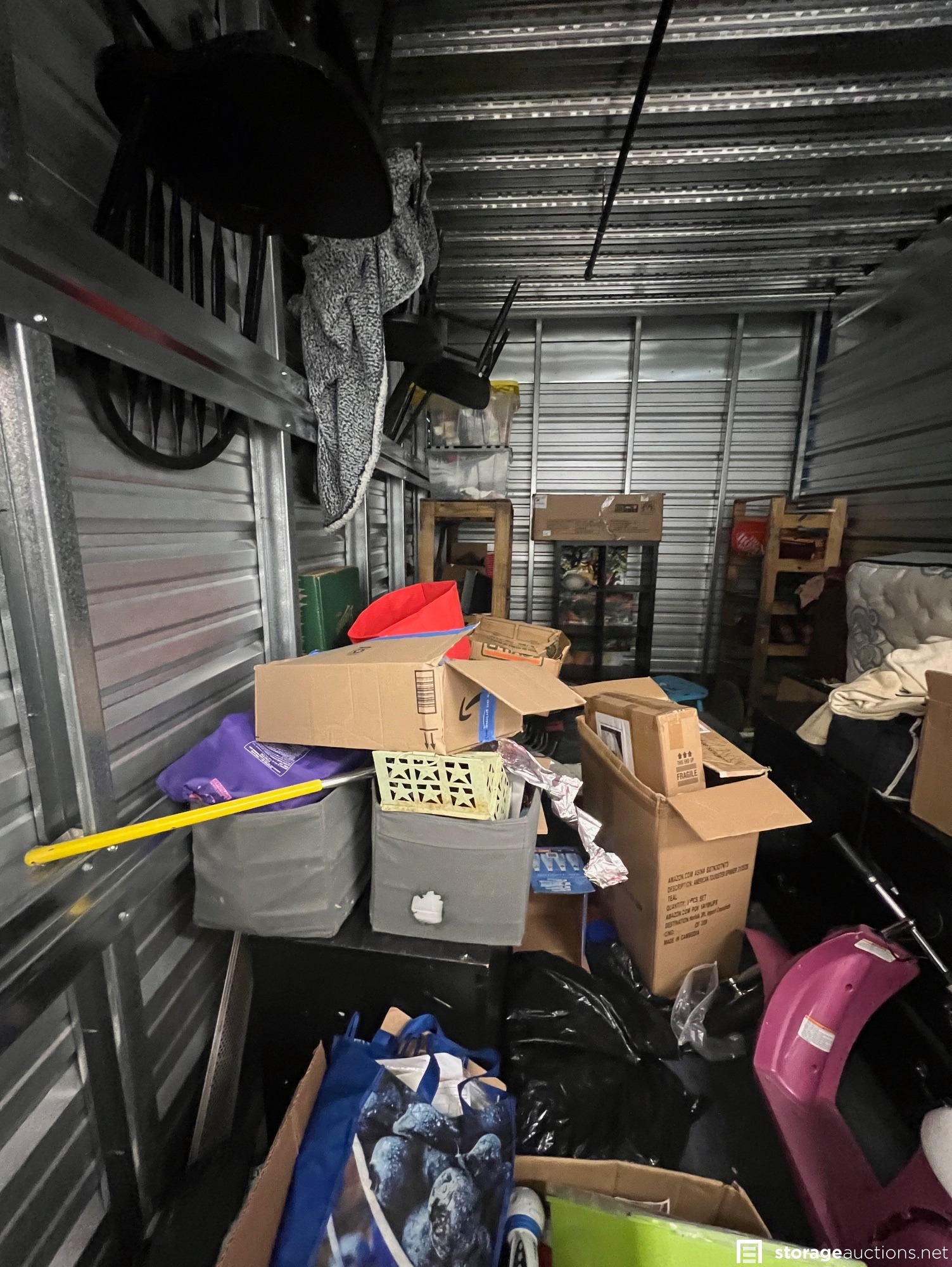 Unit appears to contain boxes, totes, furniture, electronics, toys, clothes, personal items, shelves, a scooter and other items.