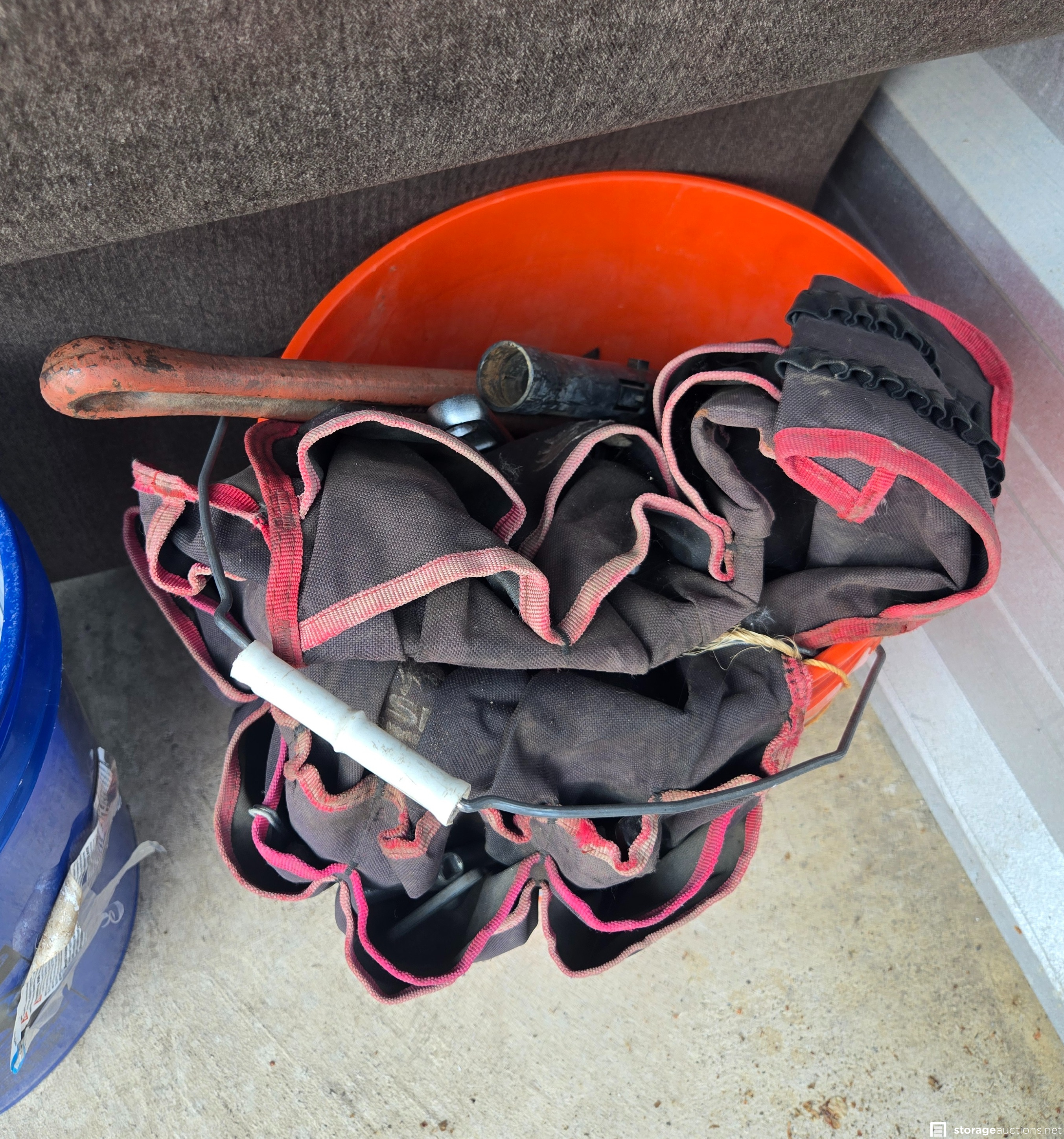 Tools, tool belt, love seat, couch, clothes, work clothes, work boots, etc.