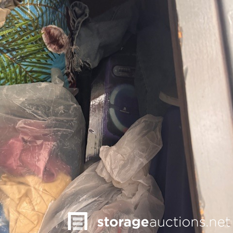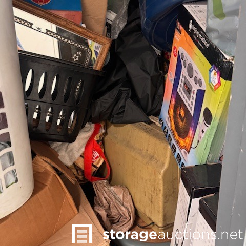 This unit appears to contain, 15+ boxes, clothing, bedding, suitcase, guitars, sewing machine, gas can, hamper, stool, skateboards, speaker, fan, wall art, mirror, misc items.