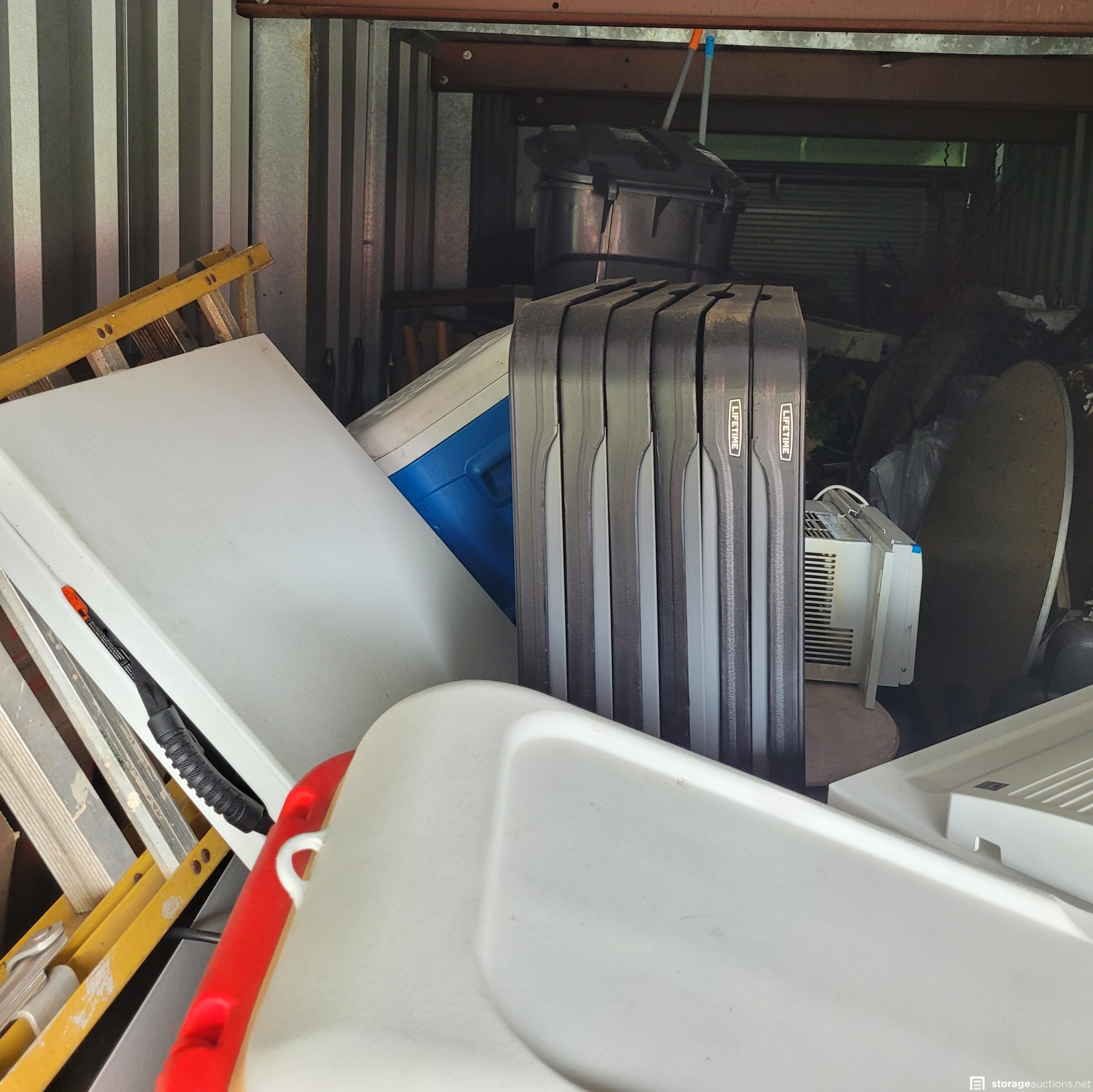 Chairs, Speakers, Fire Mantle, Propane Tank, Tables, Ladder, Boxes