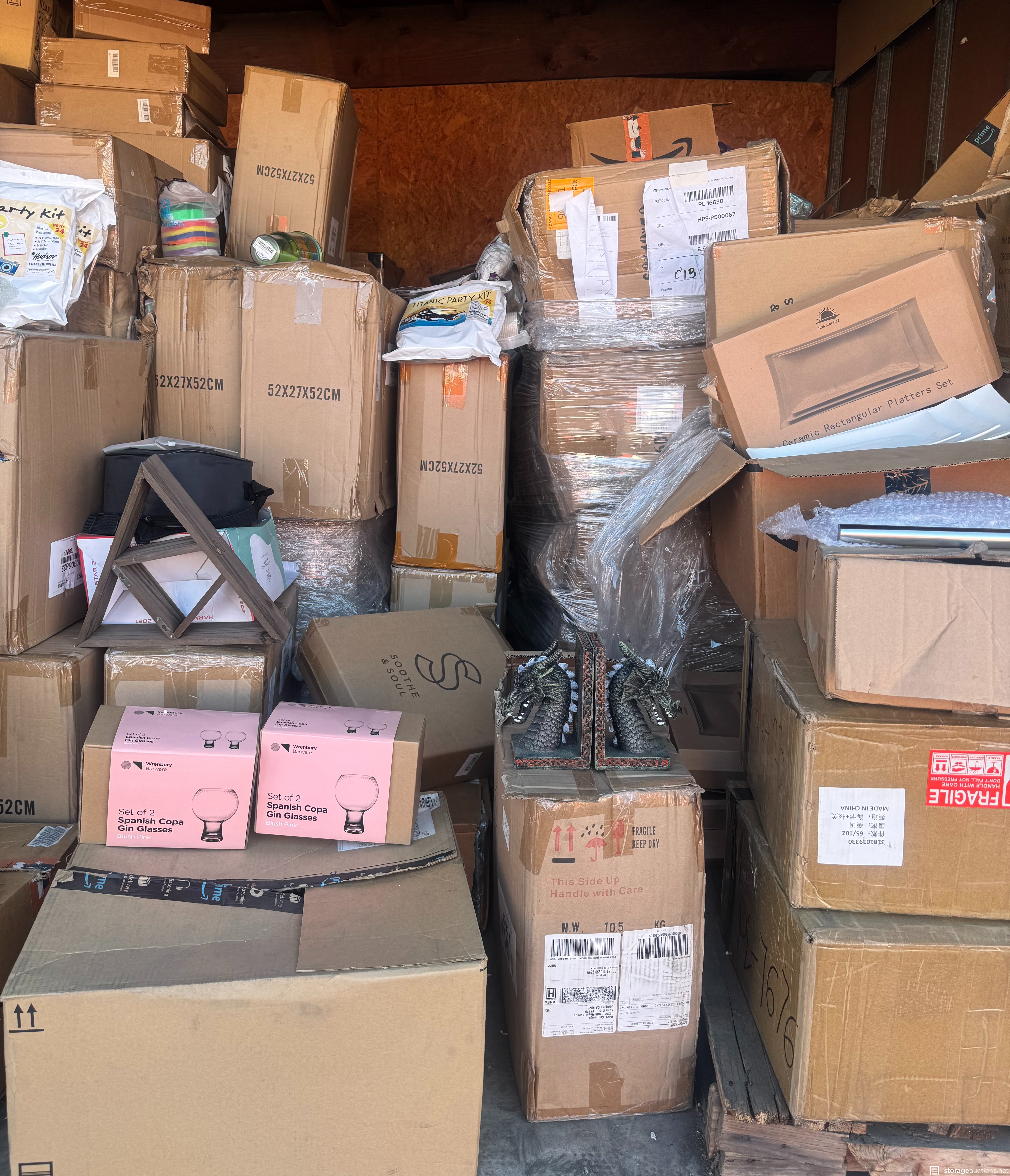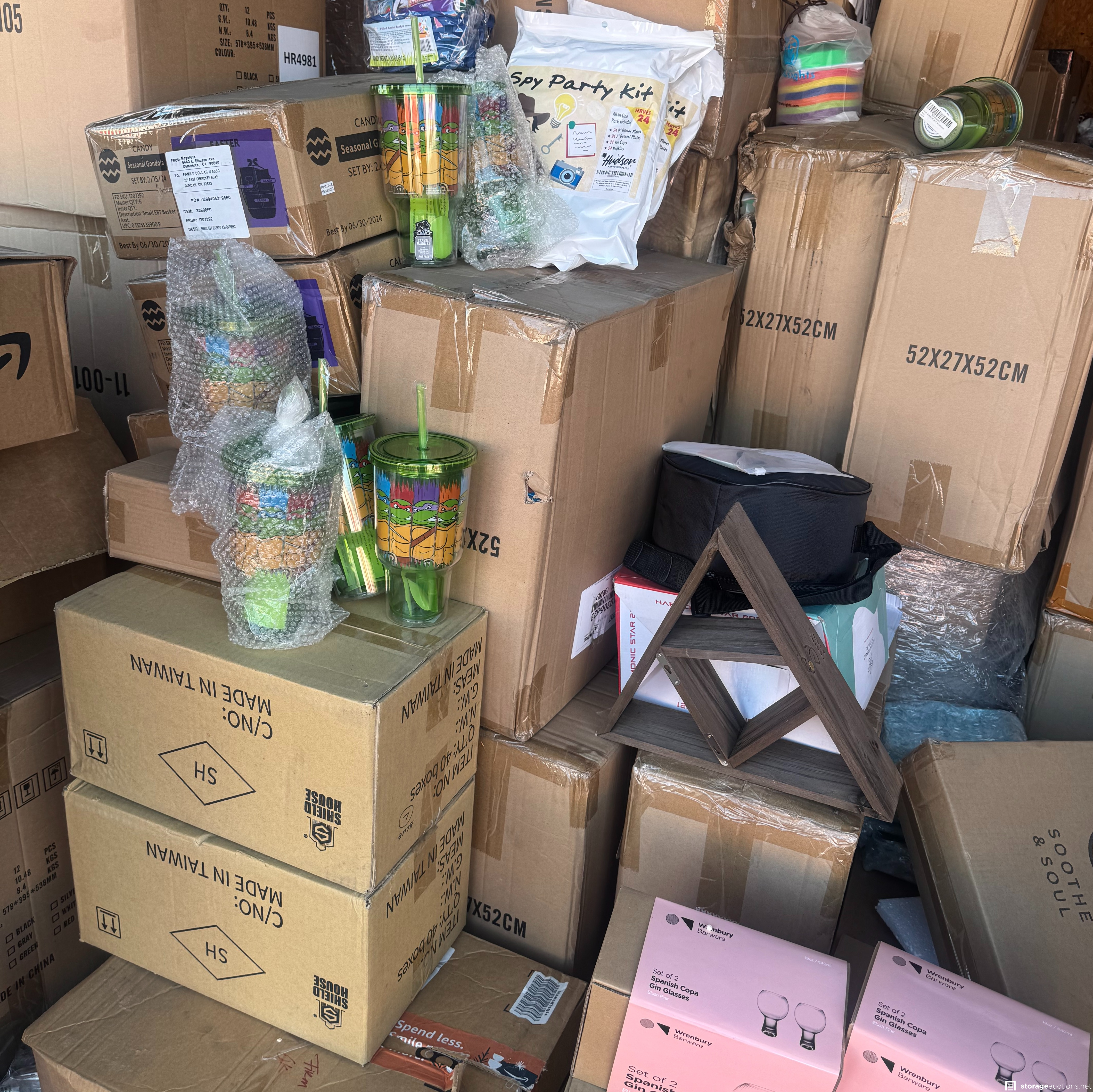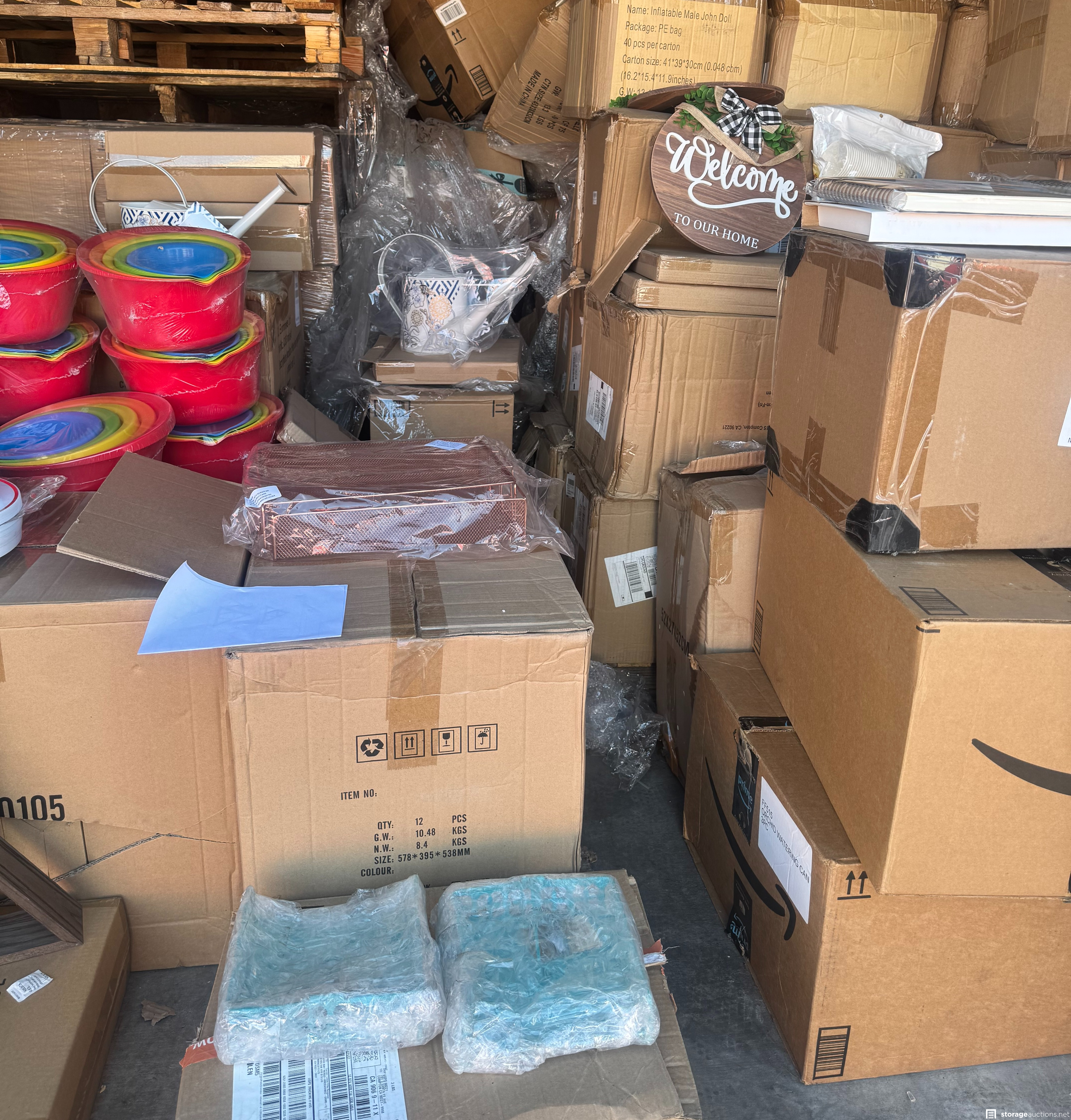House hold items, Cases of Gin glasses, Wall decorative shelves, Cases of Dragon Bookends, Cases of Ceramic Platter sets, Party supply sets of all kinds, Cases of Drink tumblers, Cases of office supplies, cases of Mixing bowl sets, Plates, Oil burners and palettes with boxes of goods