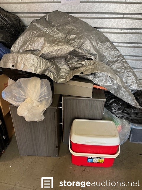 Boxes, 2 nightstands, ice chest, luggage, plastic bags, shoe boxes.