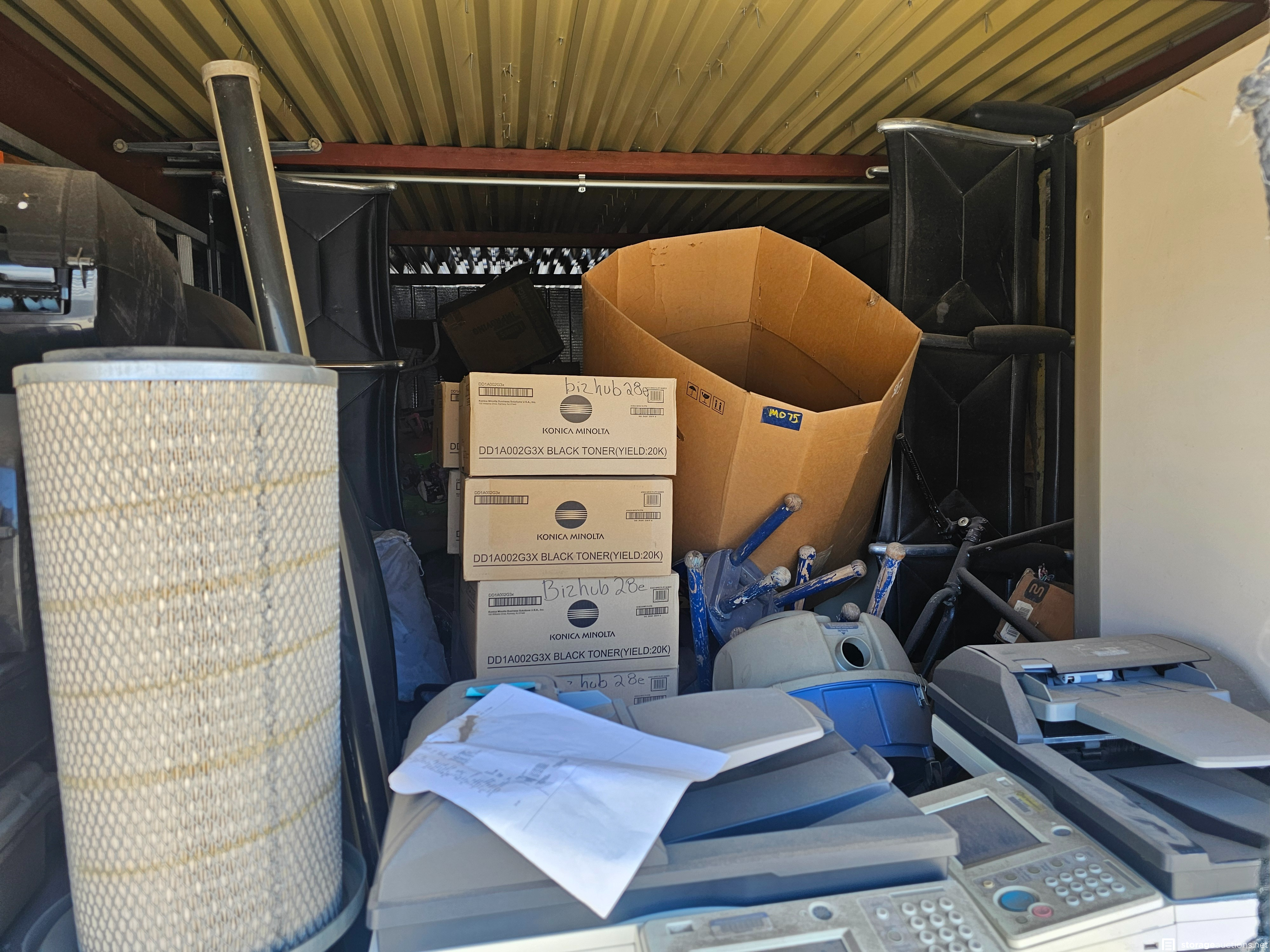 printers, boxes, metal cart with wheels.bench chair, shelves,office furniture