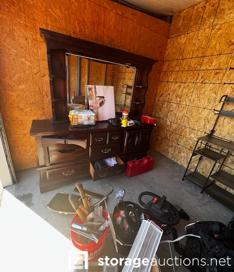 Wooden Dresser with Mirror, Gardening tools, Shop Vac