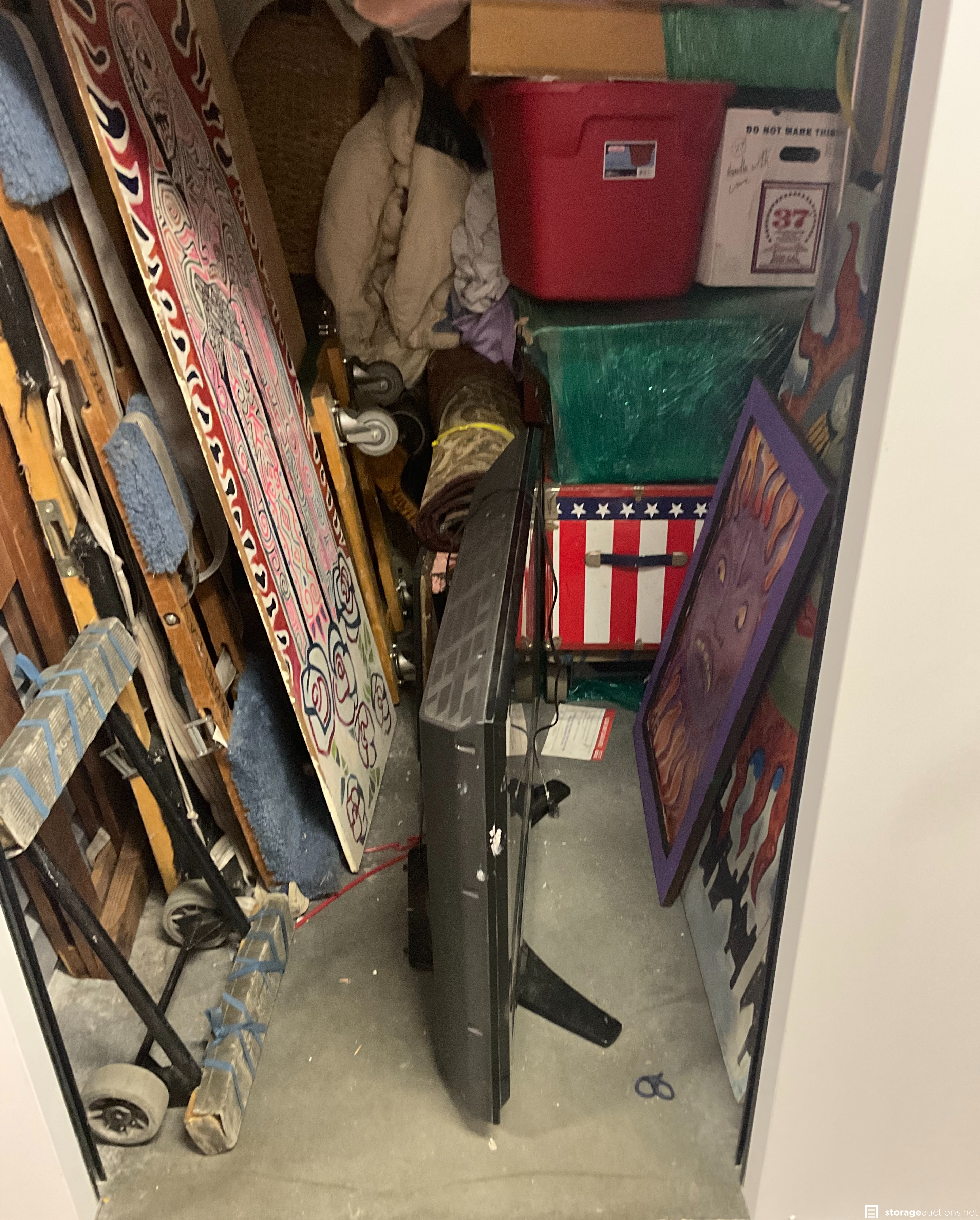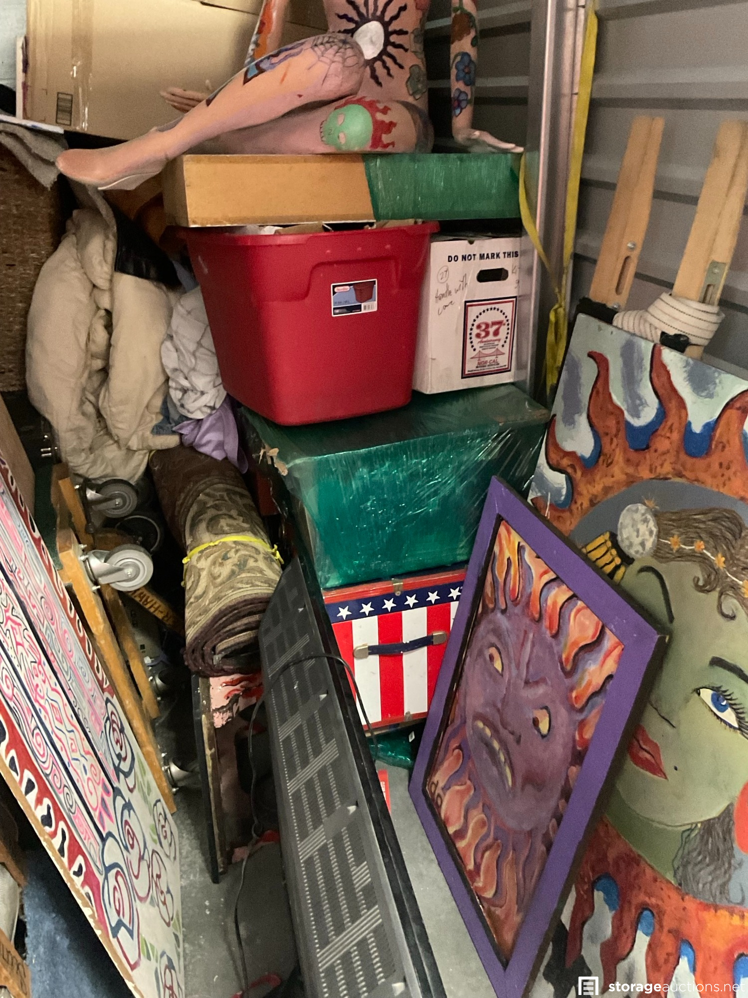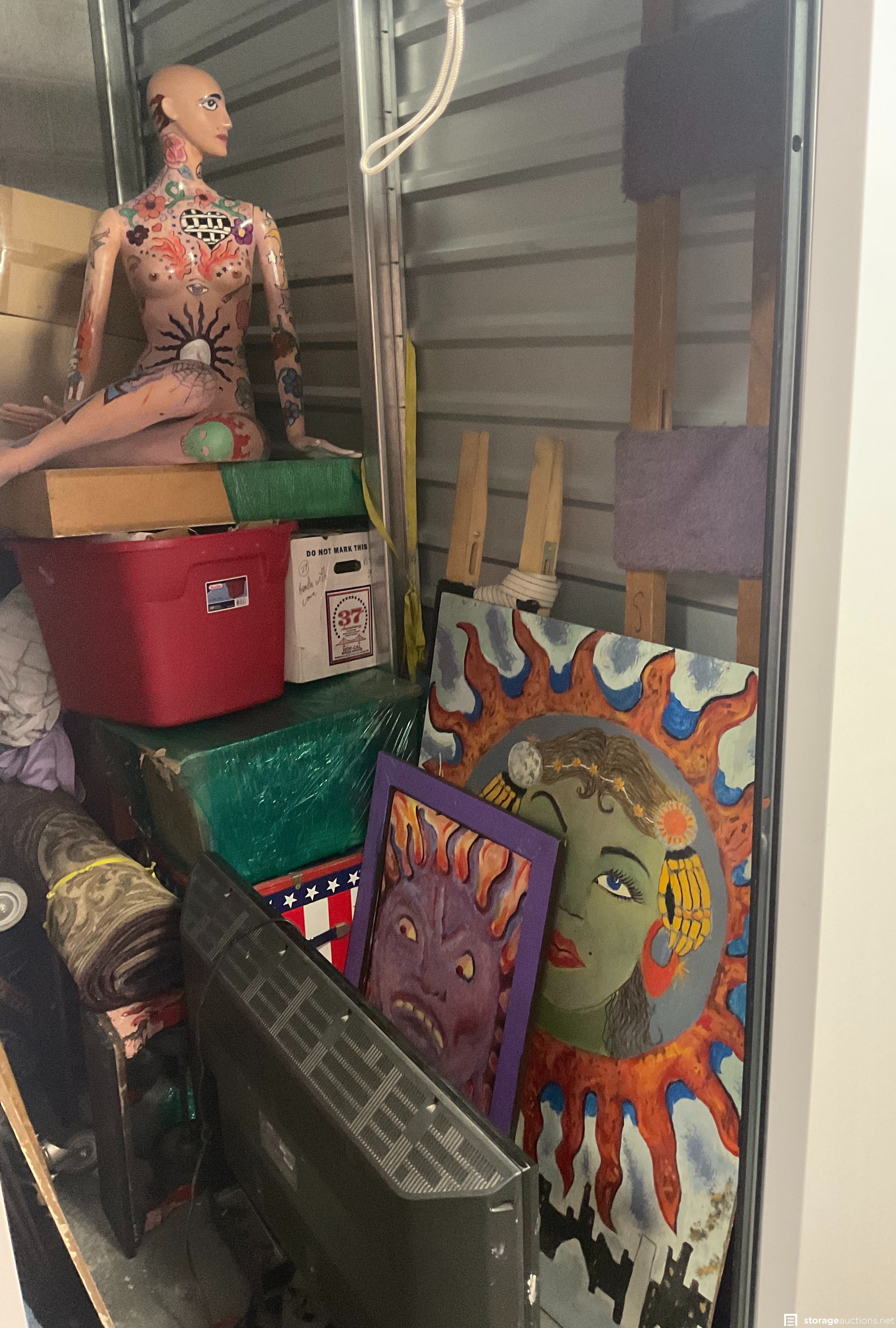 TV, wall art, mannequin, art easel, chest, plastic tubs, boxes