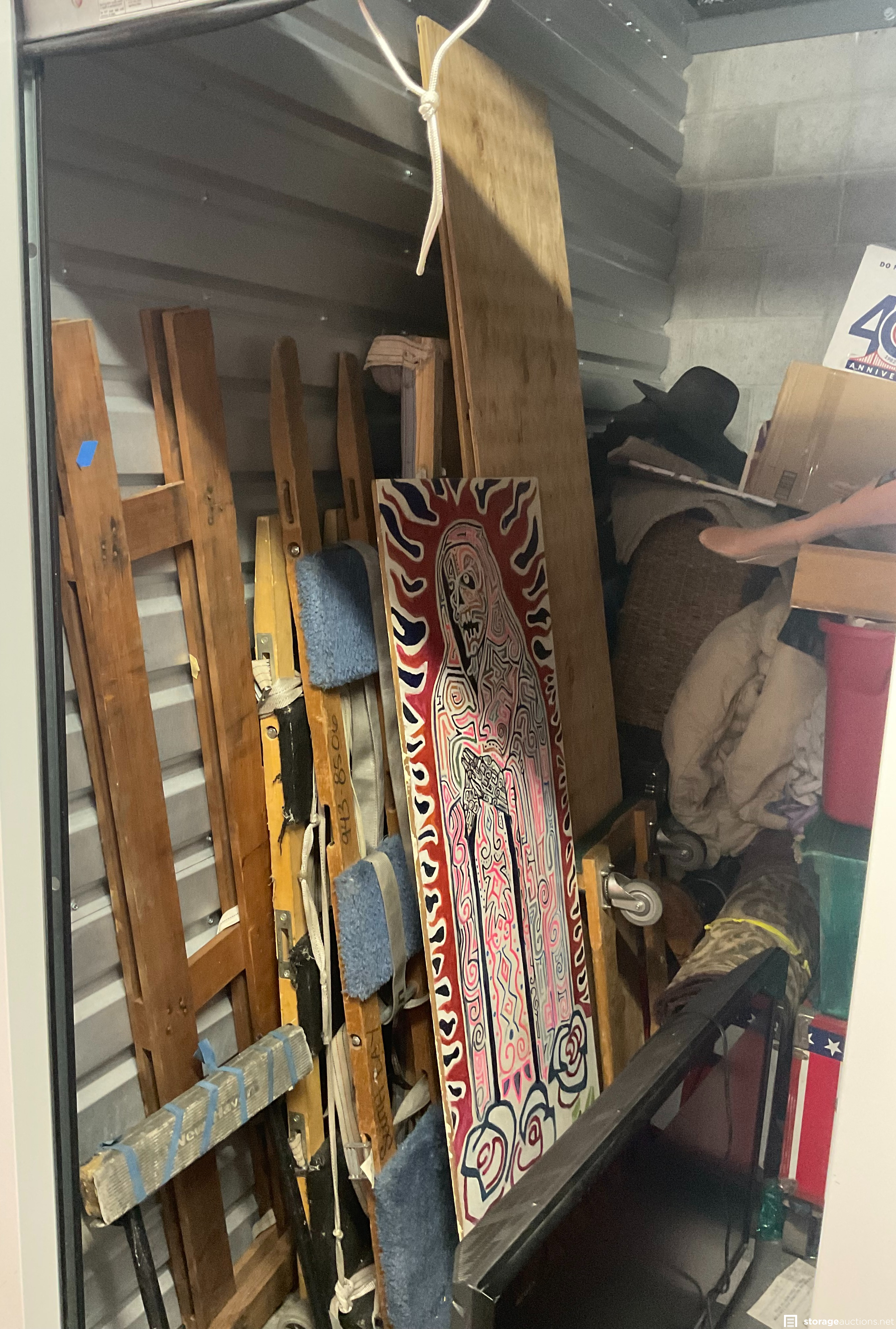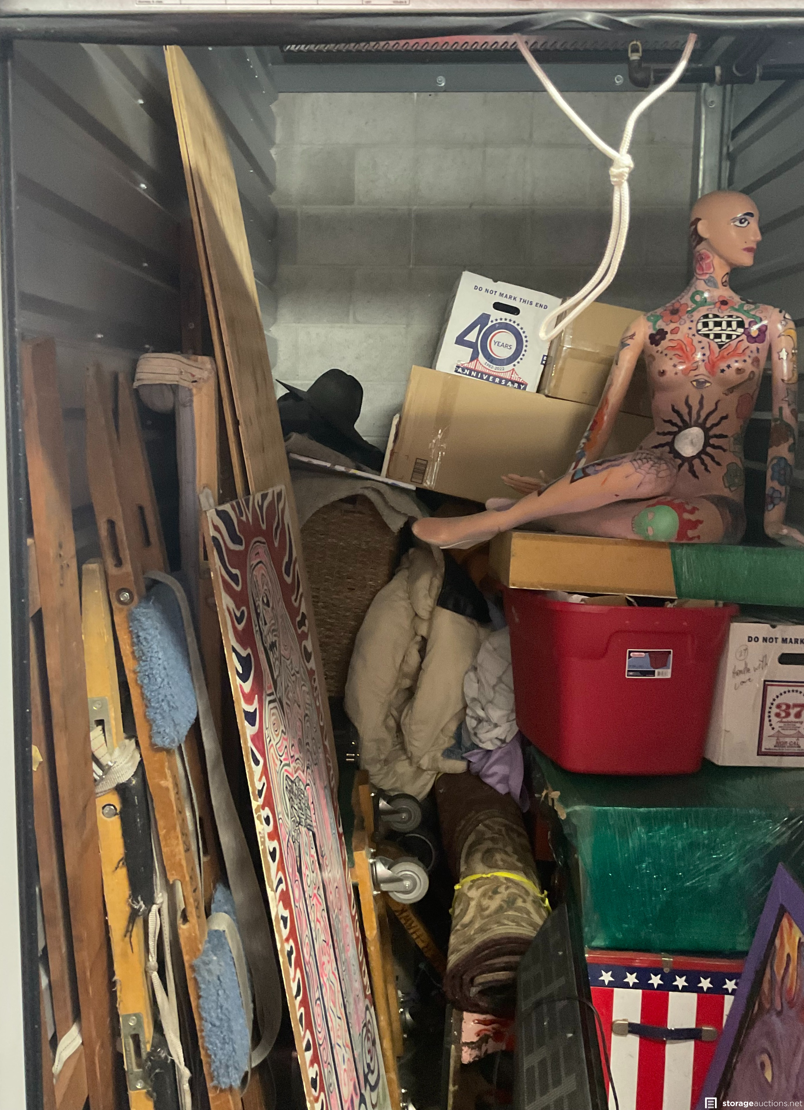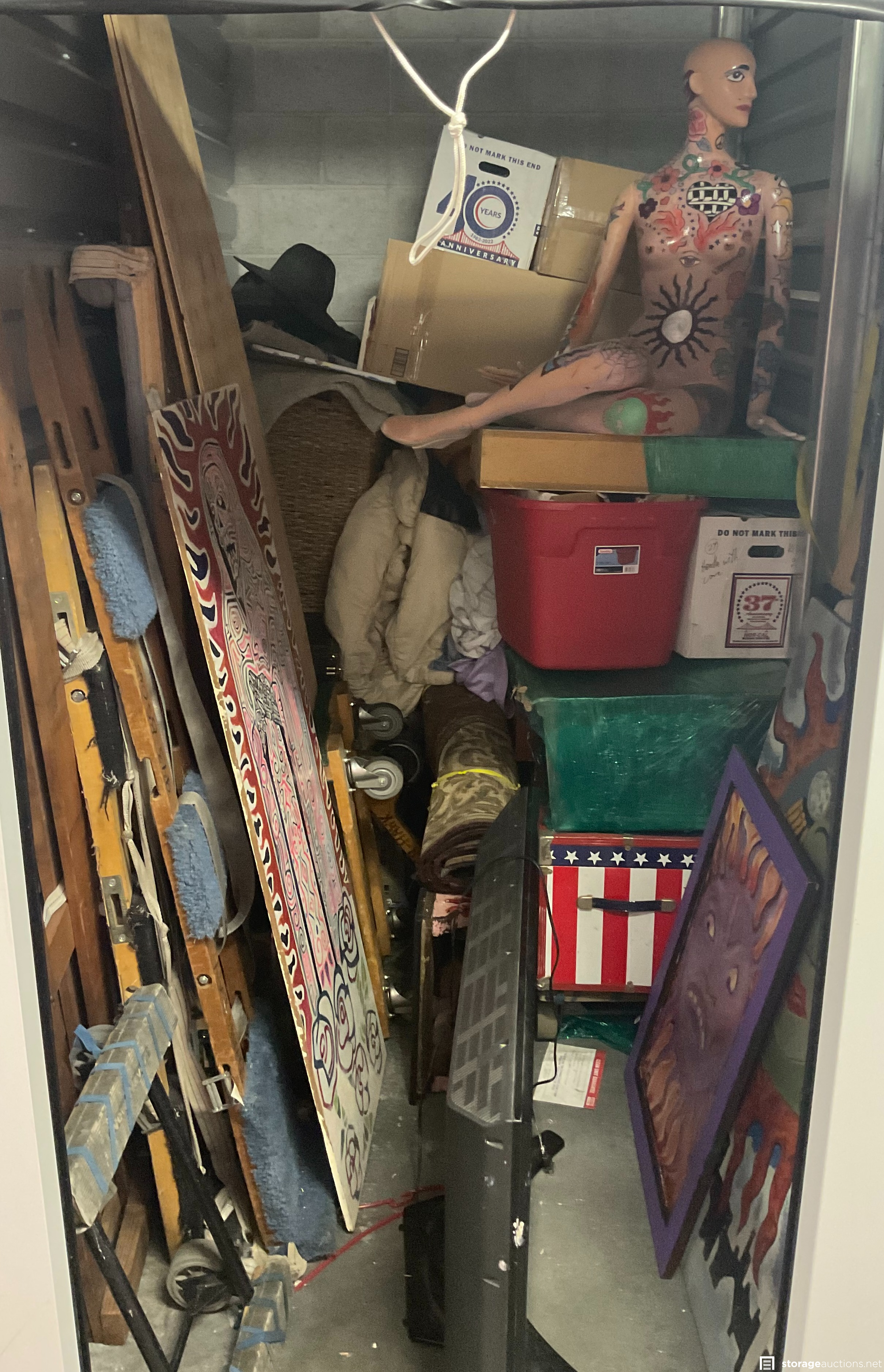 TV, wall art, mannequin, art easel, chest, plastic tubs, boxes