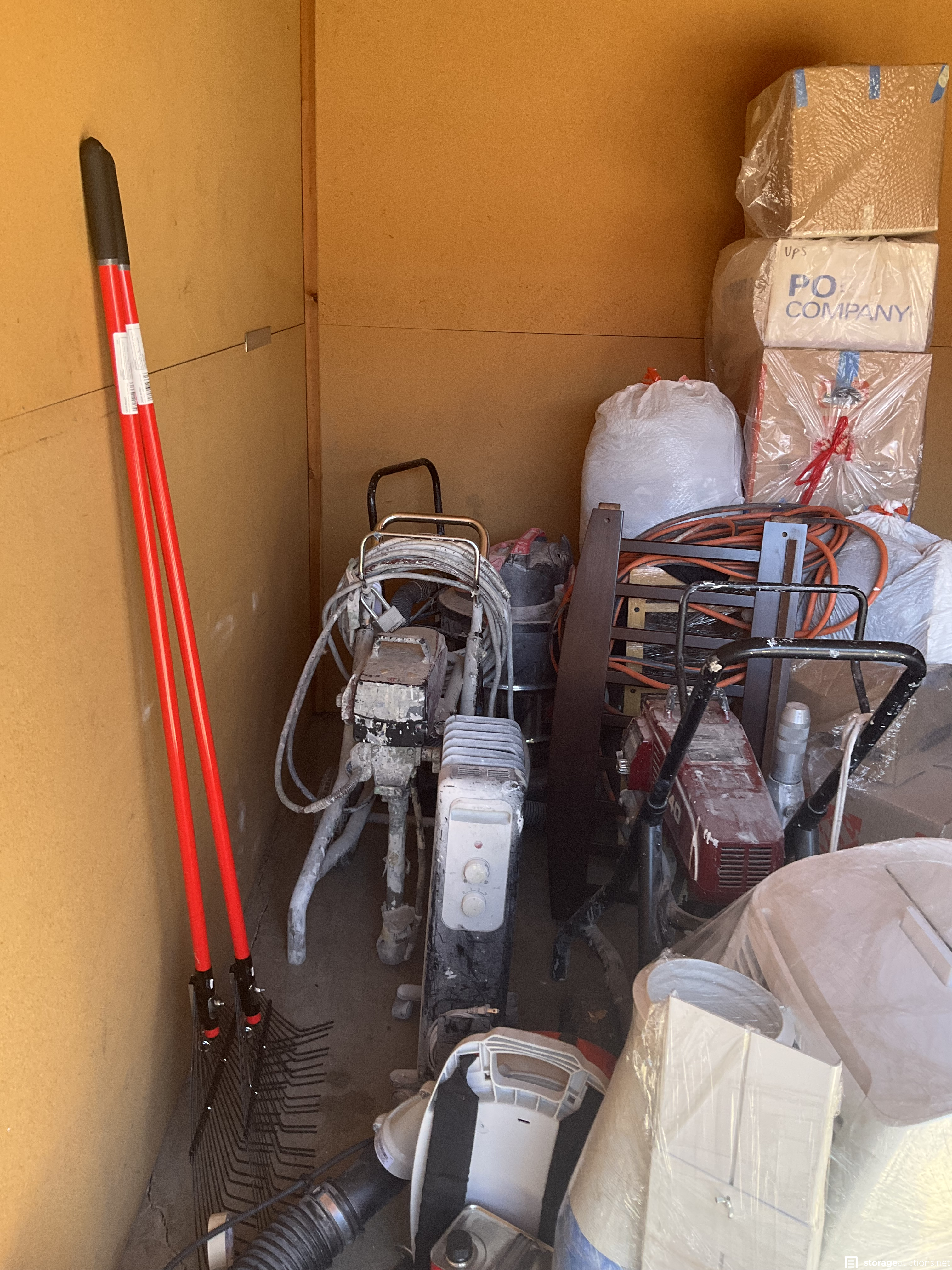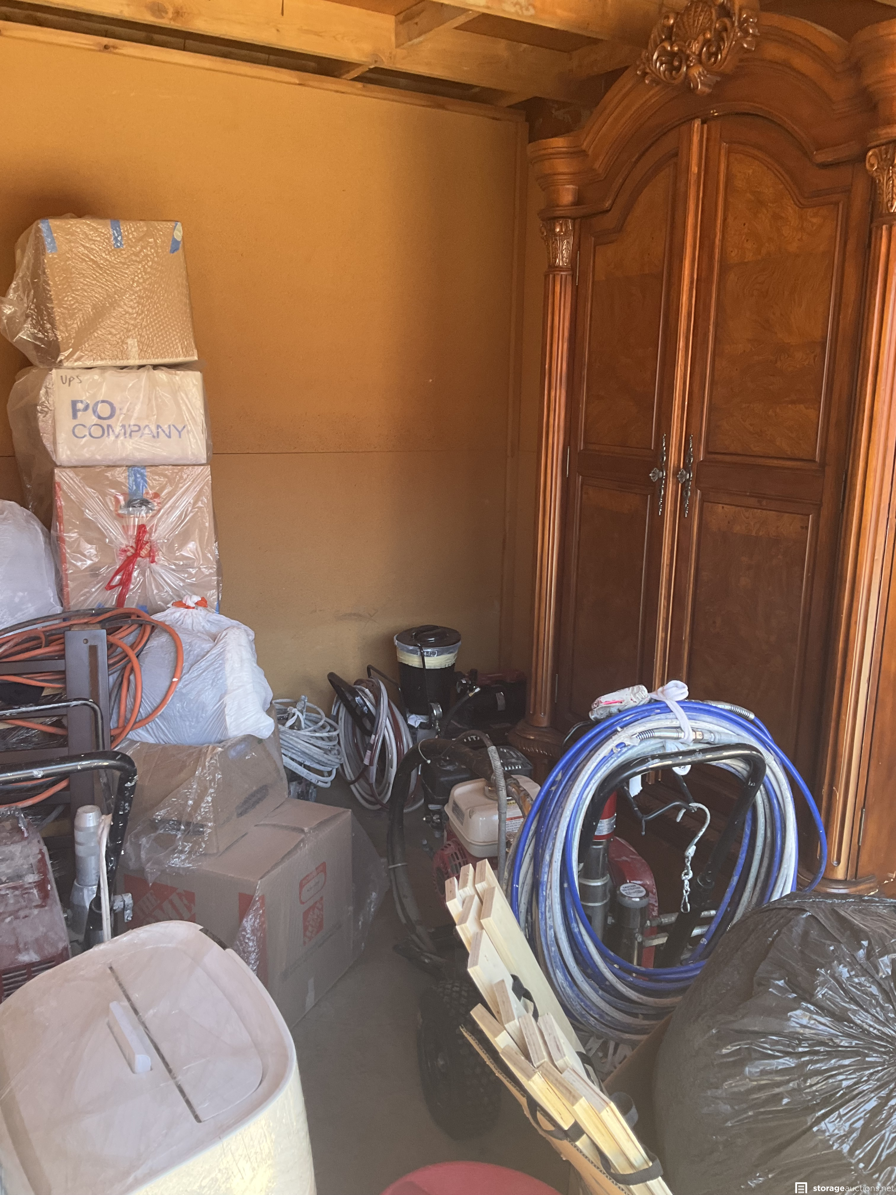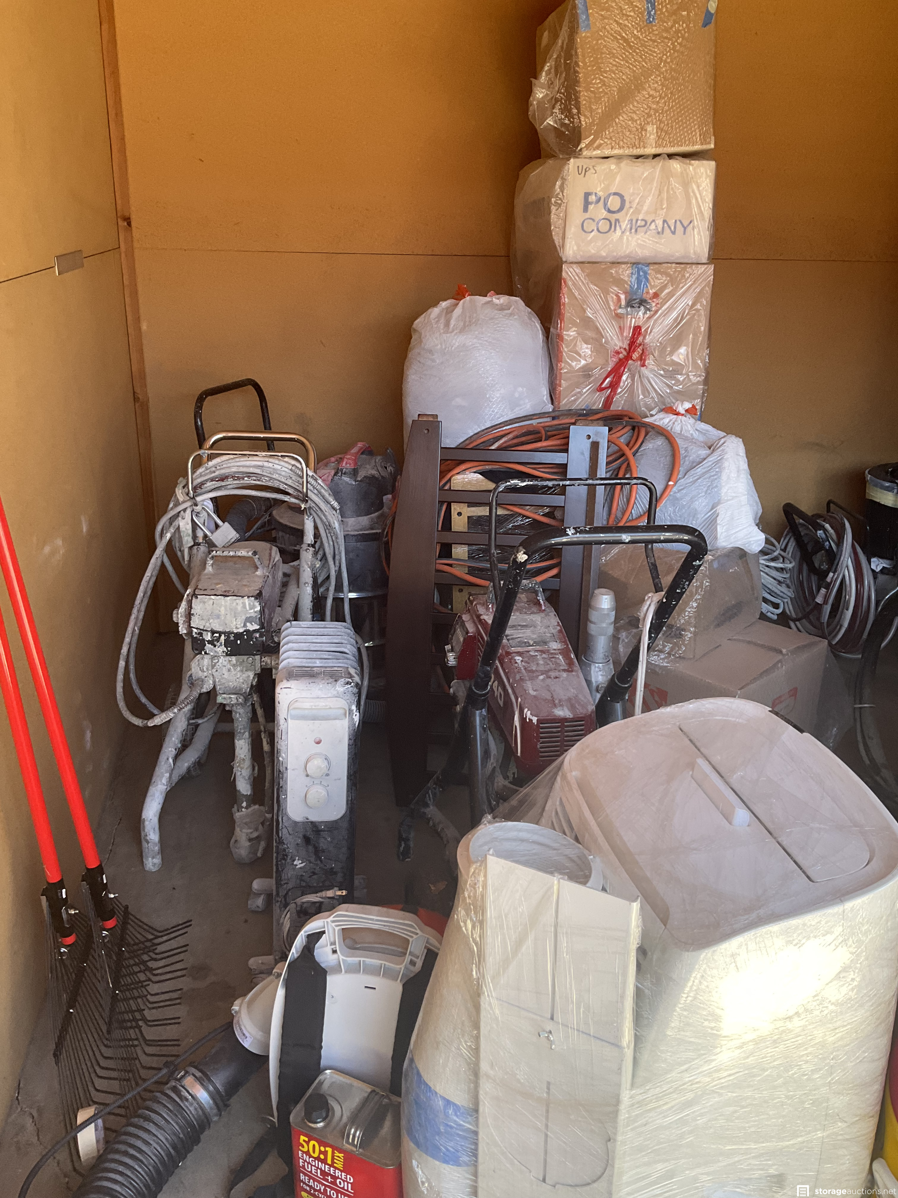 Unit appears to contain professional grade painting equipment, generator, antique hutch, yard tools and flooring repair equipment.