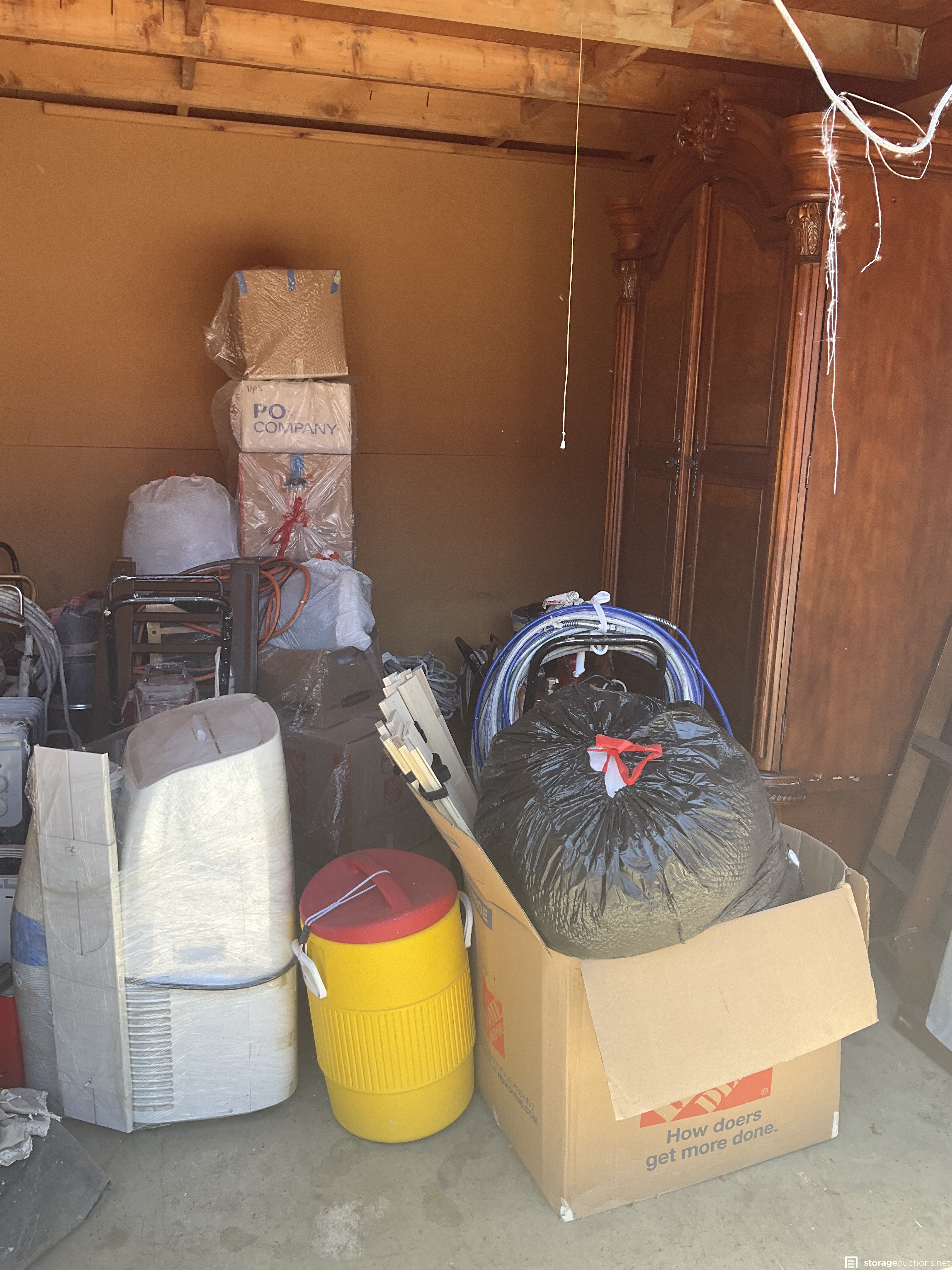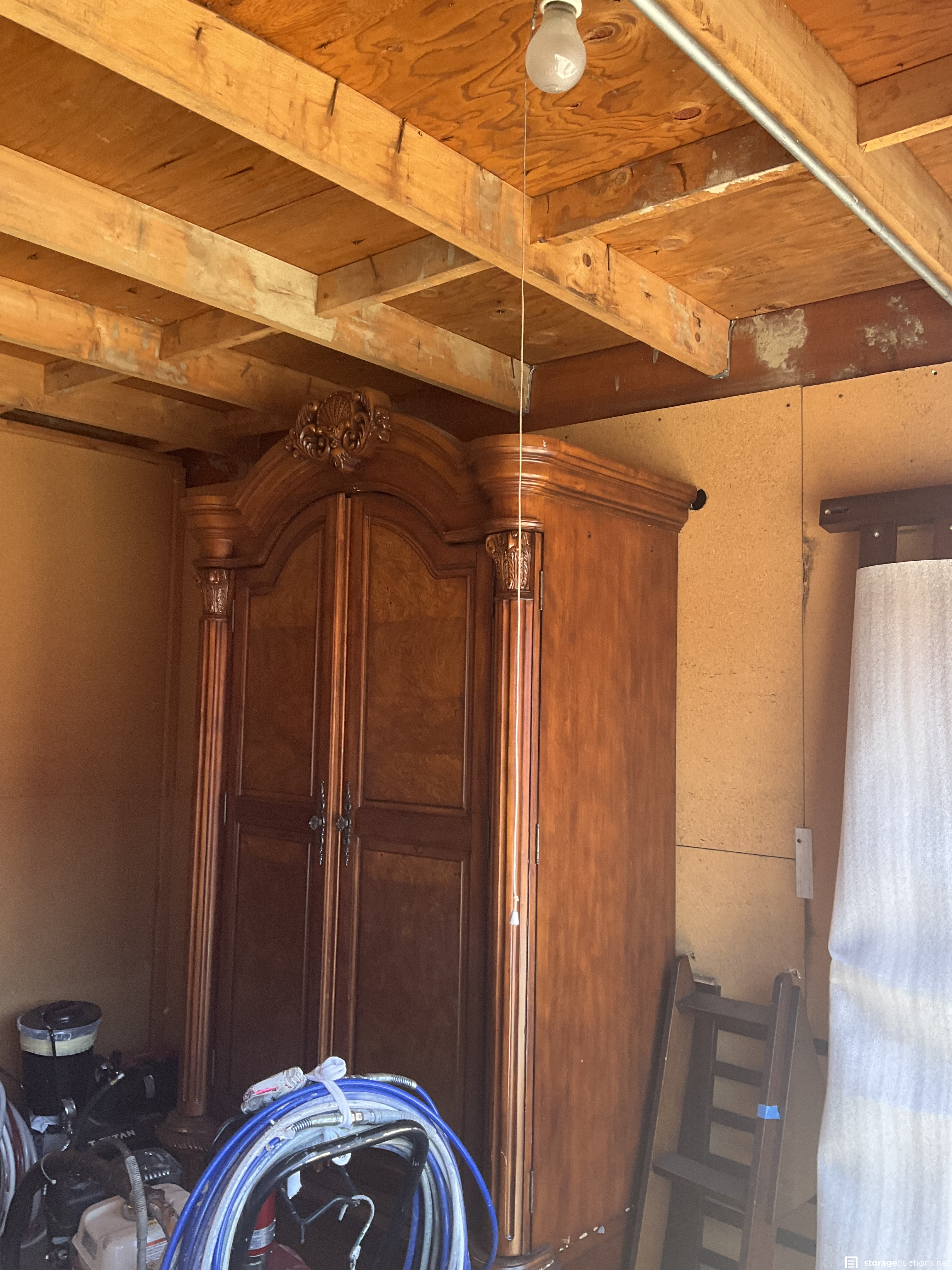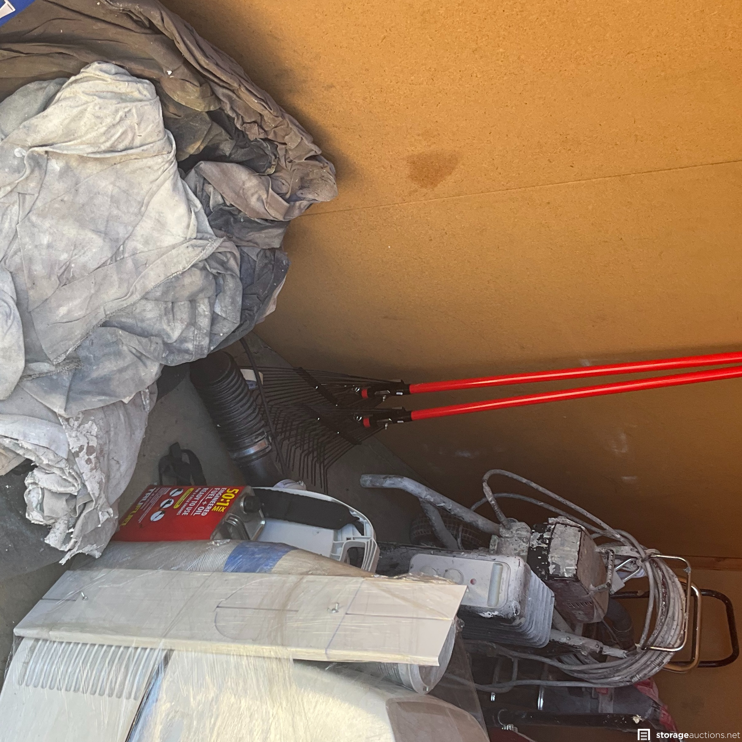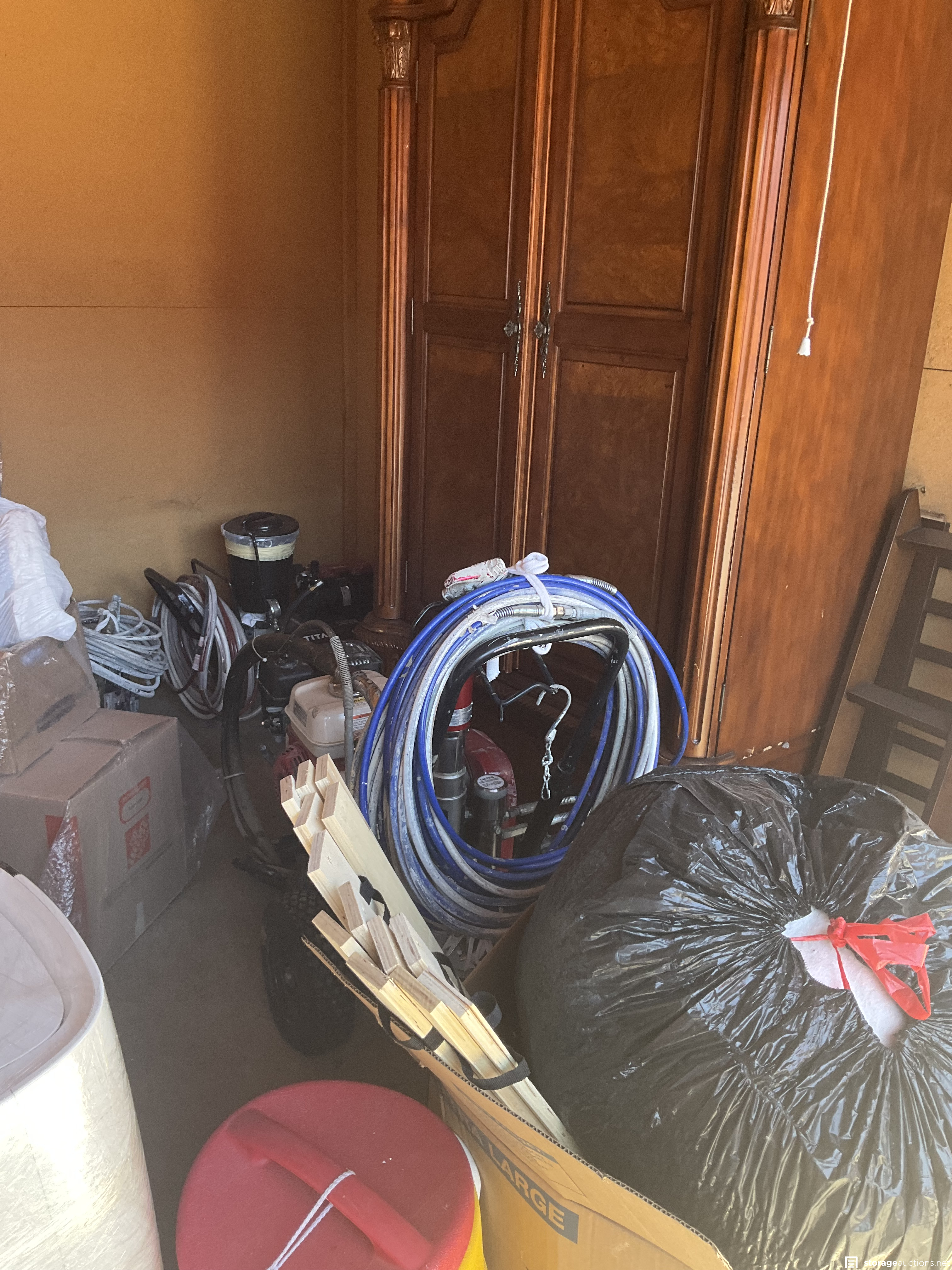 Unit appears to contain professional grade painting equipment, generator, antique hutch, yard tools and flooring repair equipment.