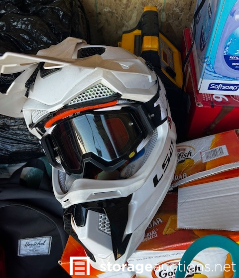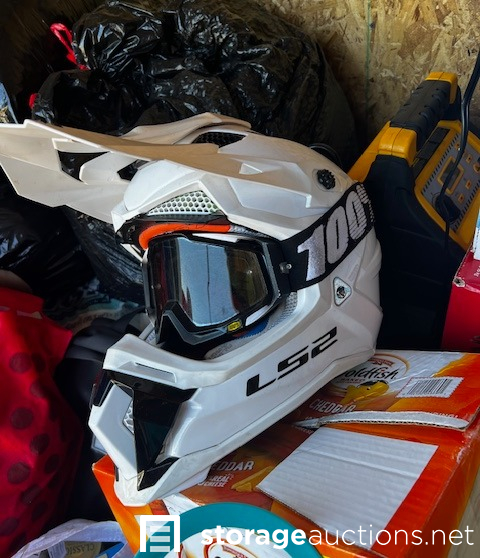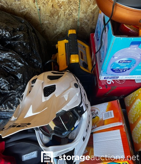 Dirt bike Helmet, Totes, DeWalt Jump starter, Pots and Pans, Suitcase