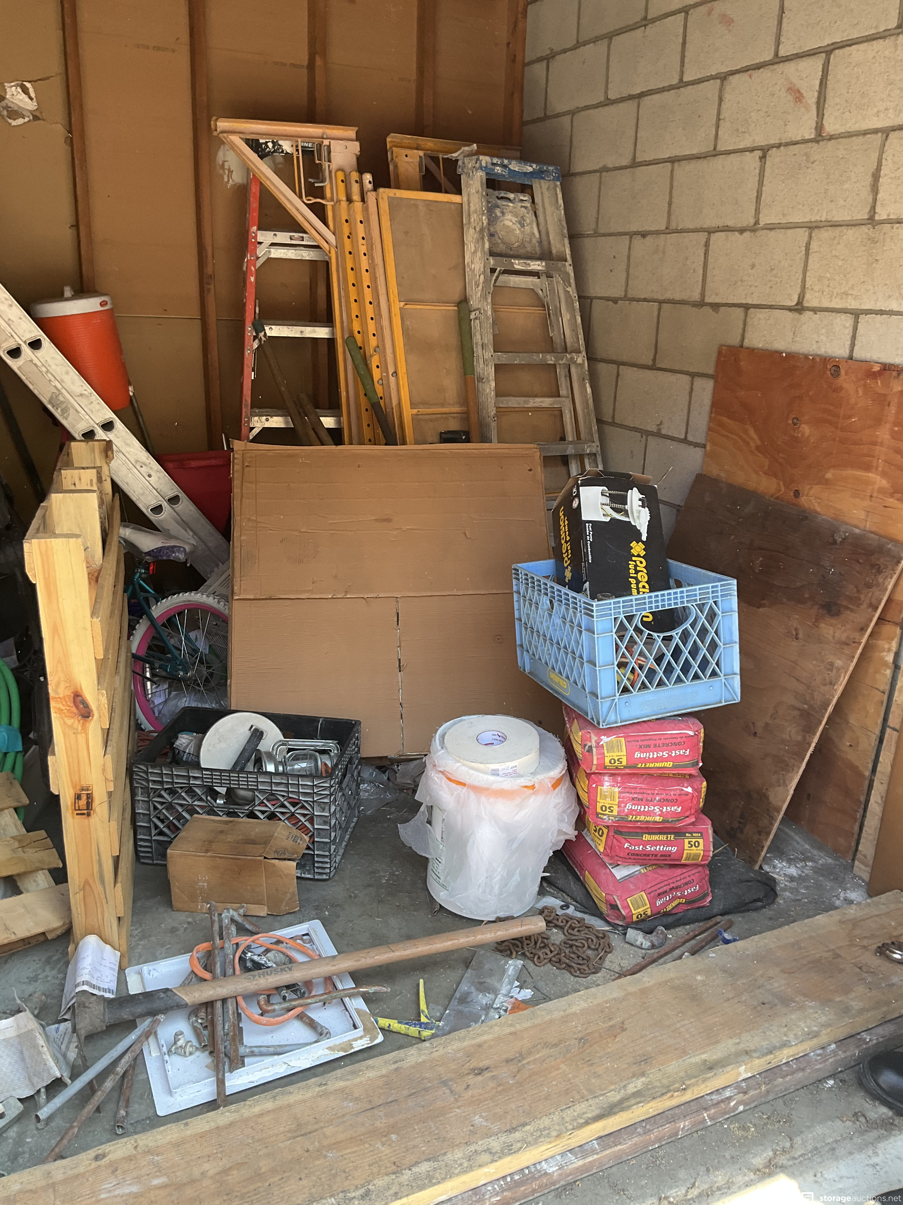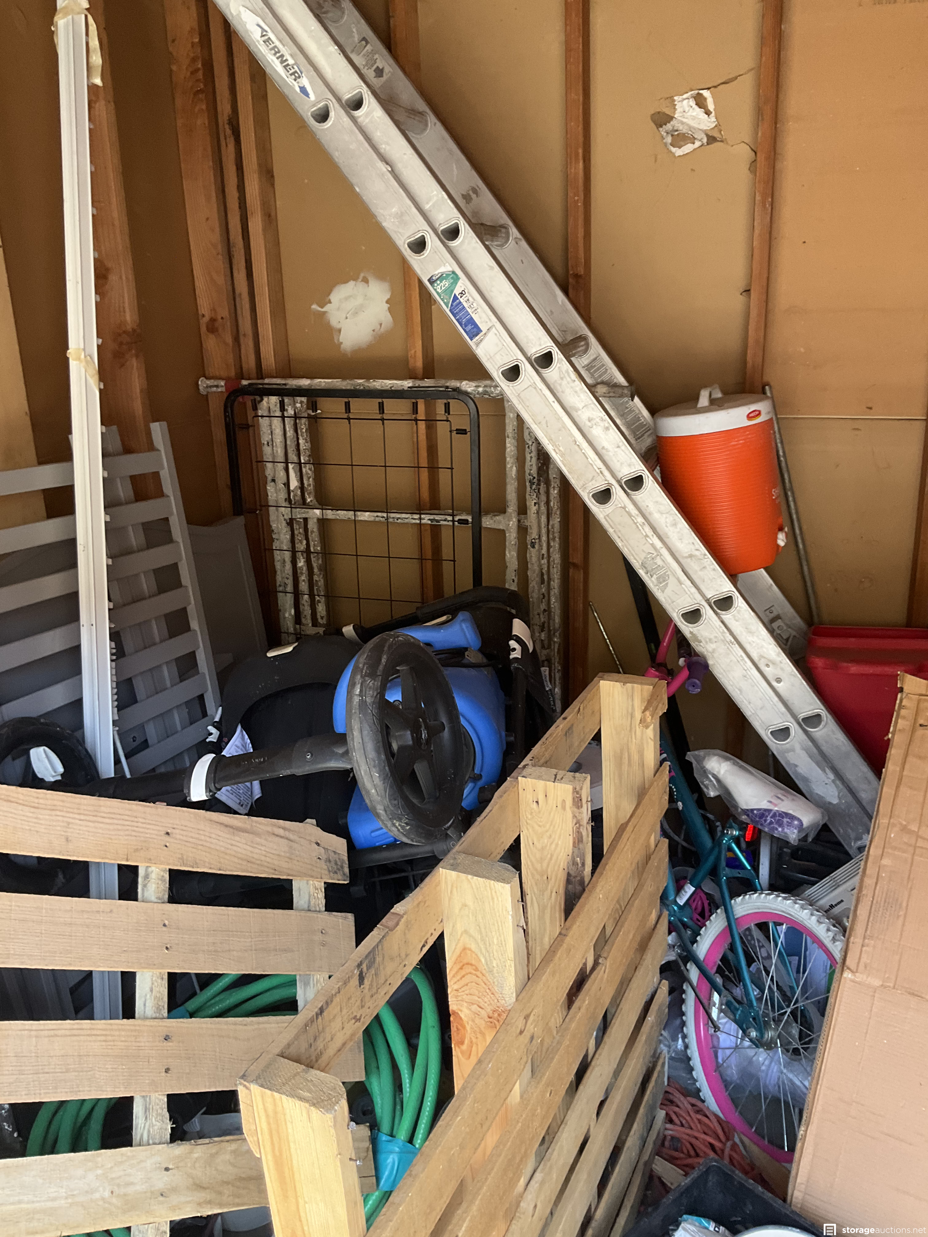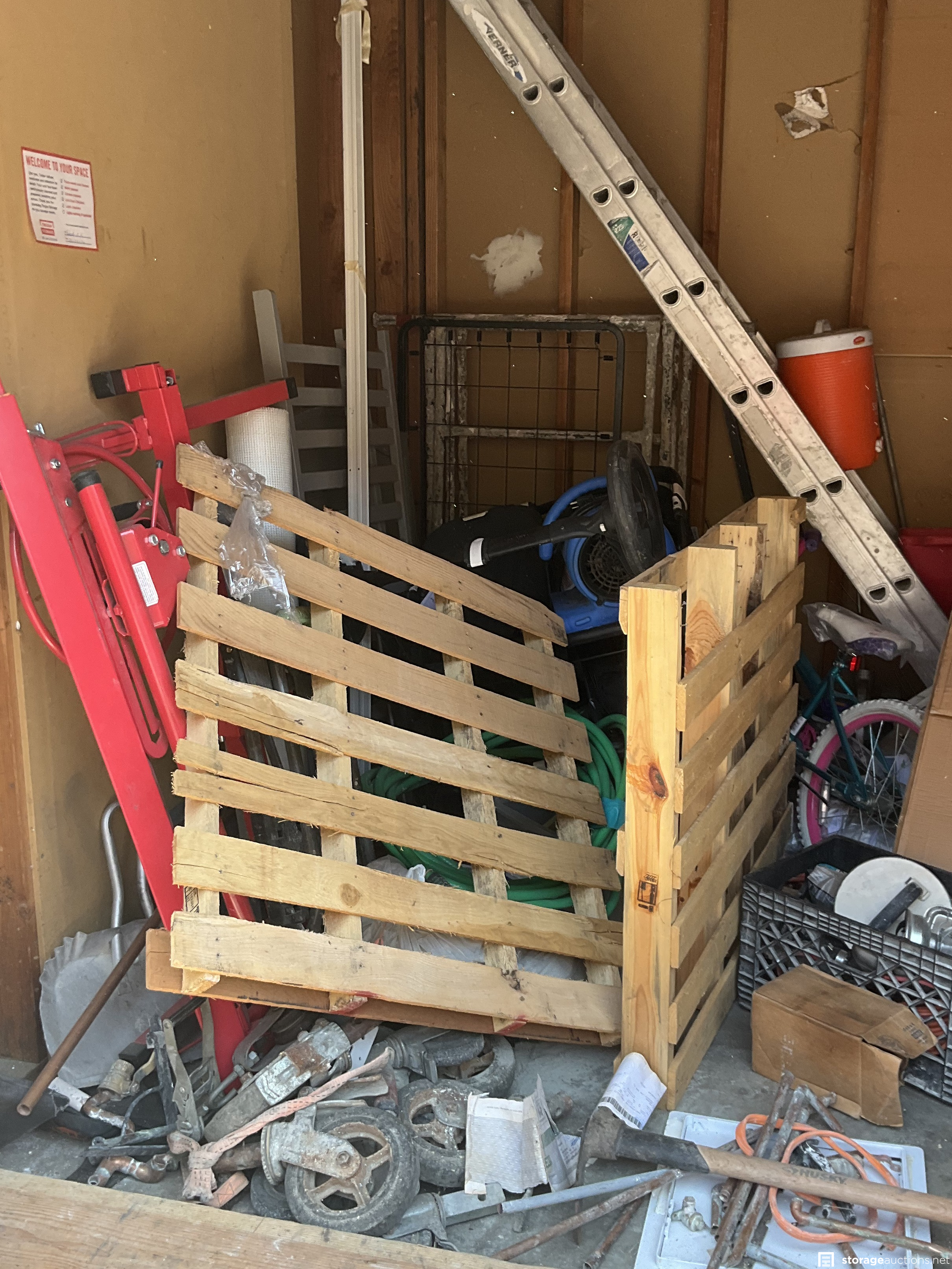 pallets, wood, tools, ladders, wood, bikes, misc