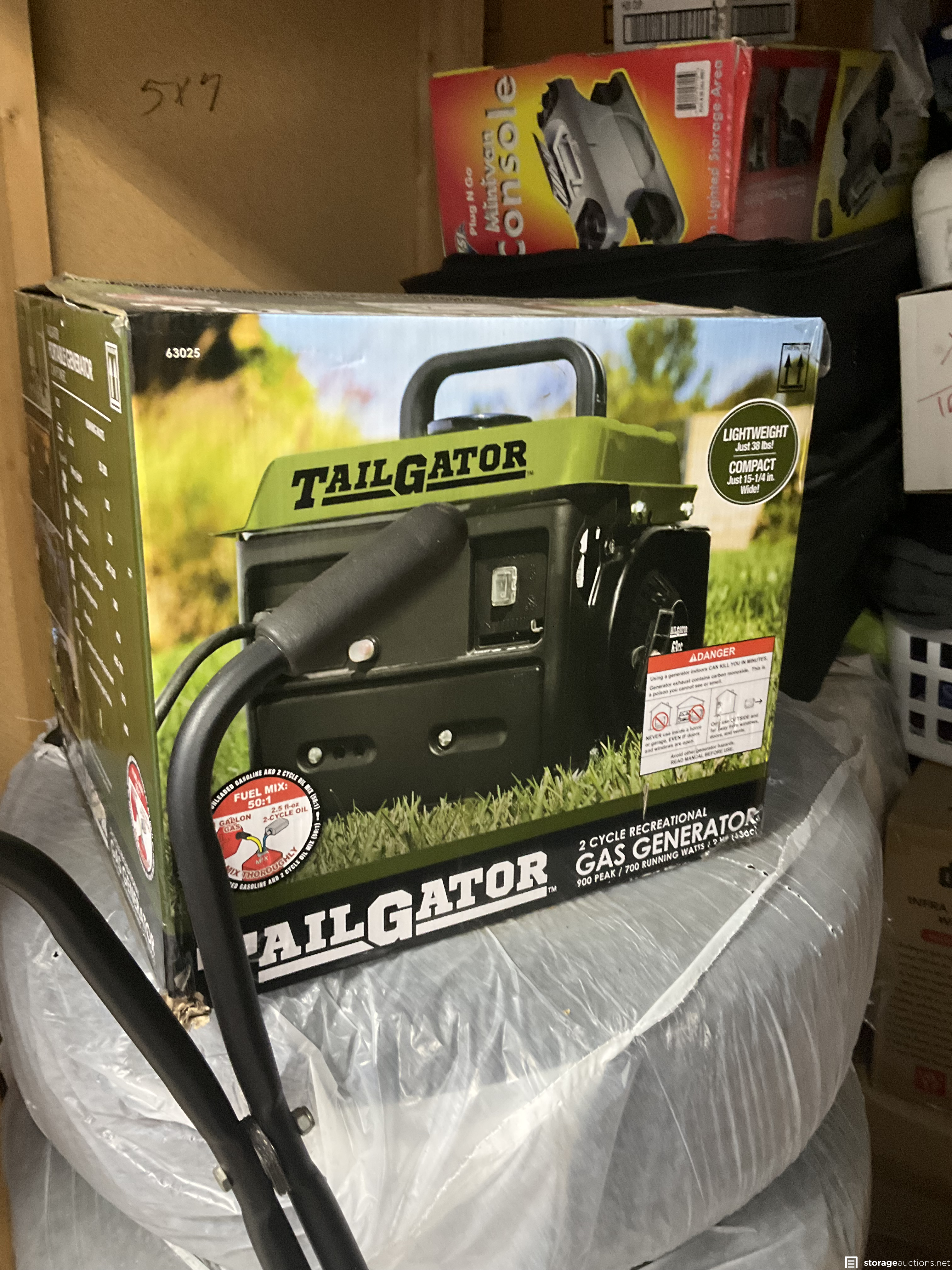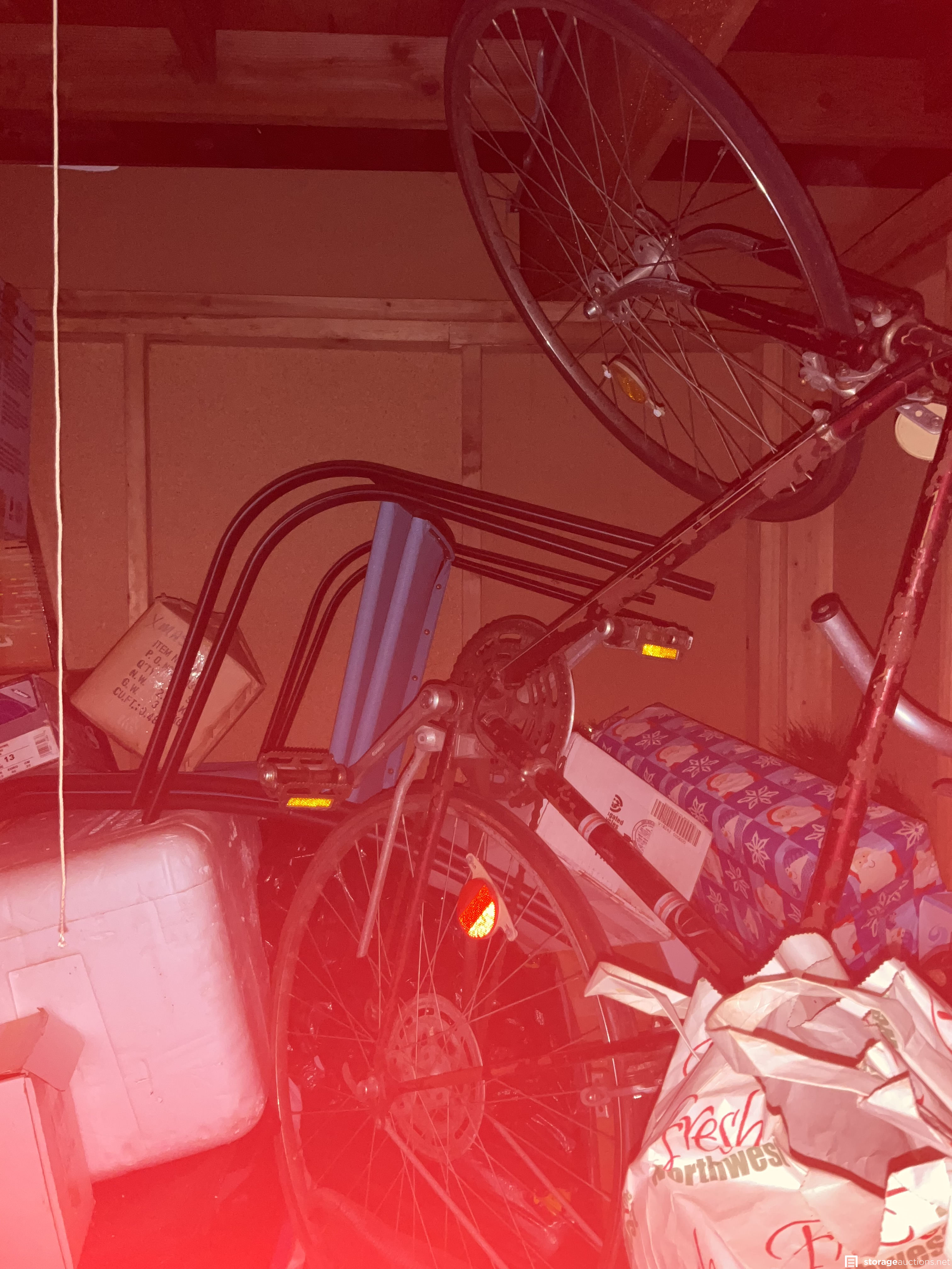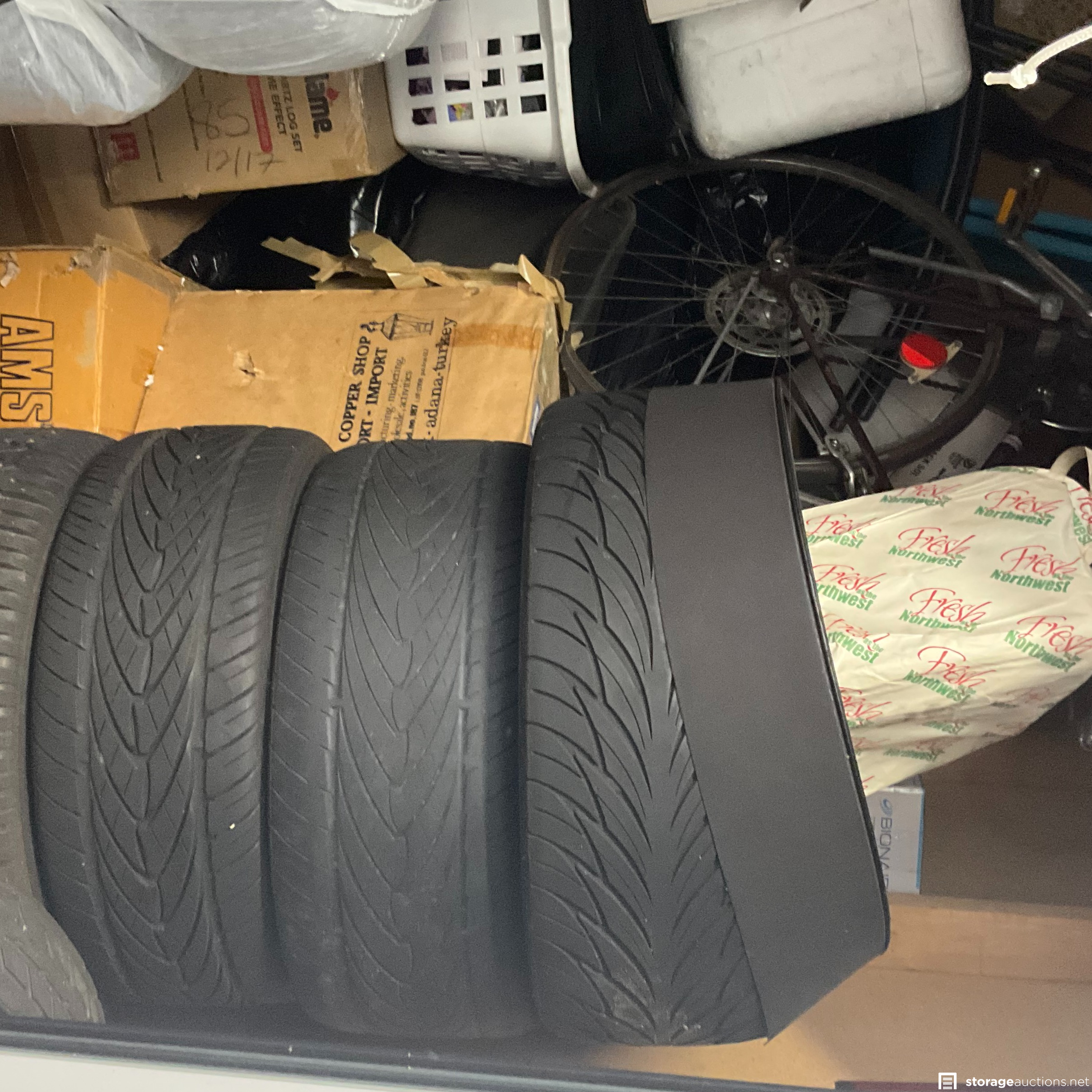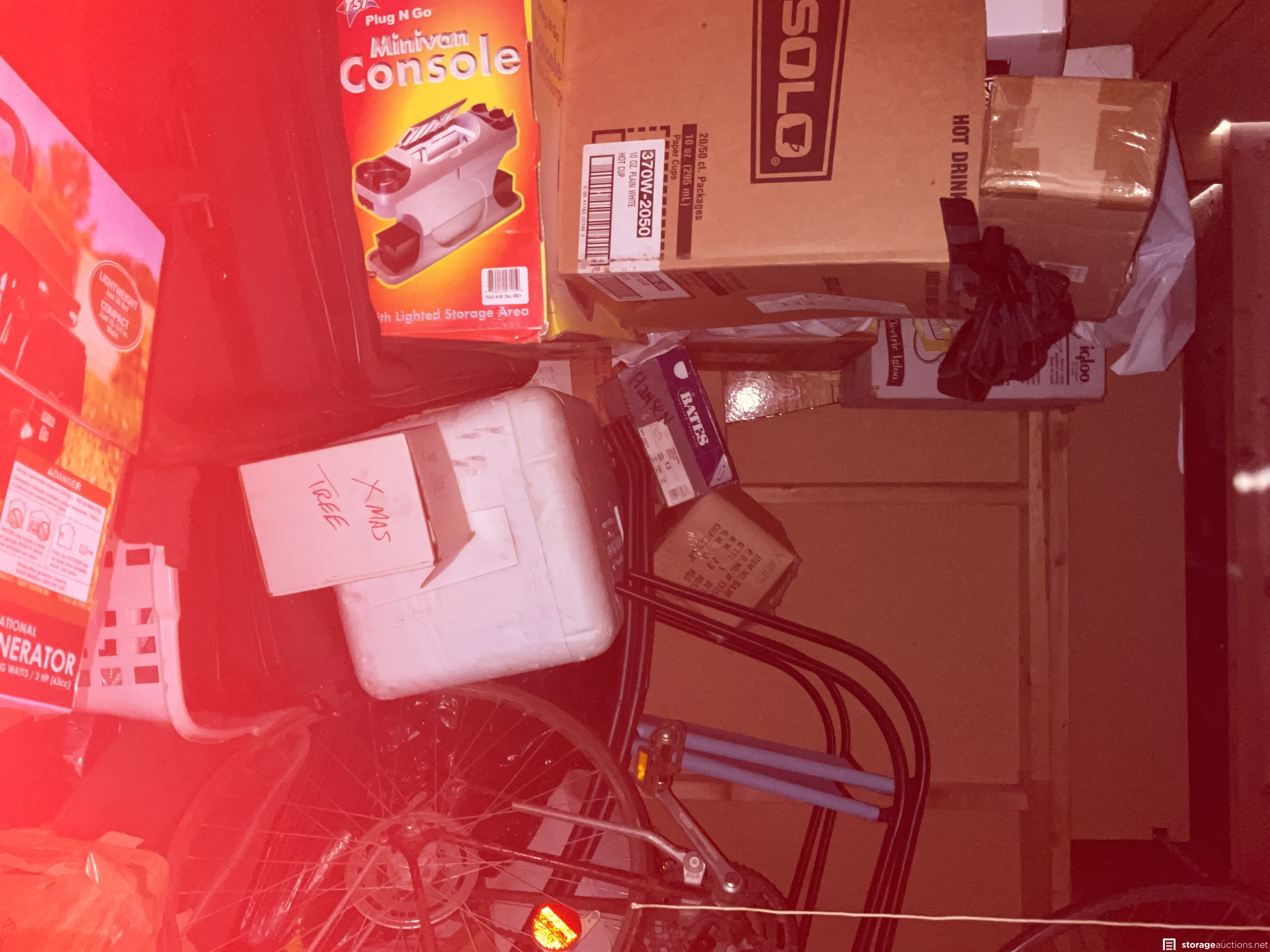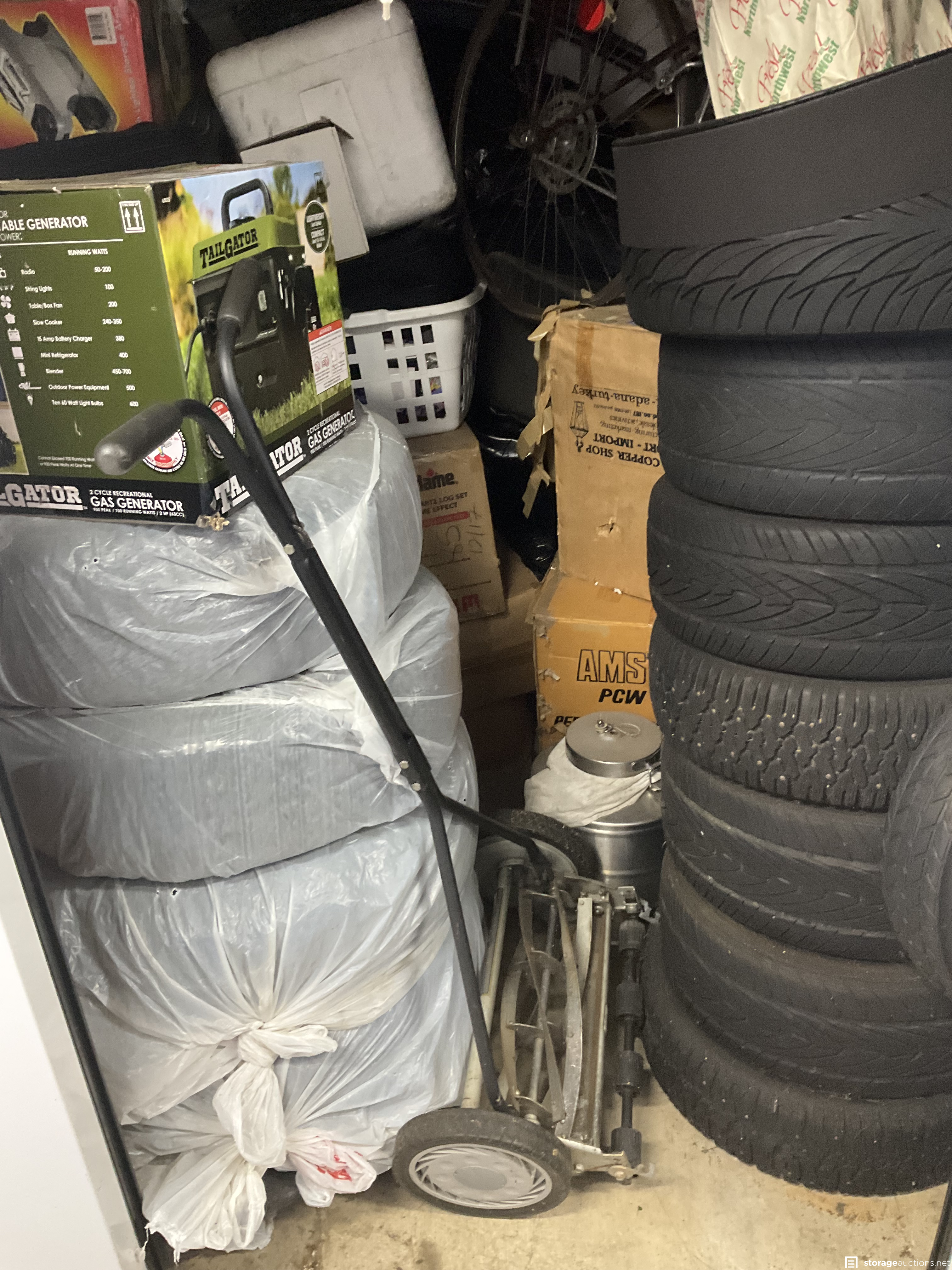 Unit appears to contain tires, bike frames, cooler, furniture, lots of boxes to find hidden gems, and a gas generator.