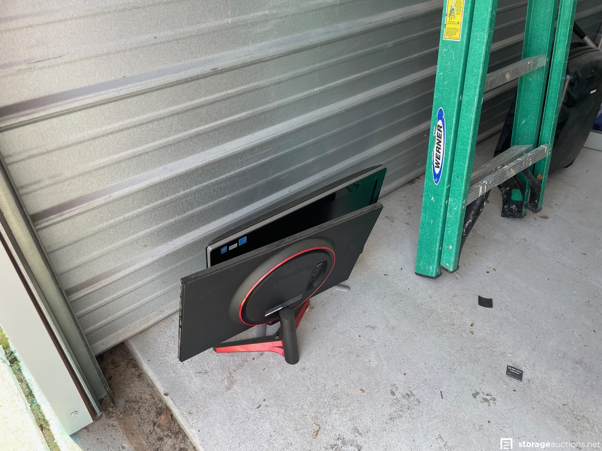 BOOK SHELF, FOLDING CHAIRS, LADDER, SUITCASE, HEADBOARD & FOOTBOARD, WEED EATER, MONITORS, MISC ITEMS