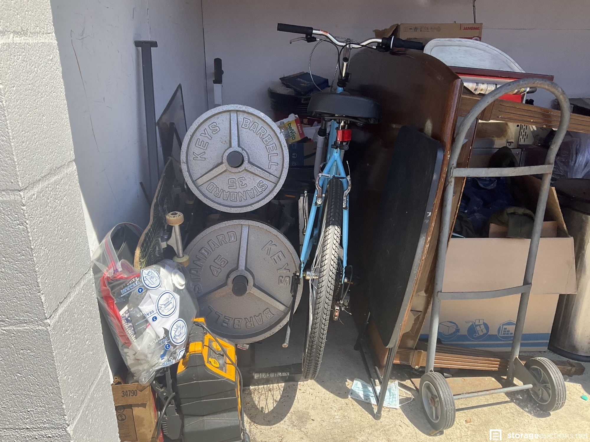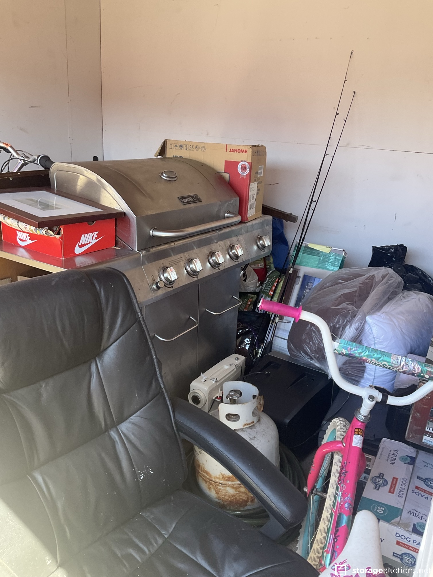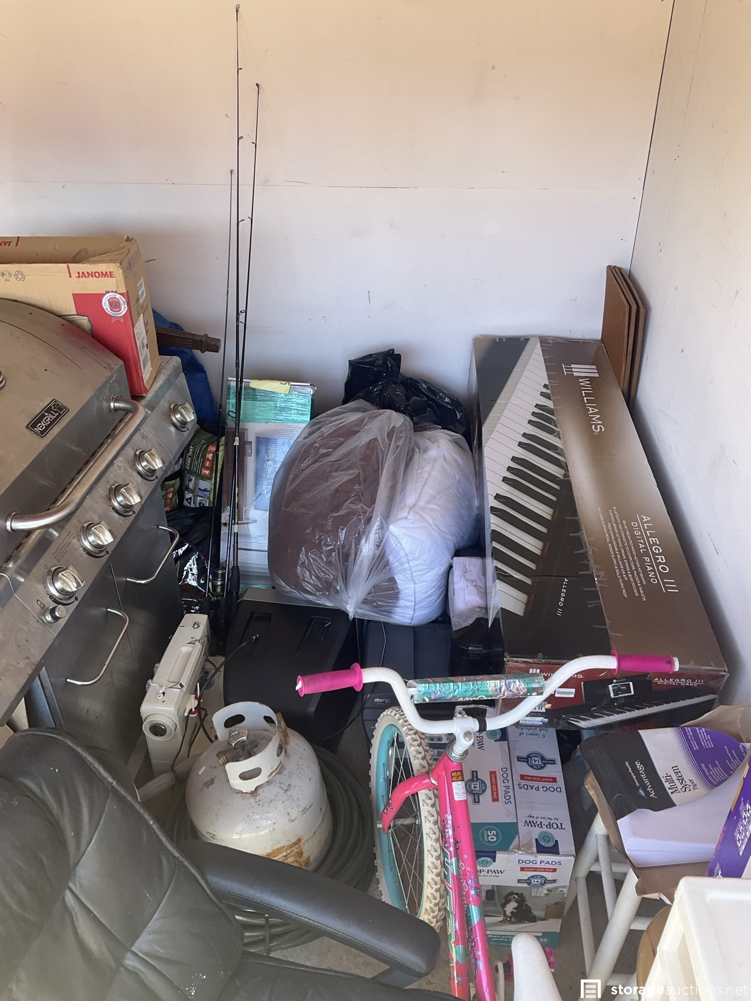 Unit appears to contain: BBQ Grill, bikes, fishing gear, weight lifting equipment, battery charger, sewing machine, office chair, Digital Piano, camping equipment.