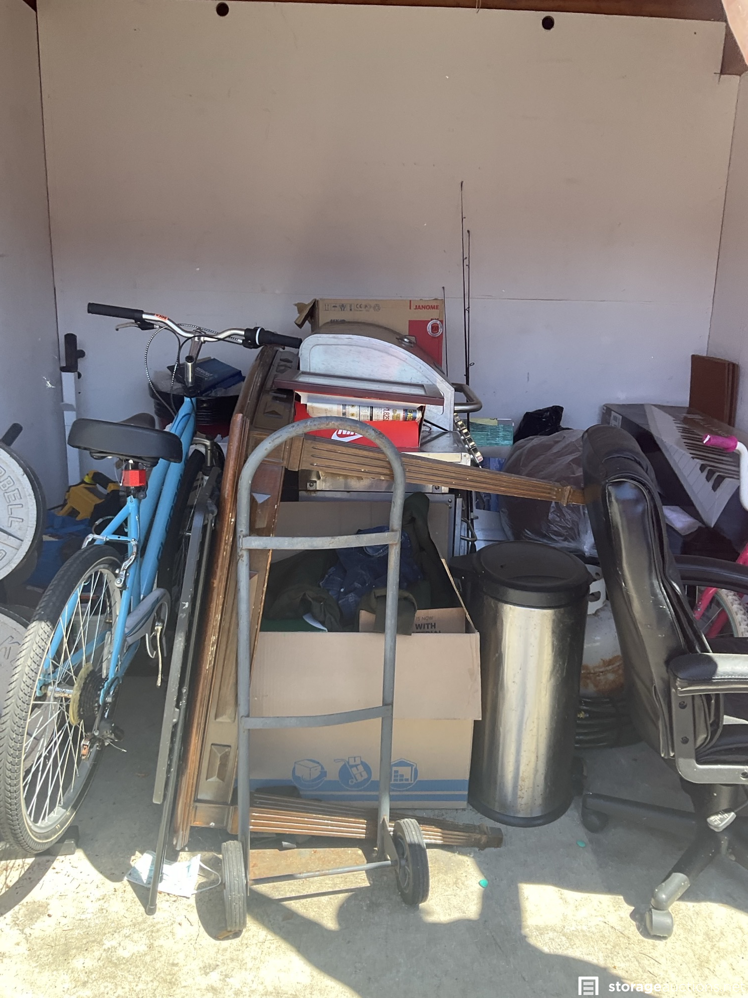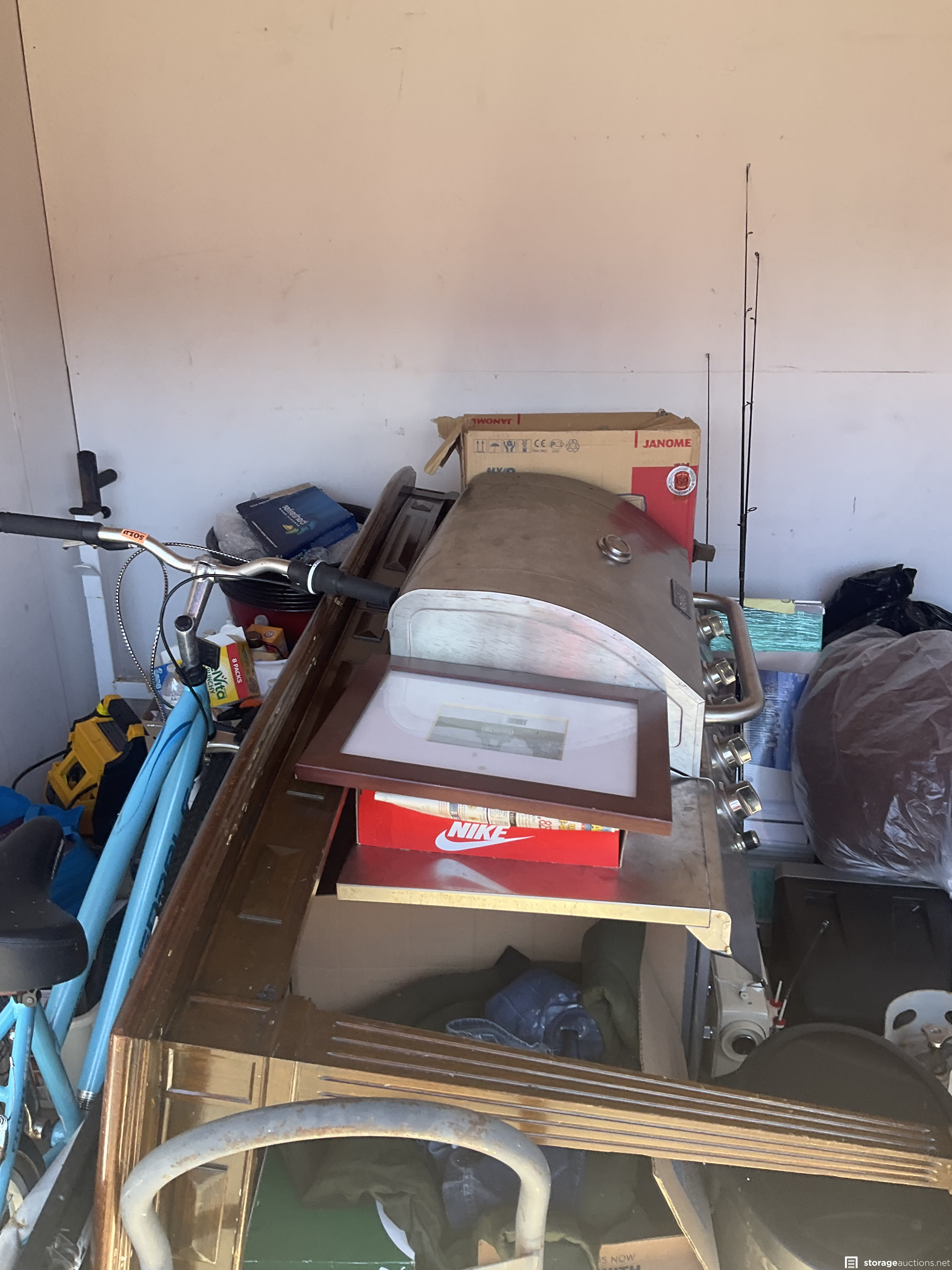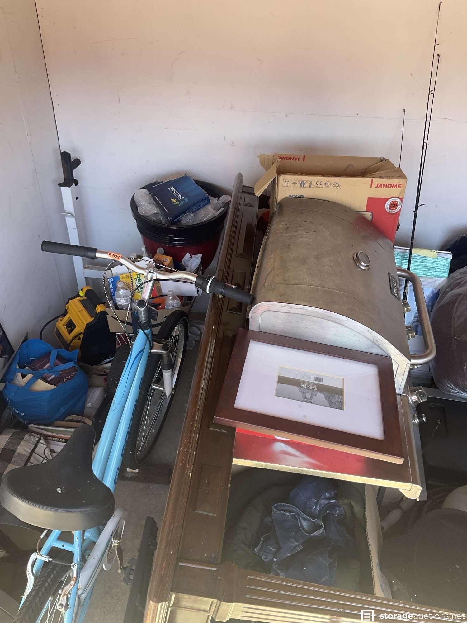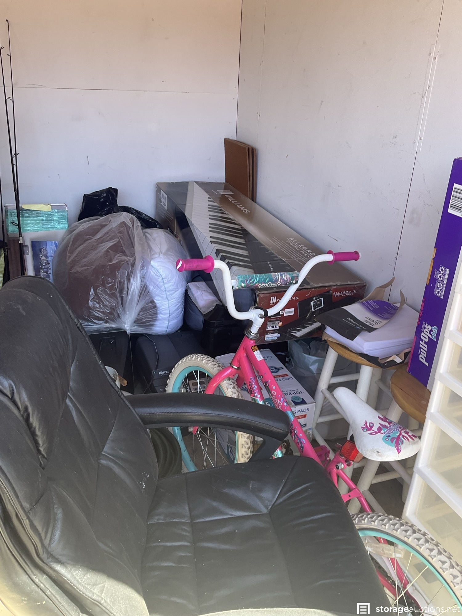 Unit appears to contain: BBQ Grill, bikes, fishing gear, weight lifting equipment, battery charger, sewing machine, office chair, Digital Piano, camping equipment.