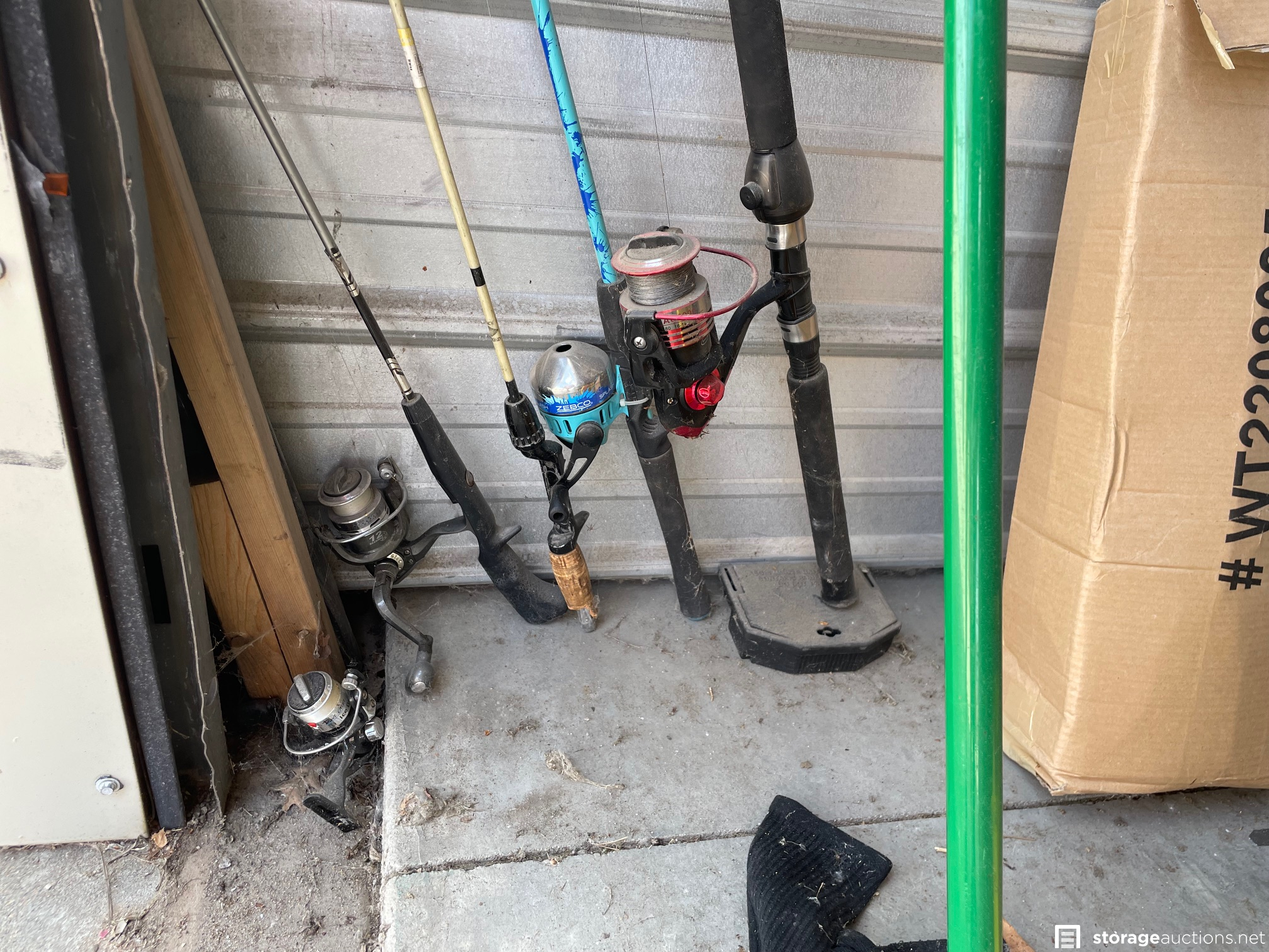 GRILL, MATTRESS SET, FURNITURE, SHELVES, MICROWAVE, FISHING POLES, FOLDING TABLES, RECLINER, GAS CANS, MISC BOXES, MISC ITEMS