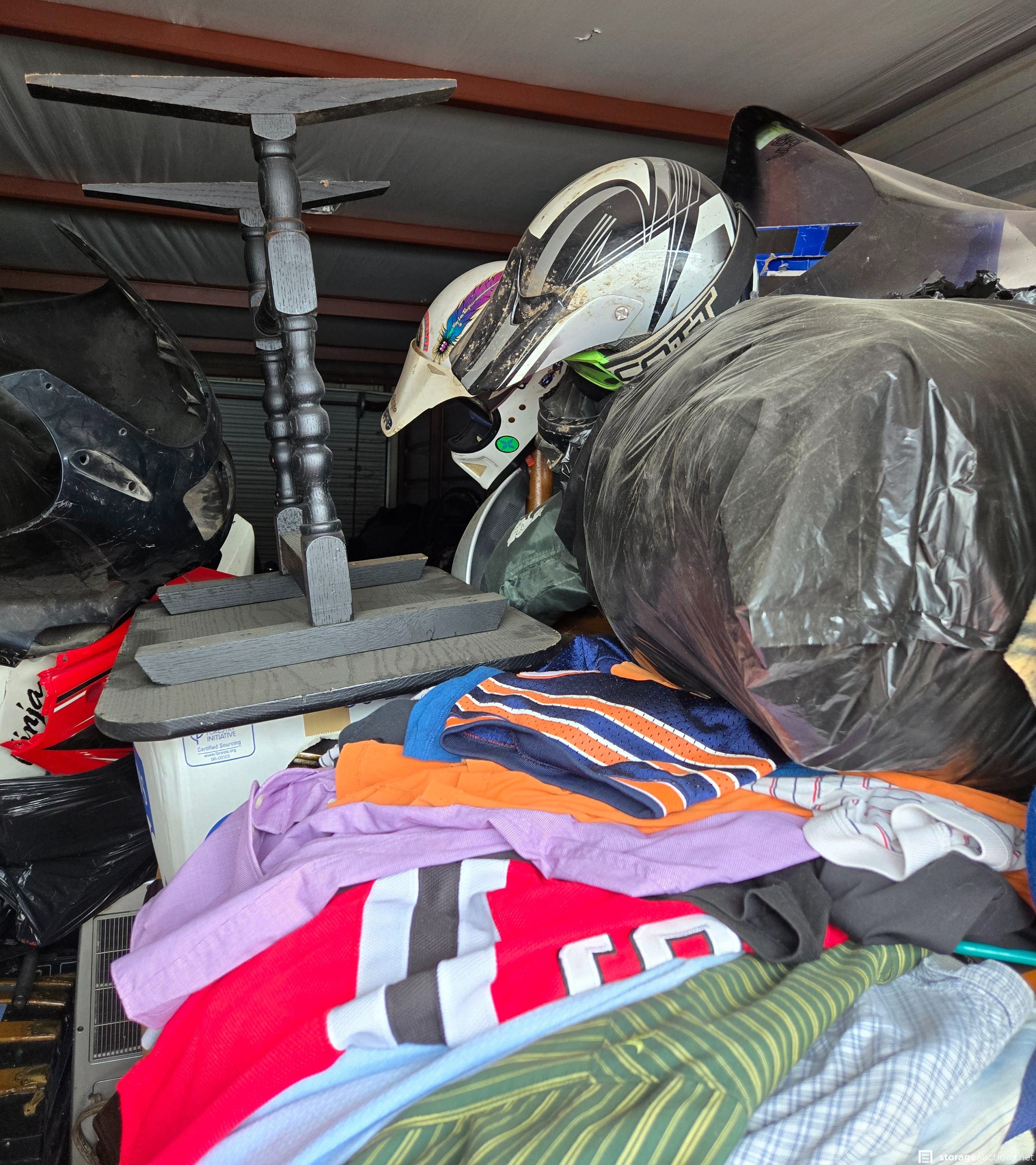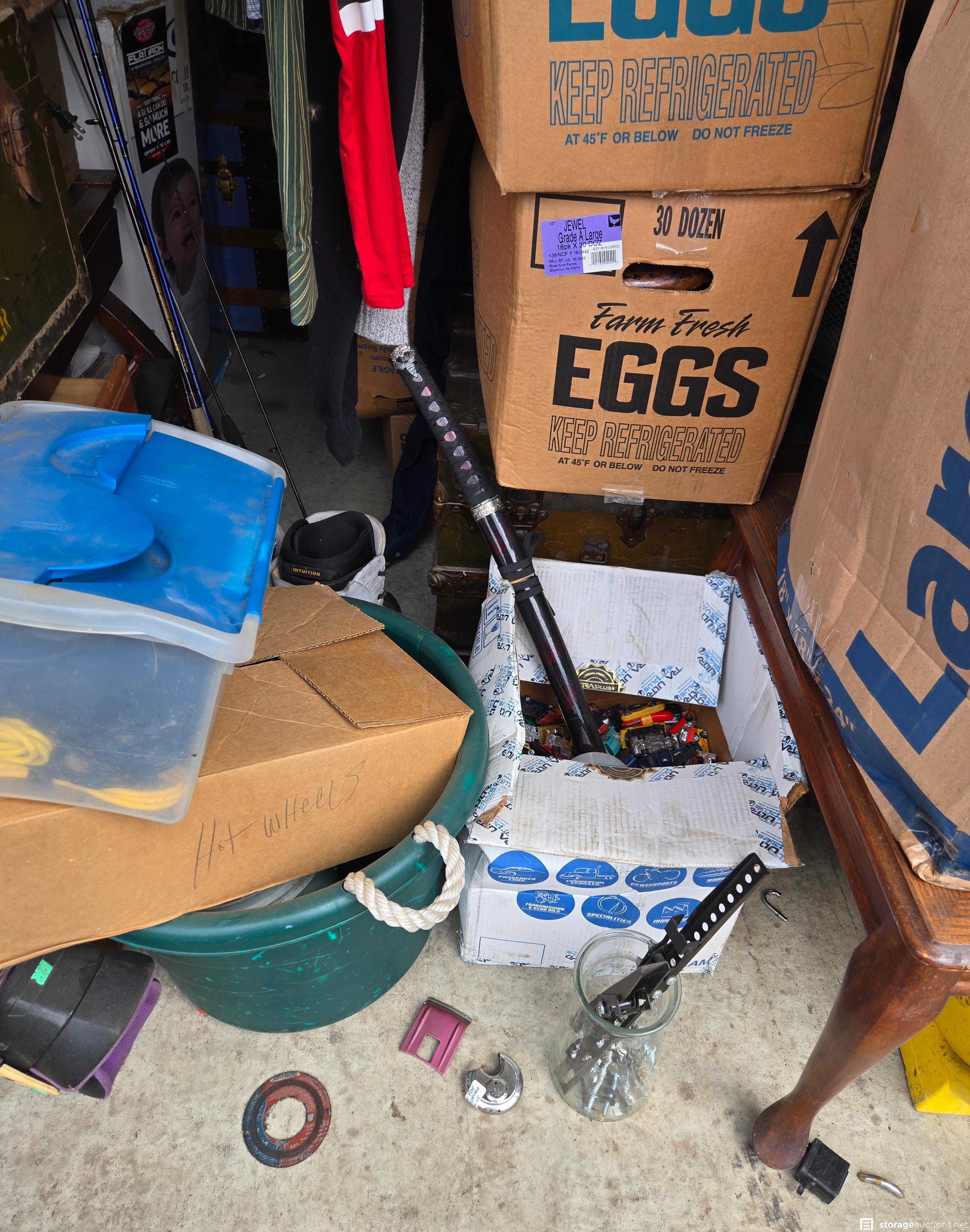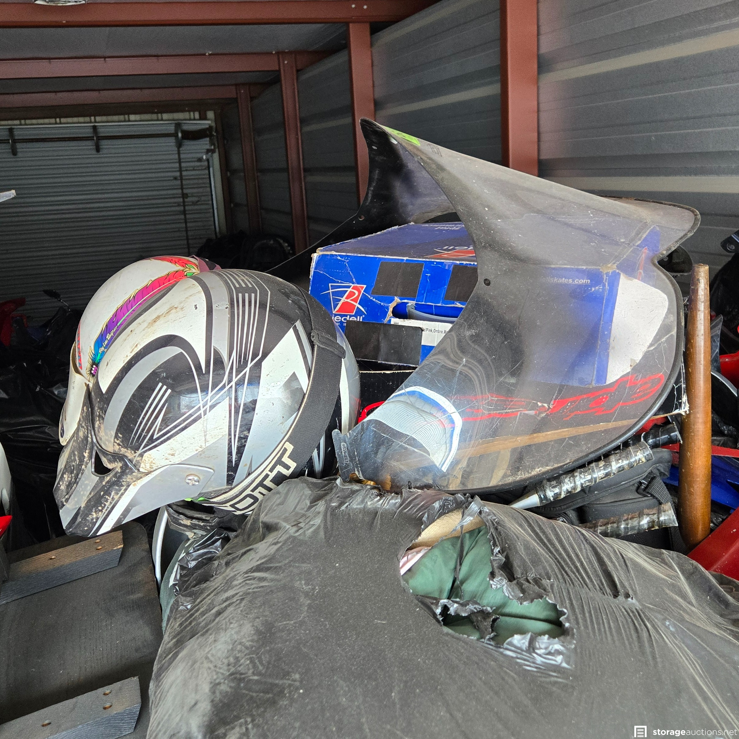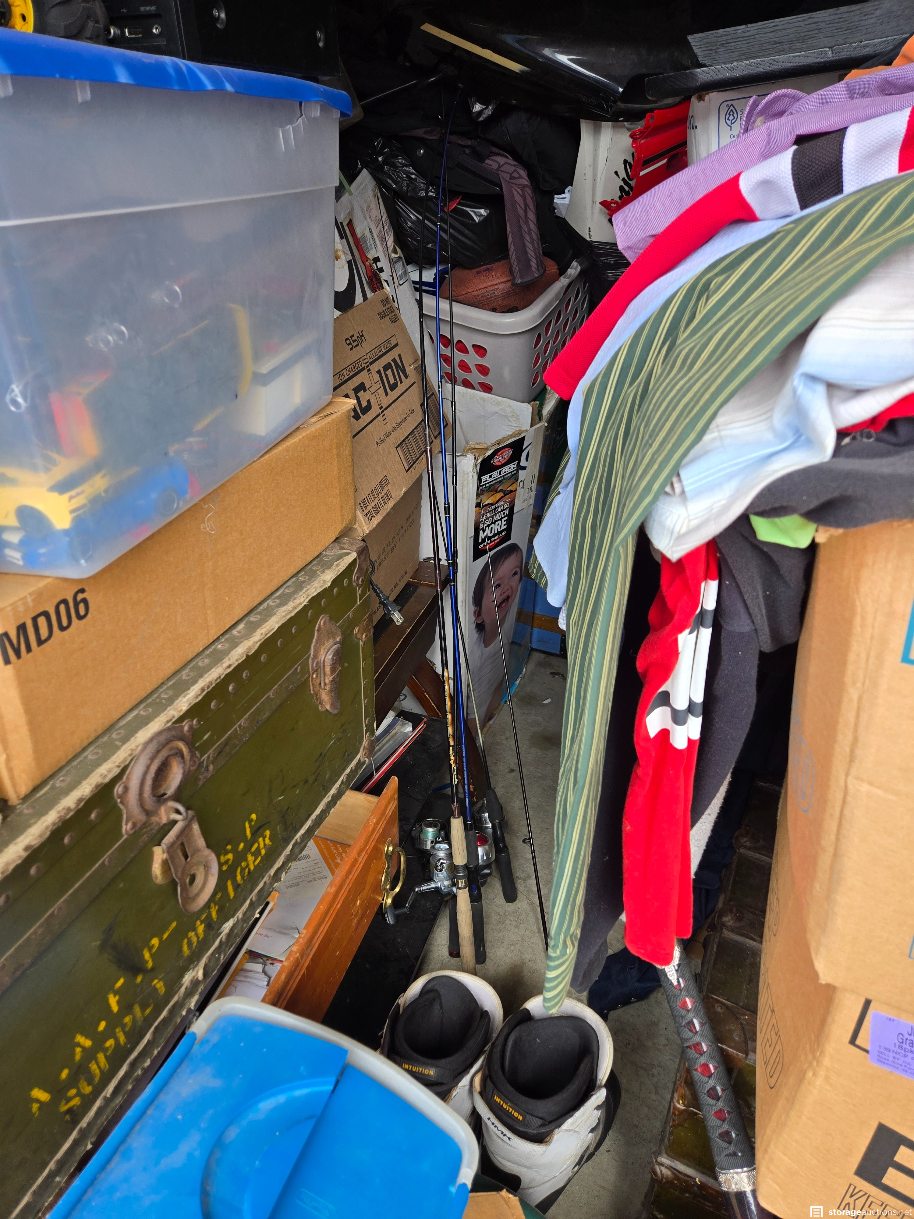 Fishing poles, helmets, ski boots, Katana, Hot Wheels, Furniture, cabinet, trunks, clothing, Hot Wheels tracks, sports equipment, wall art, lamps, motorcycles, dirt bike, boxes, boxes, bins, etc.