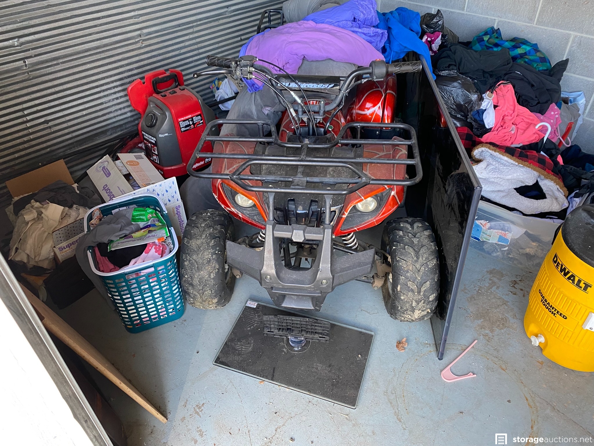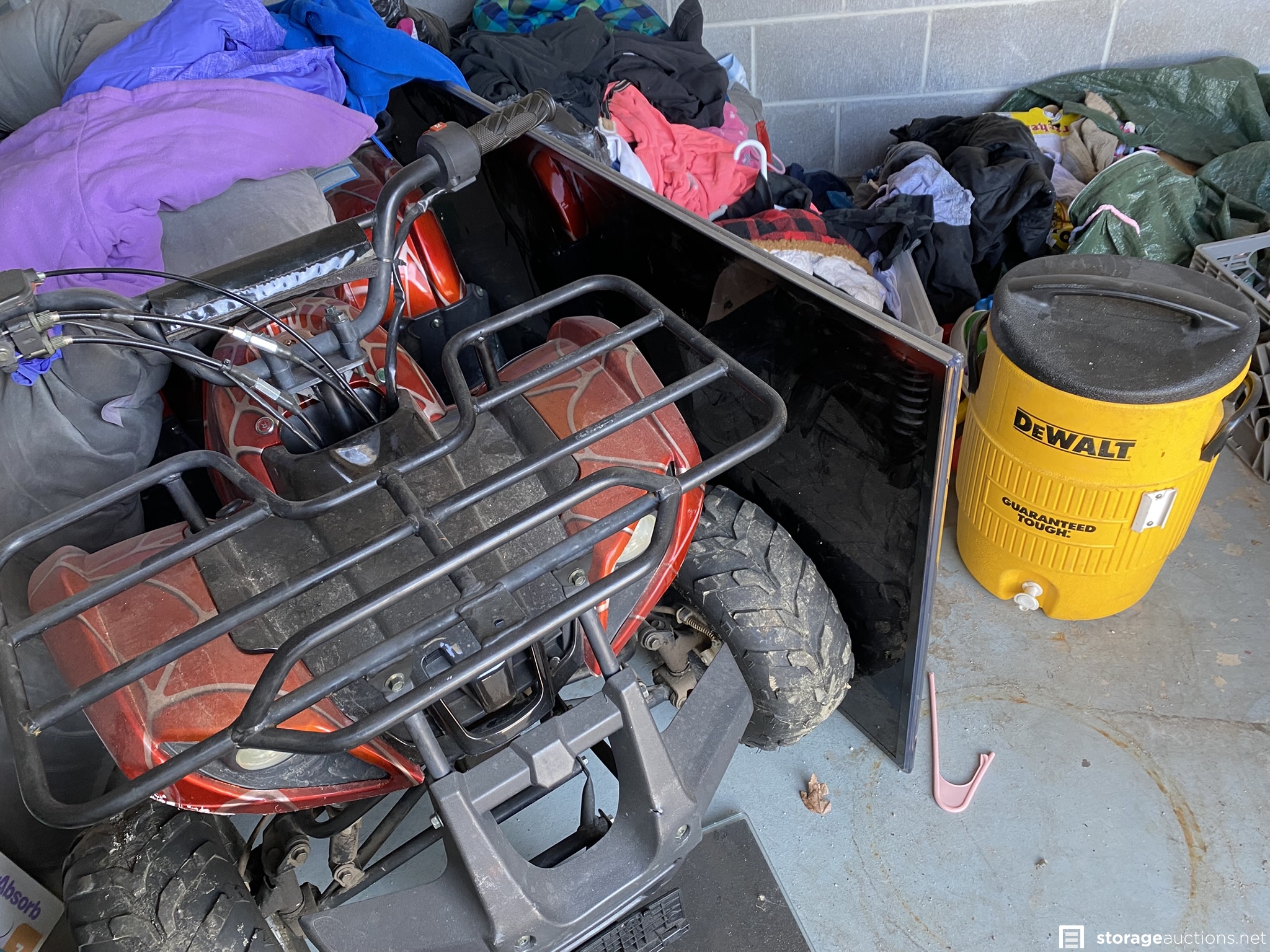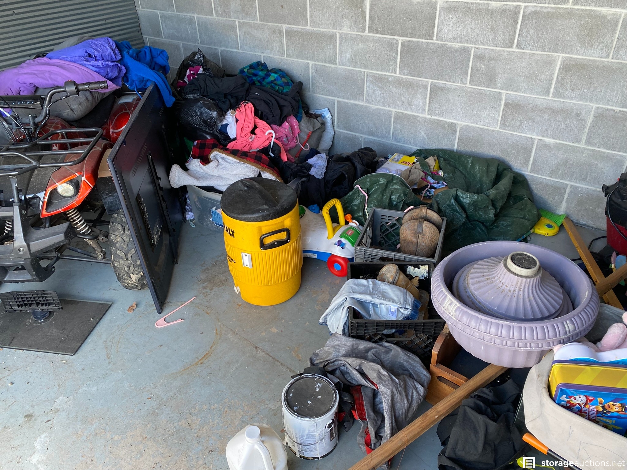ATV (looks similar to a Tao Tao 125cc designed for youth riders), Rug Doctor Pro, plat panel TV and monitor, DeWALT cooler, soundbar, old toolbox, shop vac, leather boots, toys, and various household goods.