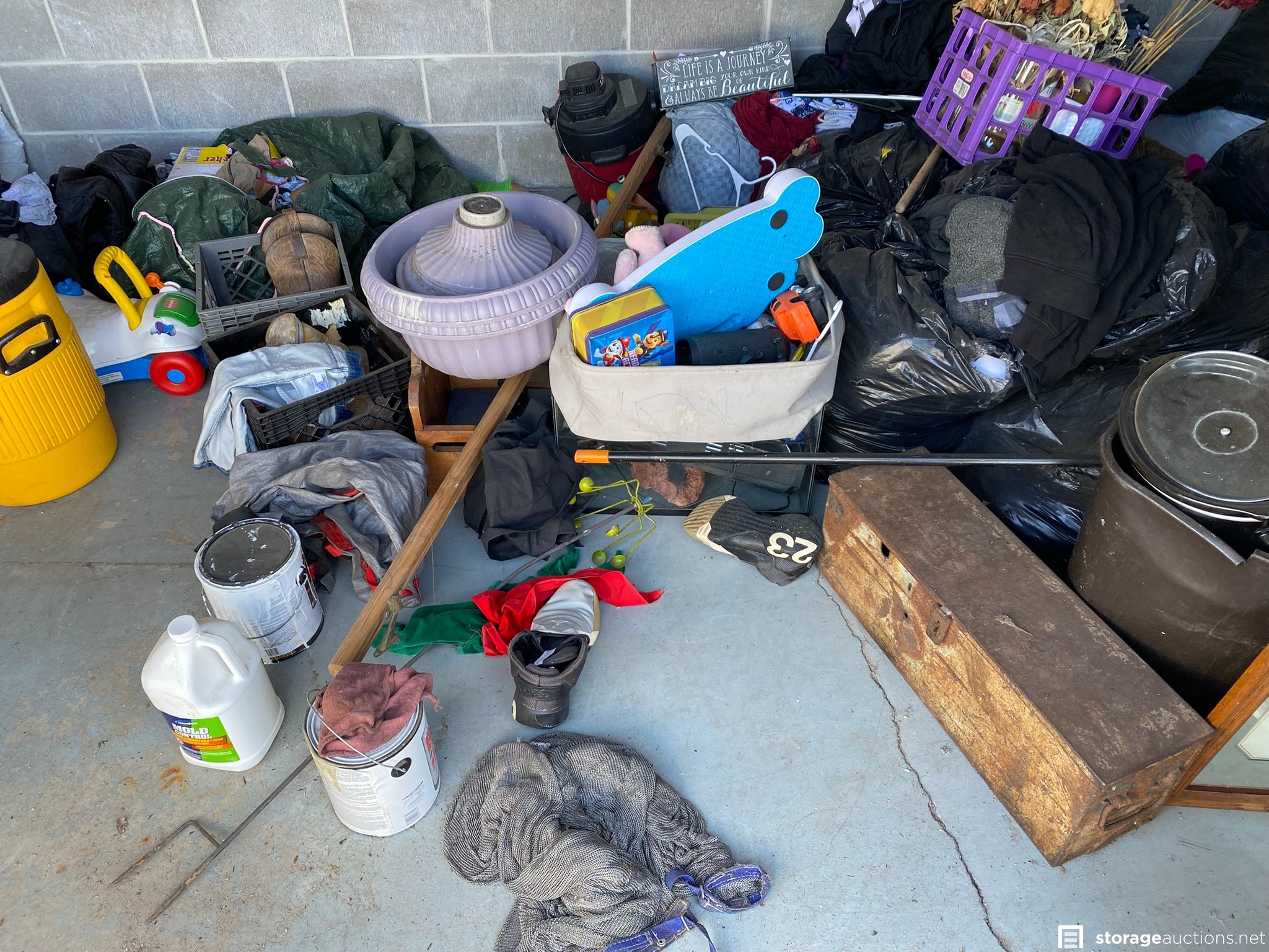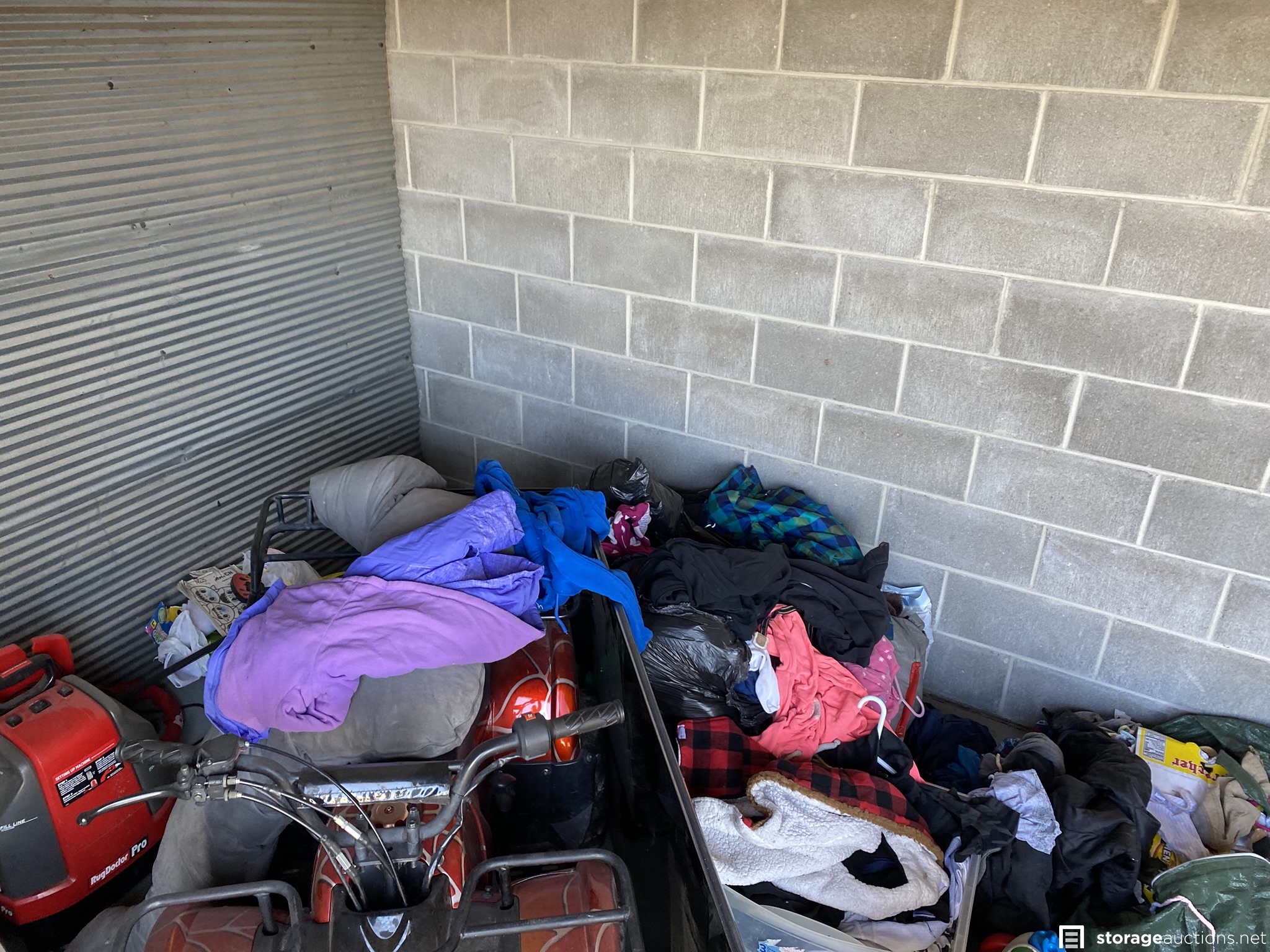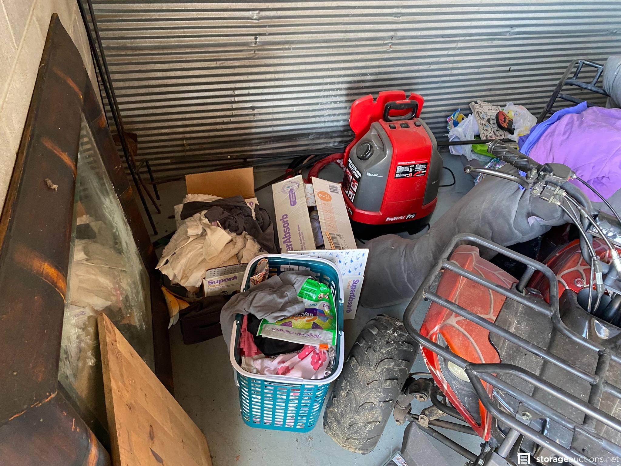 ATV (looks similar to a Tao Tao 125cc designed for youth riders), Rug Doctor Pro, plat panel TV and monitor, DeWALT cooler, soundbar, old toolbox, shop vac, leather boots, toys, and various household goods.