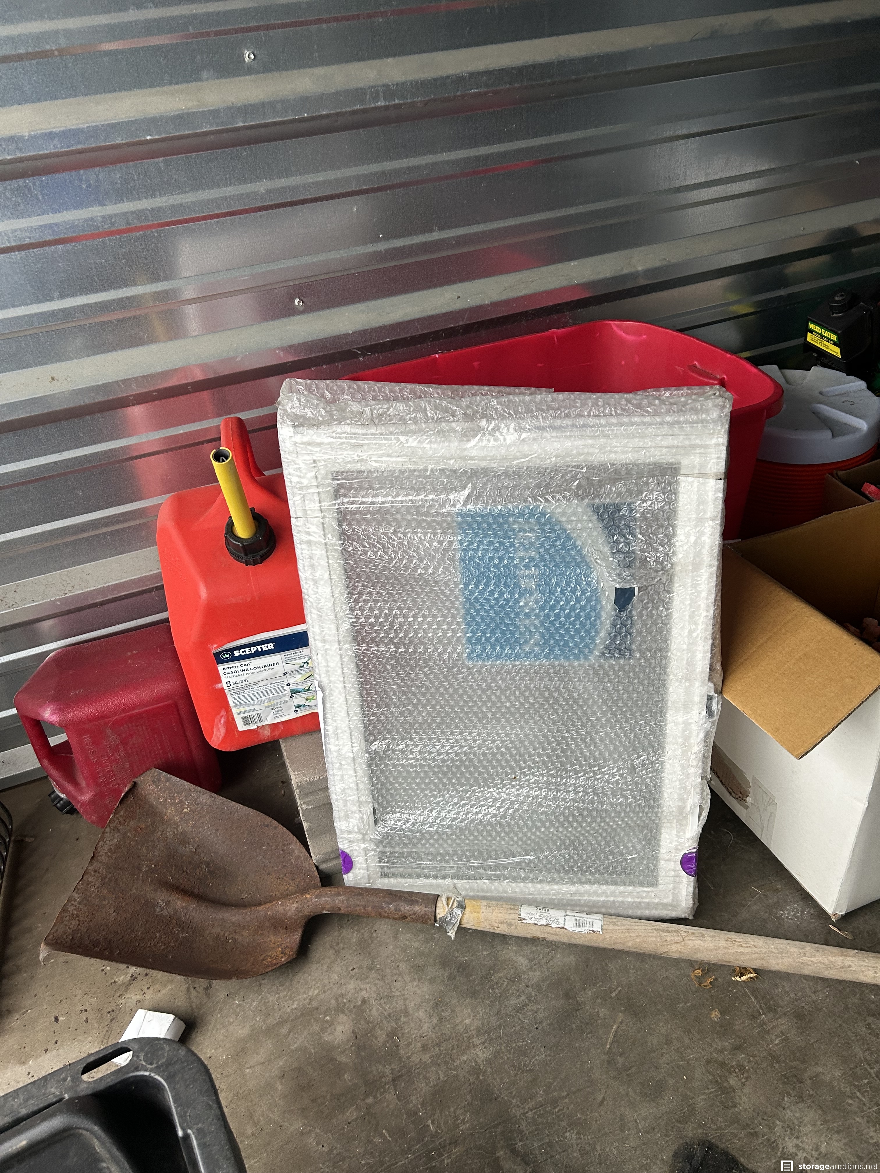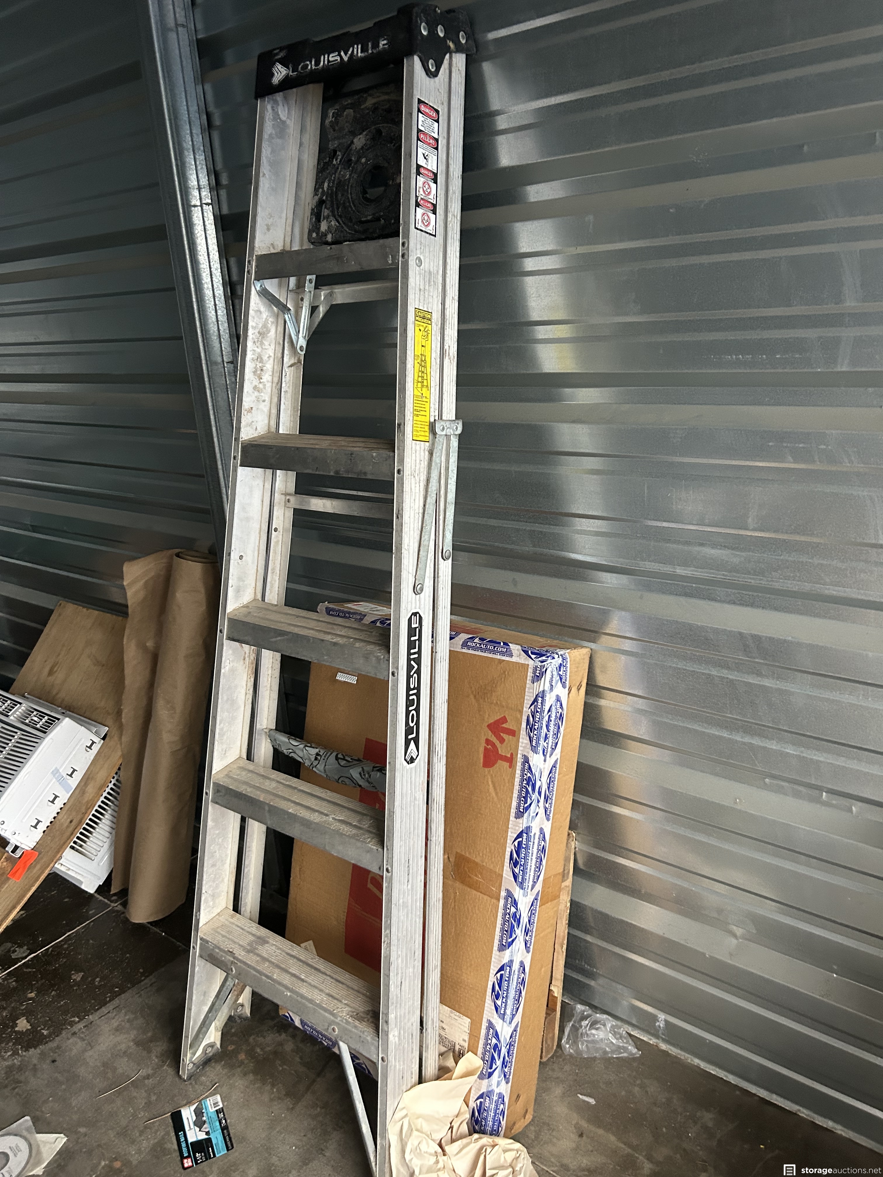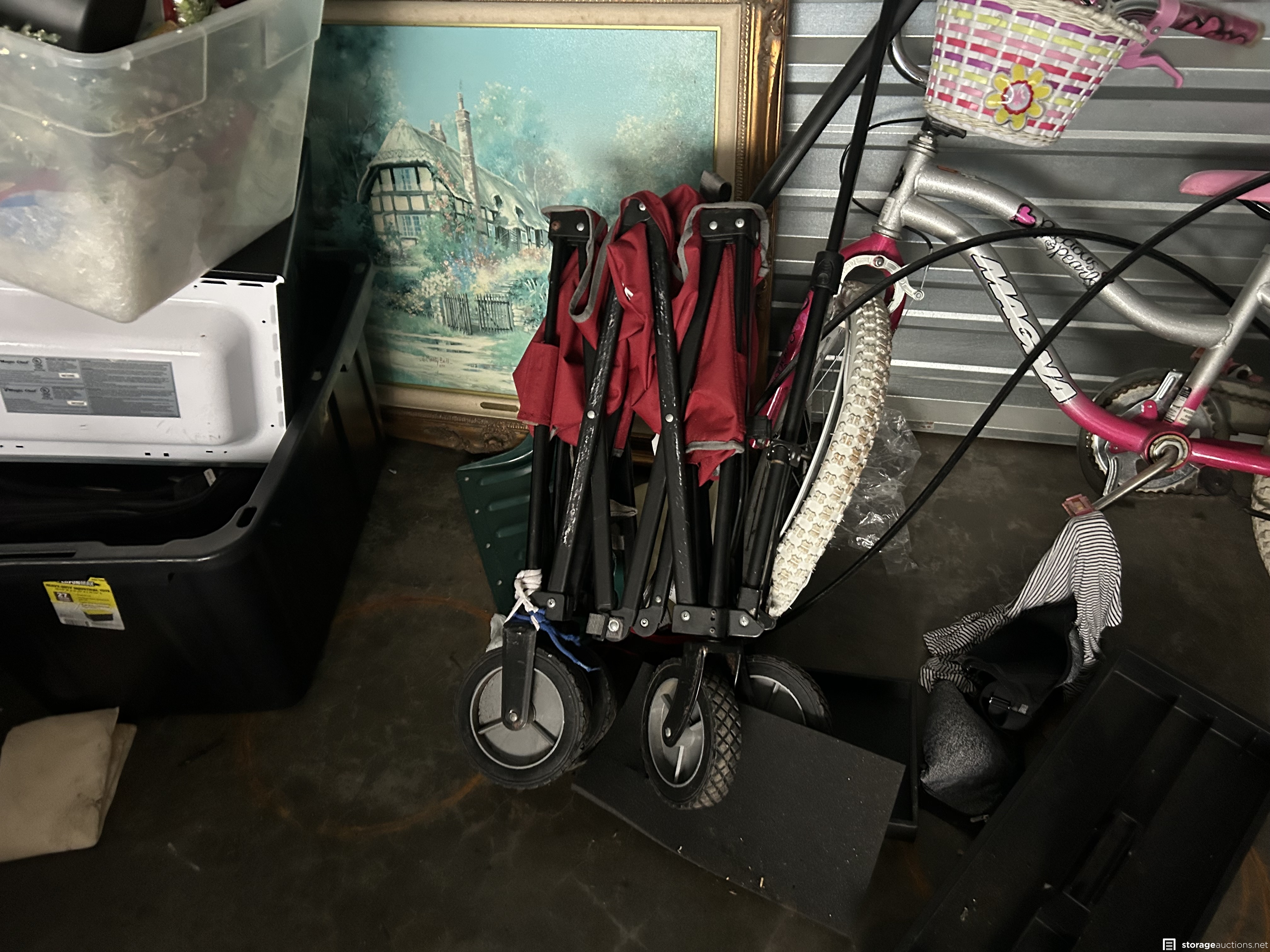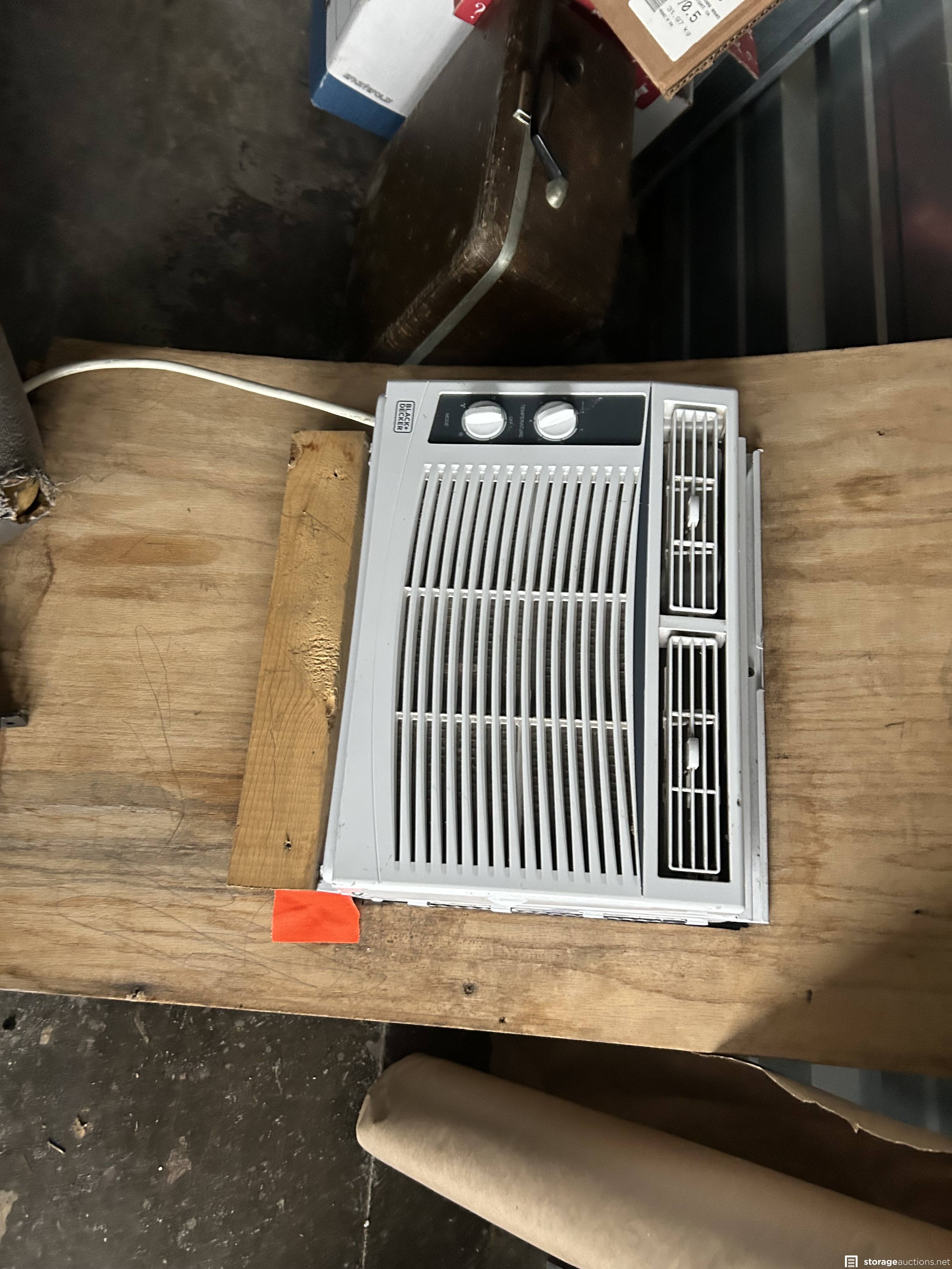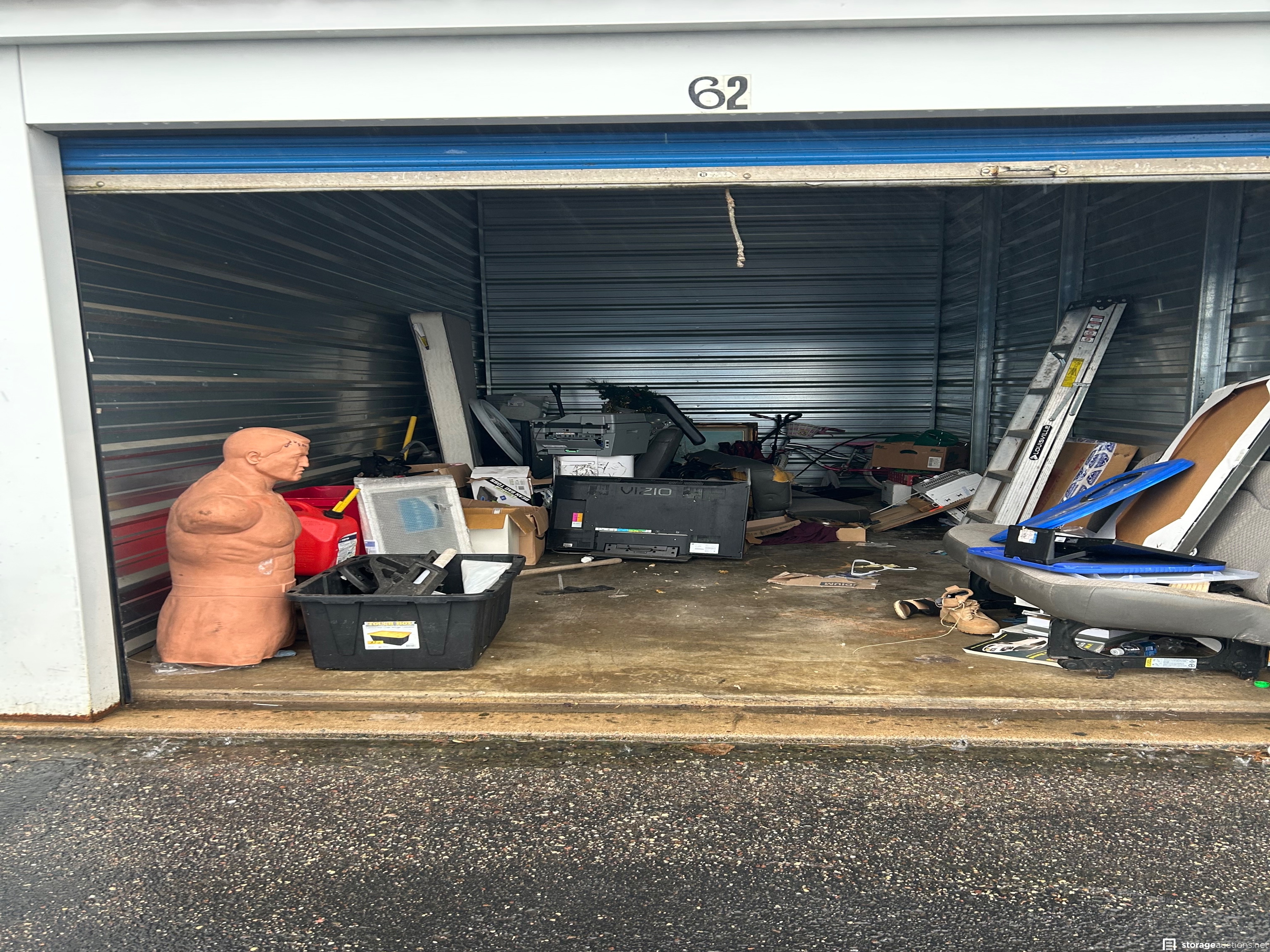 This unit appears to contain Window air conditioner, new small window, girls magna bike, tree holder, 6’ aluminum ladder, Vizio TV, boxing practice dummy, bins, frames, beverage cooler, portable air conditioner, weed eater, large clock, door, bean bag toss game in box, wagon, and more