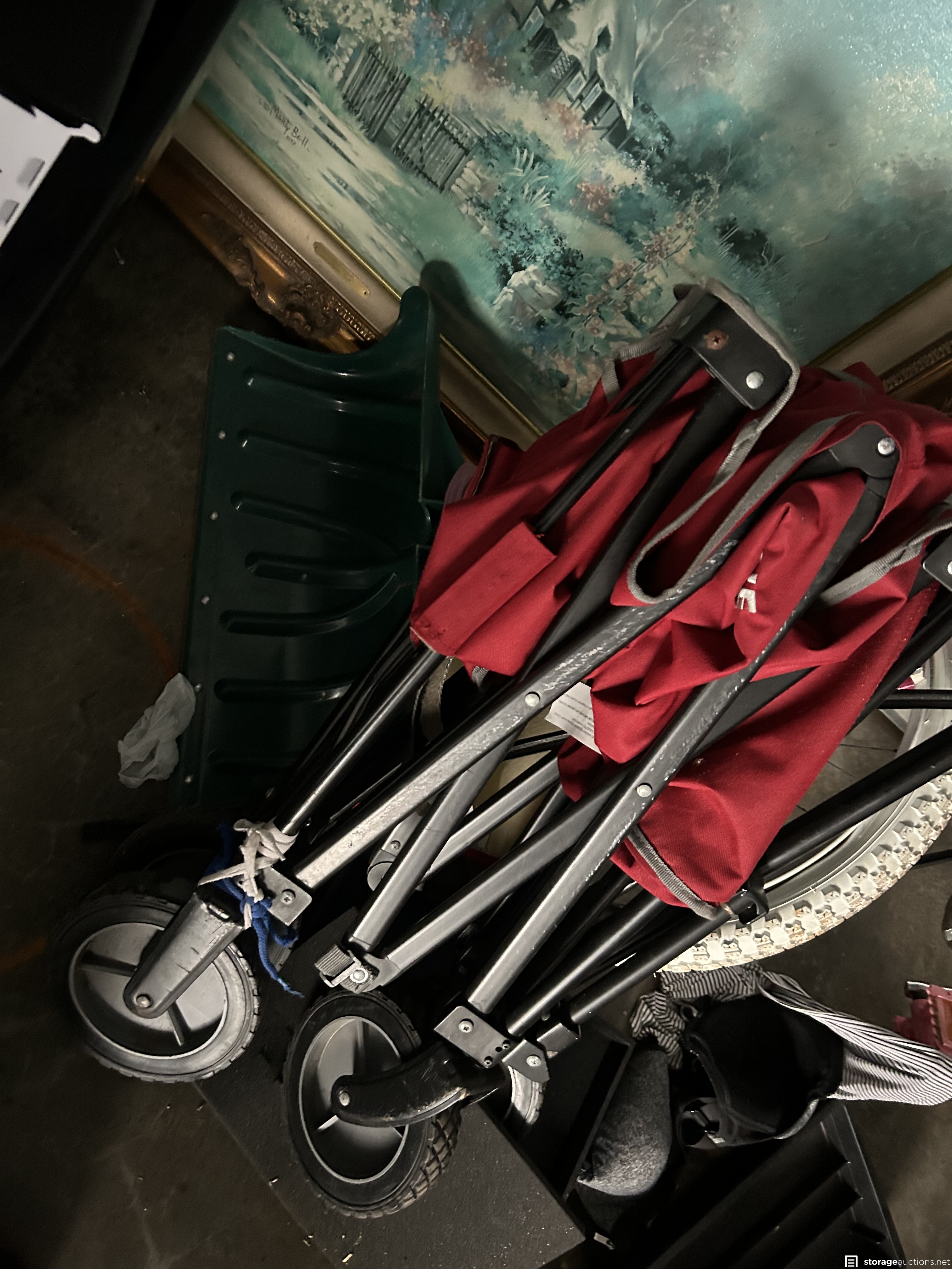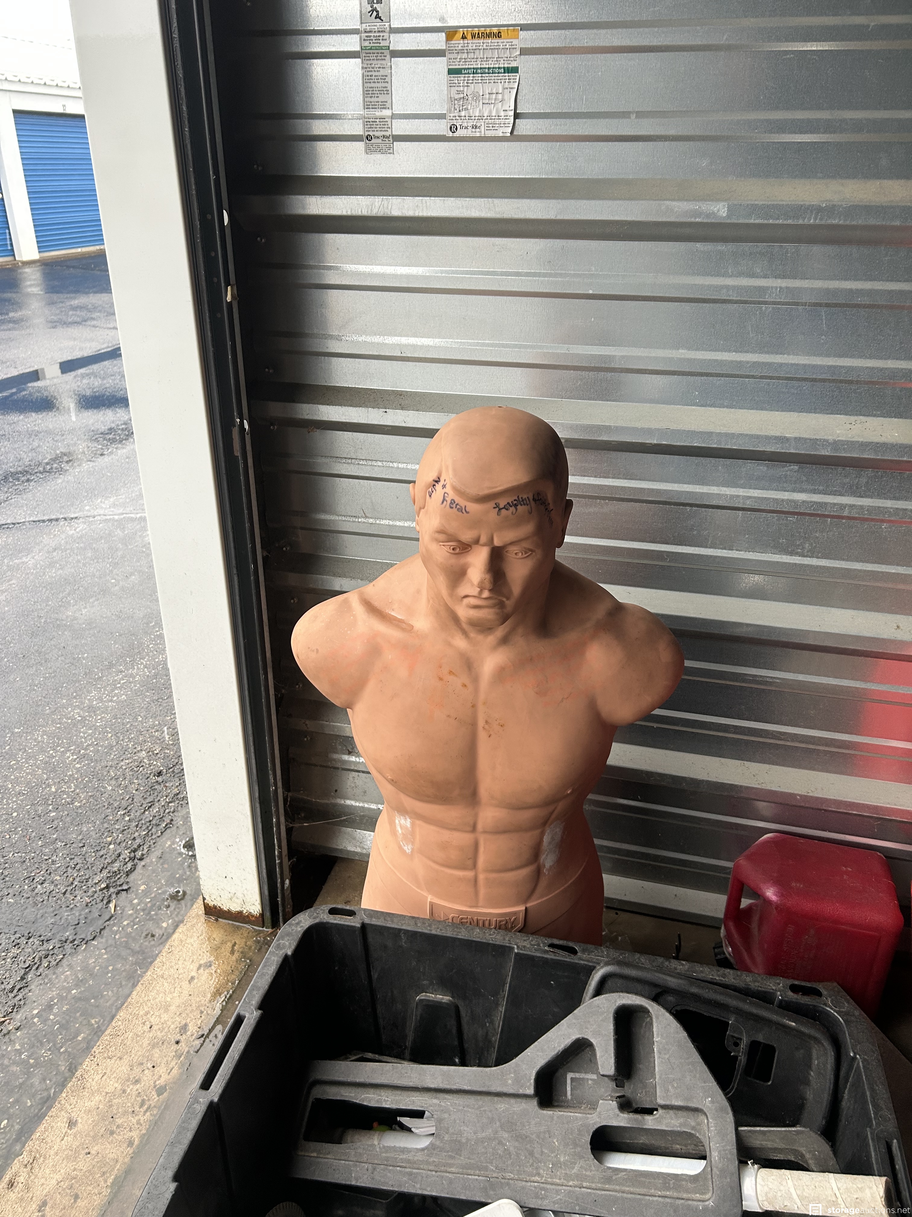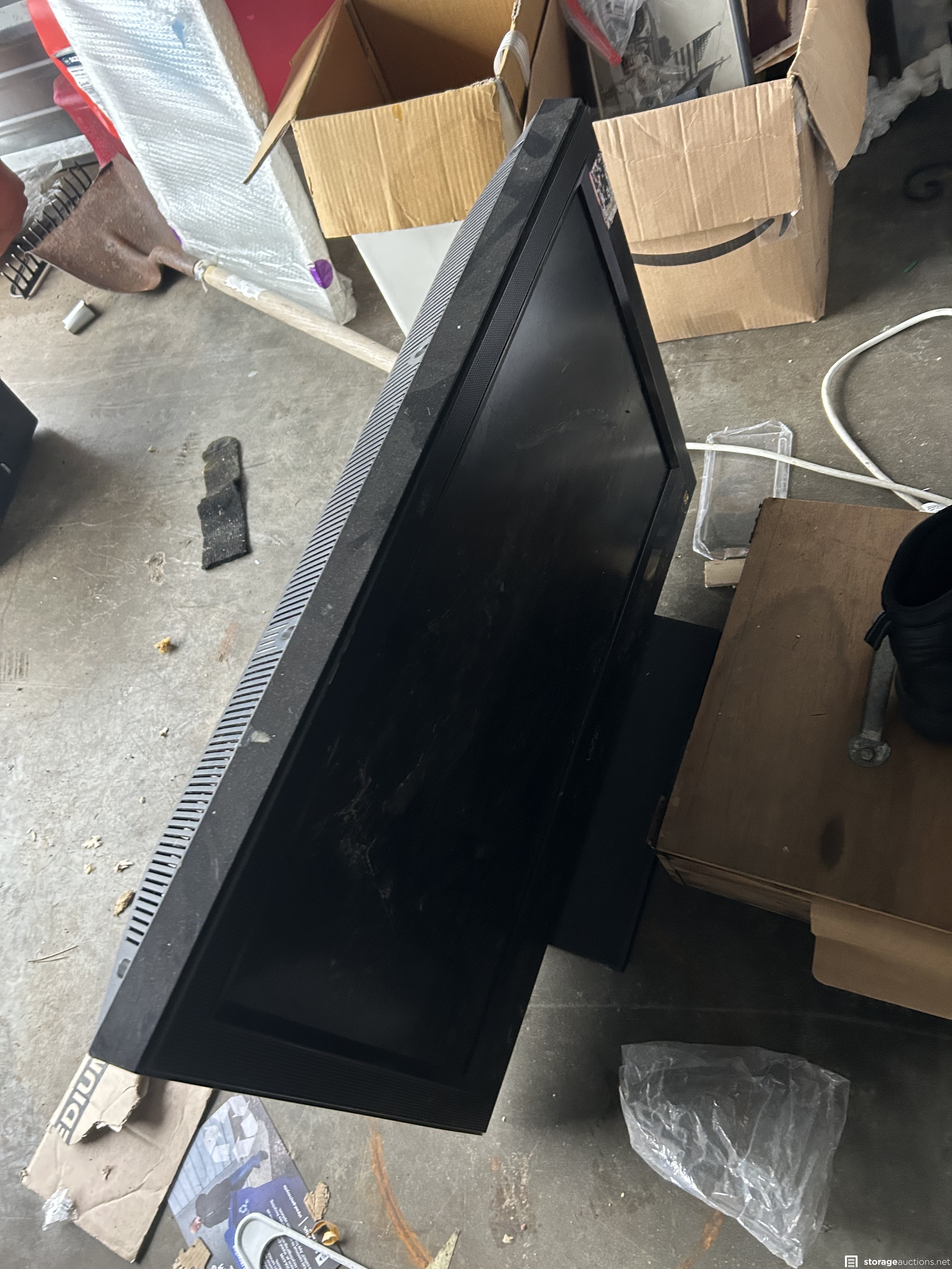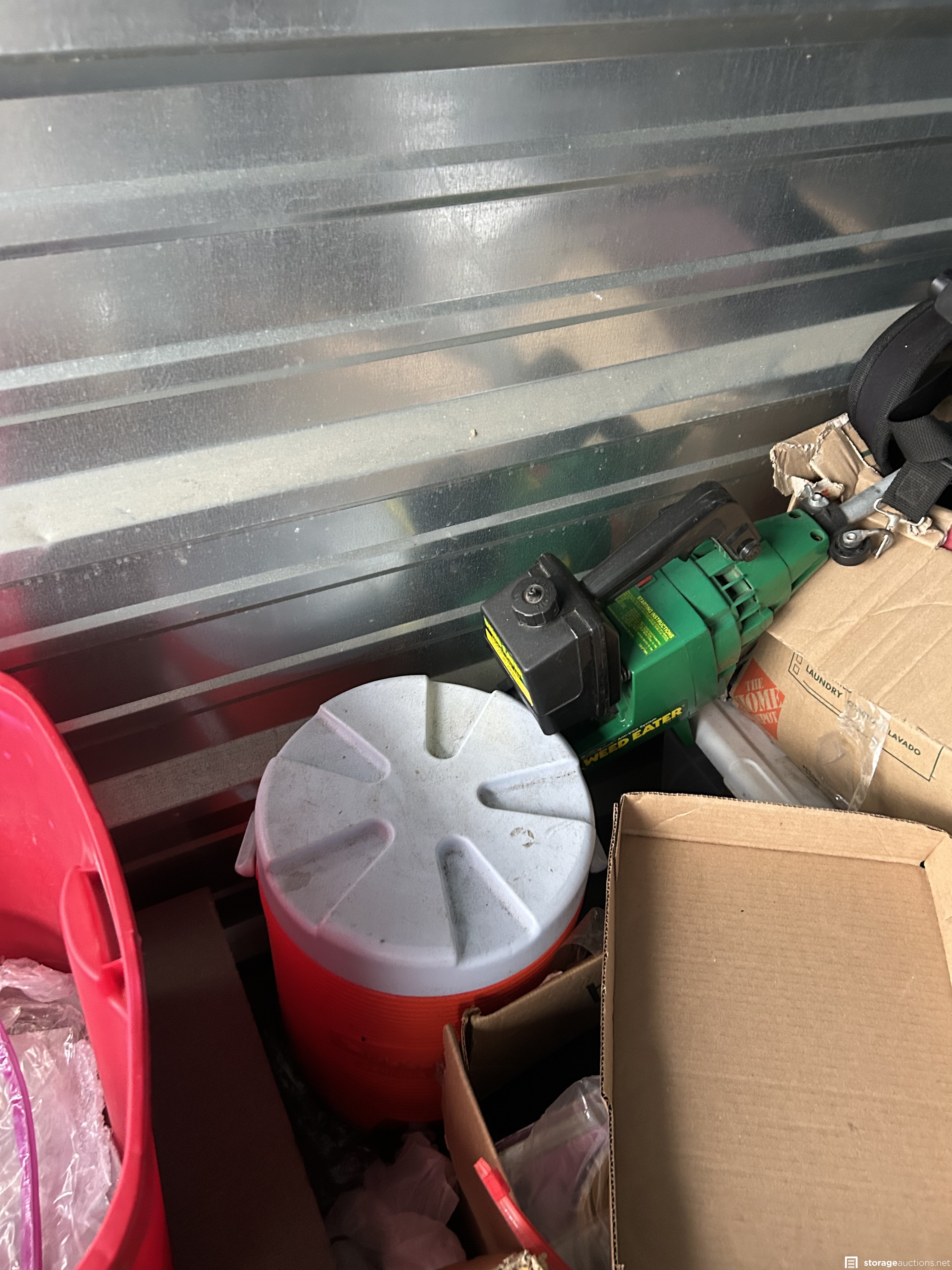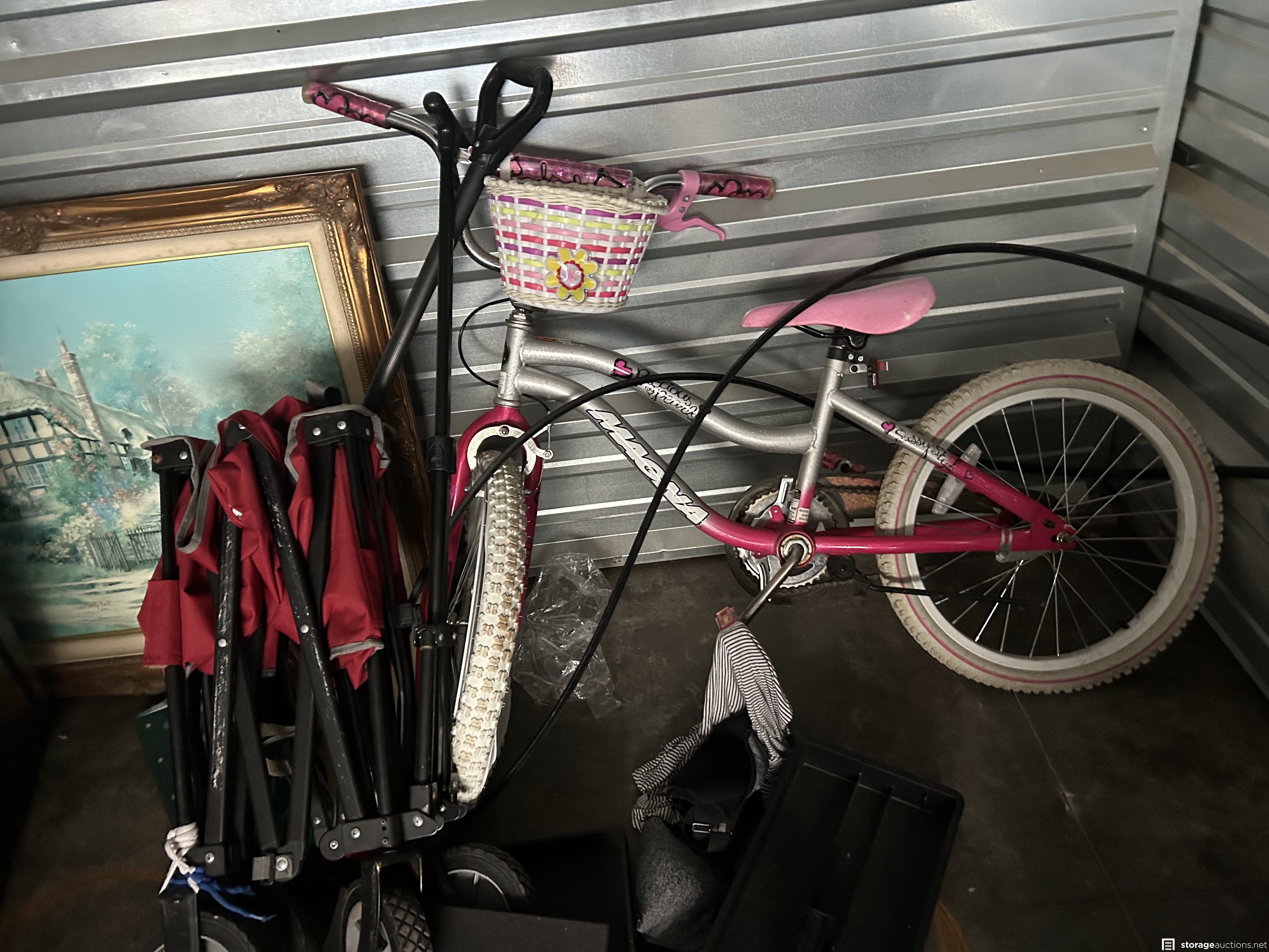 This unit appears to contain Window air conditioner, new small window, girls magna bike, tree holder, 6’ aluminum ladder, Vizio TV, boxing practice dummy, bins, frames, beverage cooler, portable air conditioner, weed eater, large clock, door, bean bag toss game in box, wagon, and more