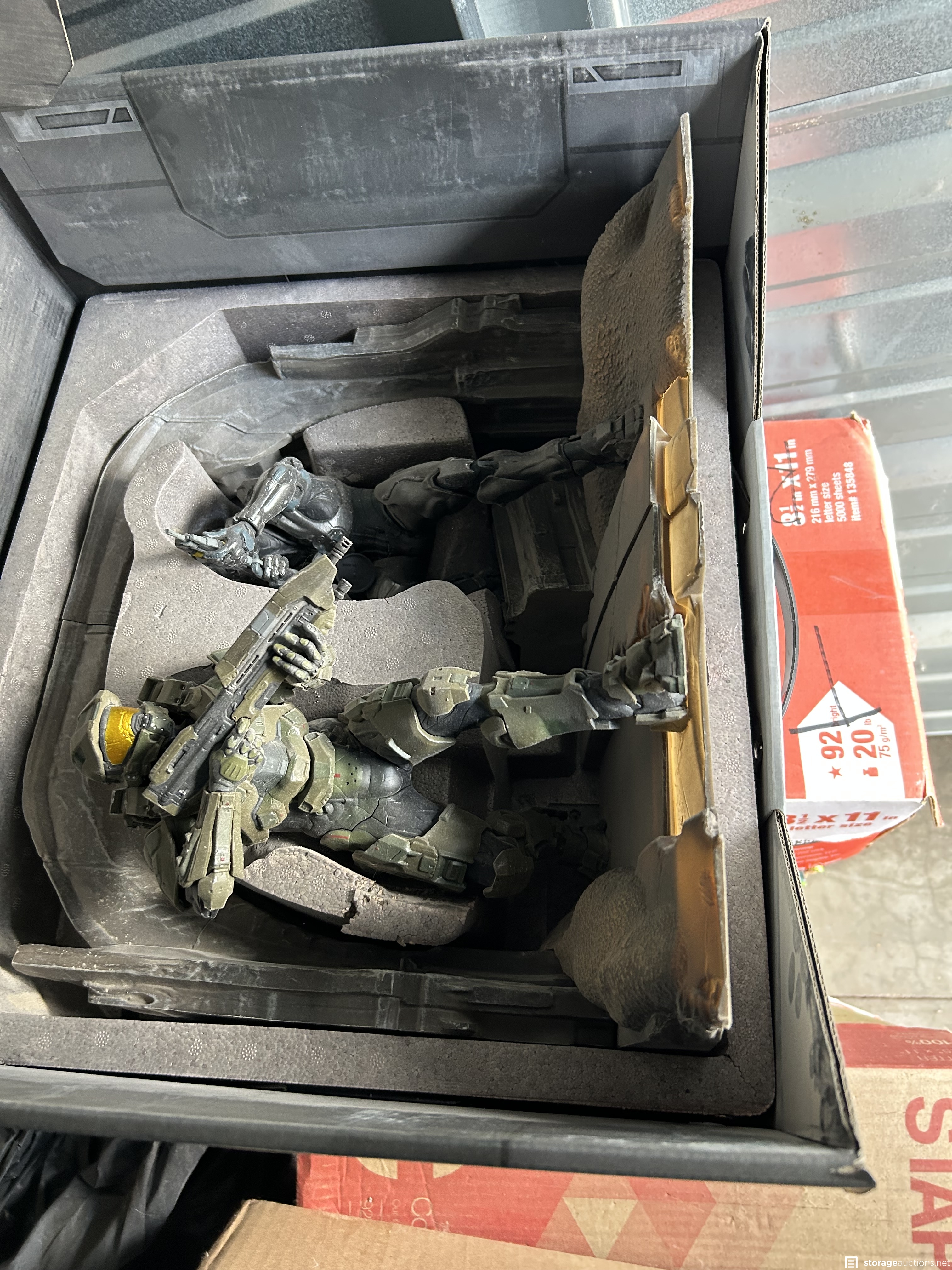 Vizio TV, UNSC action figures, books, cleaning supplies, clothing, boxes unknown, outdoor games, and more