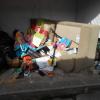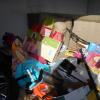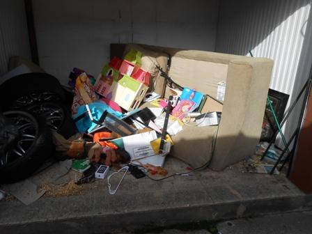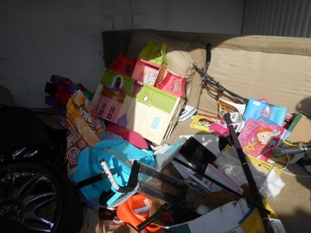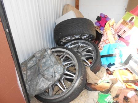 This unit appears to contain boxes, clothes, toys, rims, couch and other household items