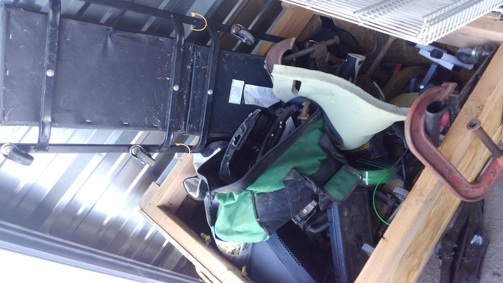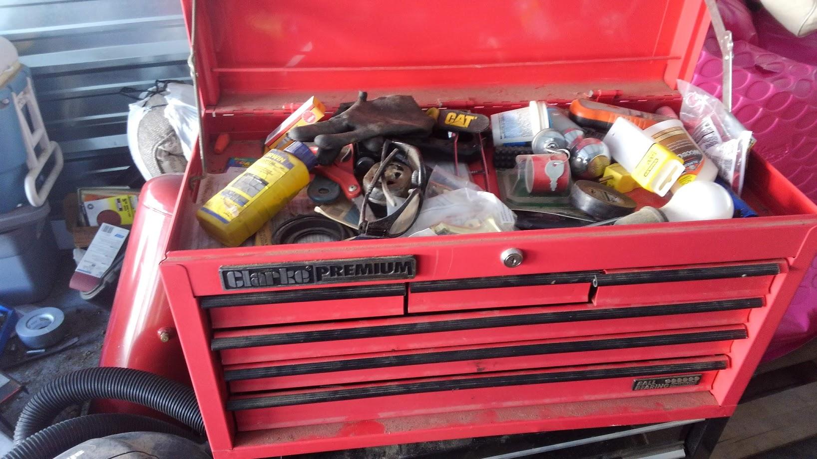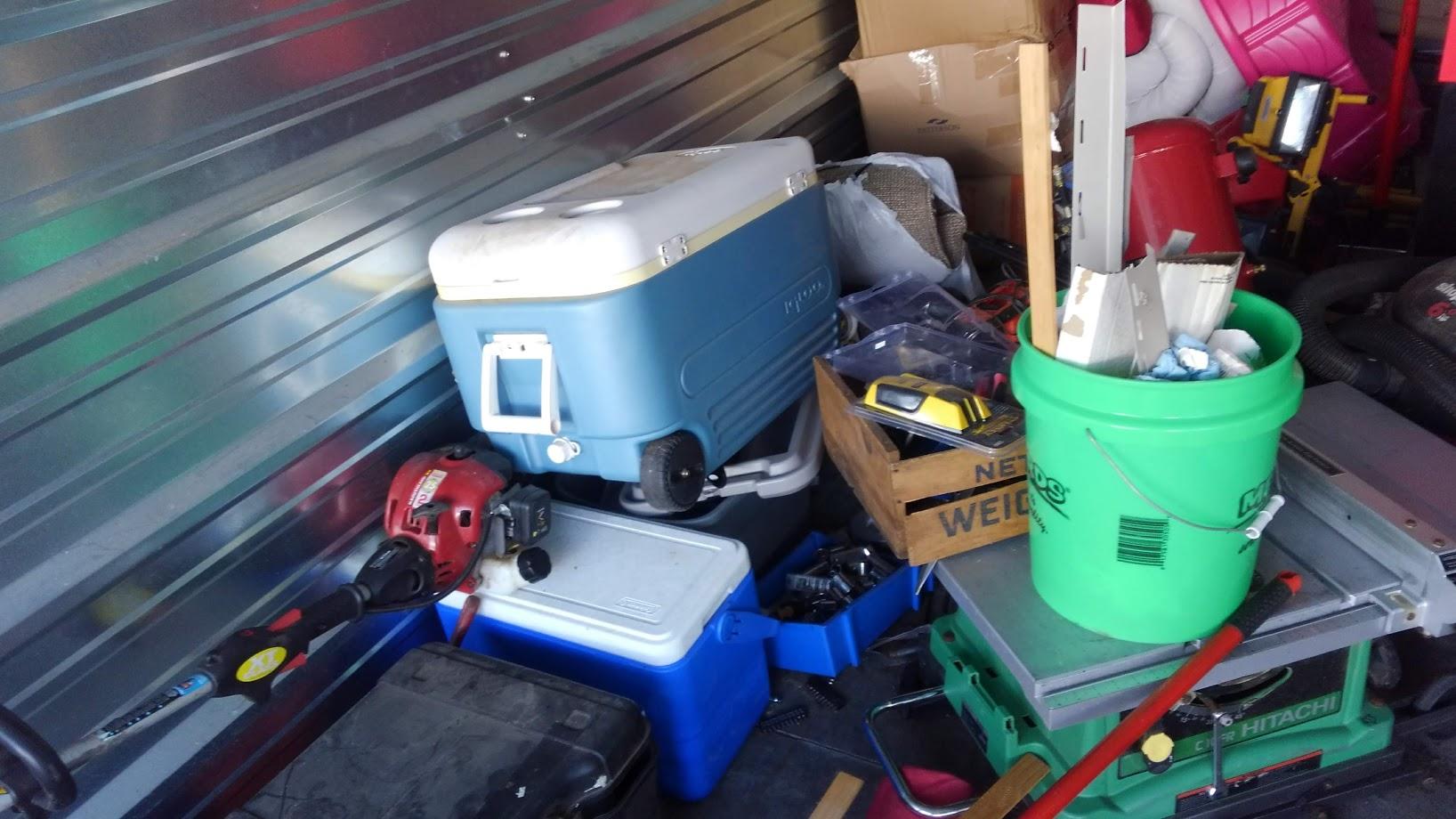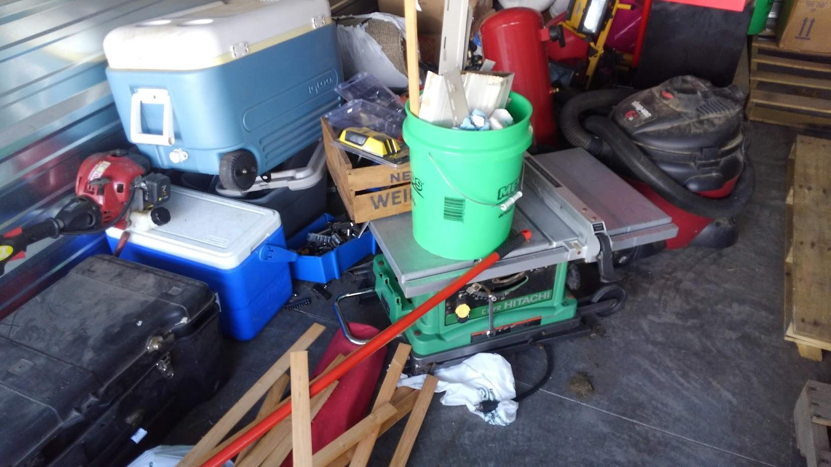 This unit appears to contain tool drawers, mechanics dolly, propane tank. Hitachi table saw, cordless tools, welder's helmet, construction light, printer, wire, wire shelves, gas tanks, nice large cooler, 2 other coolers, large shop vac, drill bits, books, hardware, boxes of items. tool bag, caulk, and miscellaneous.