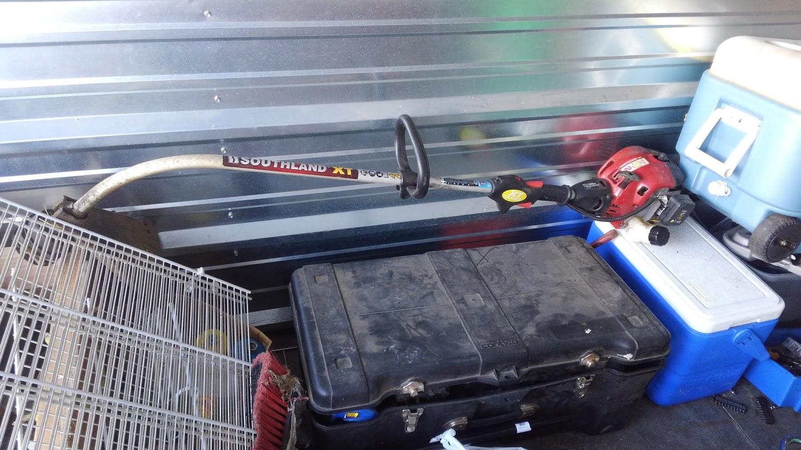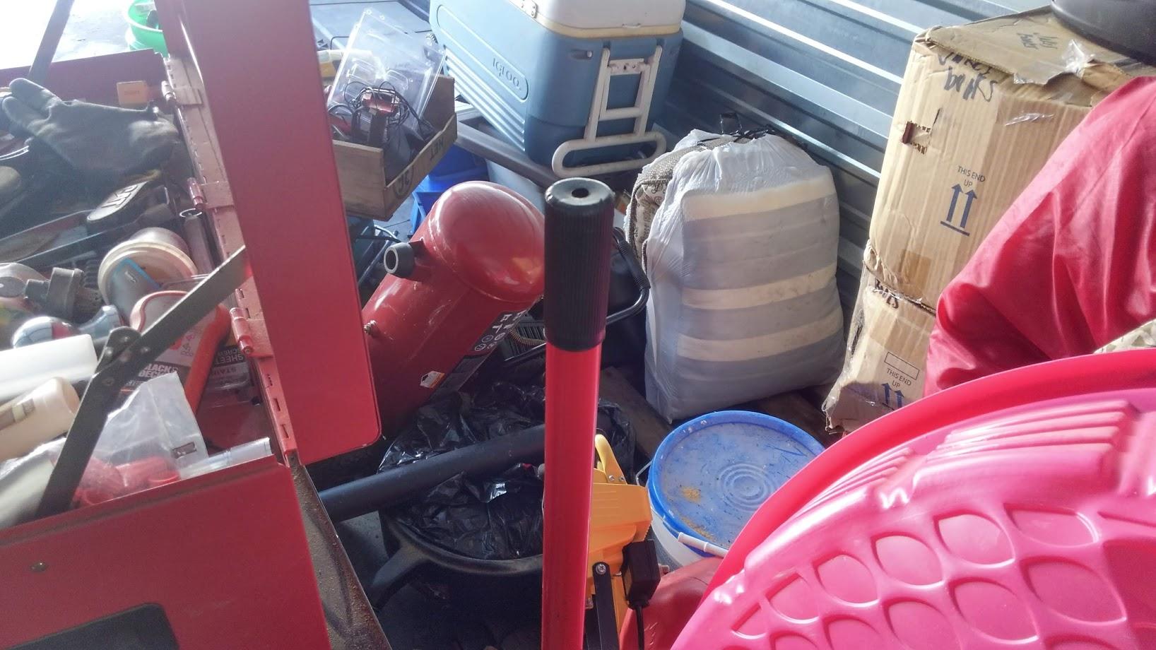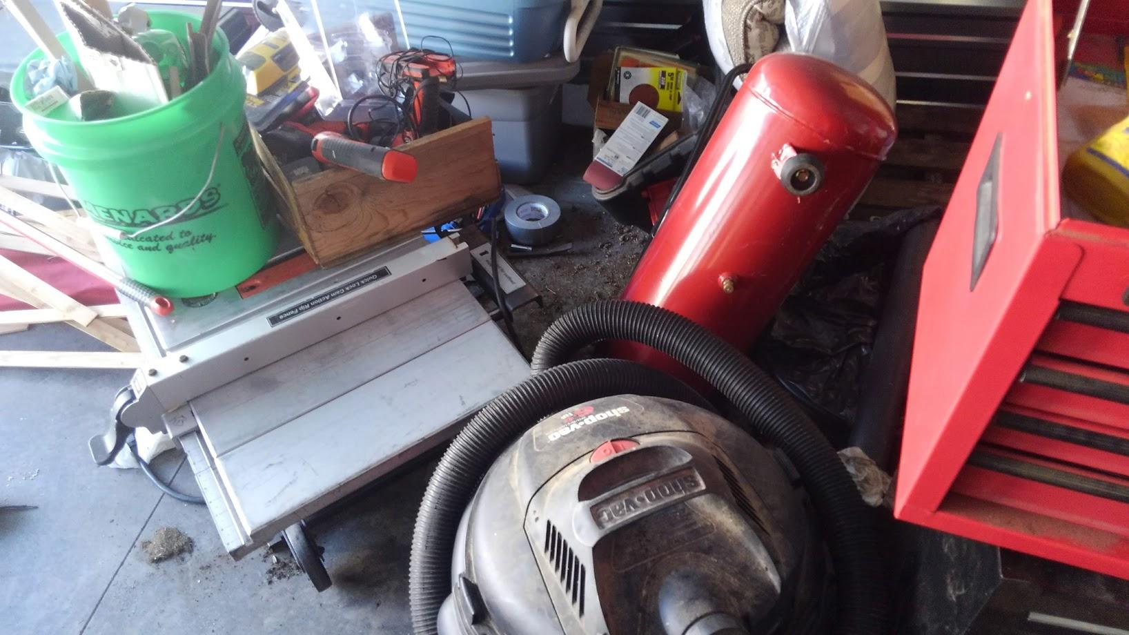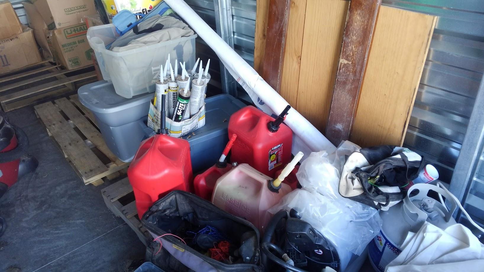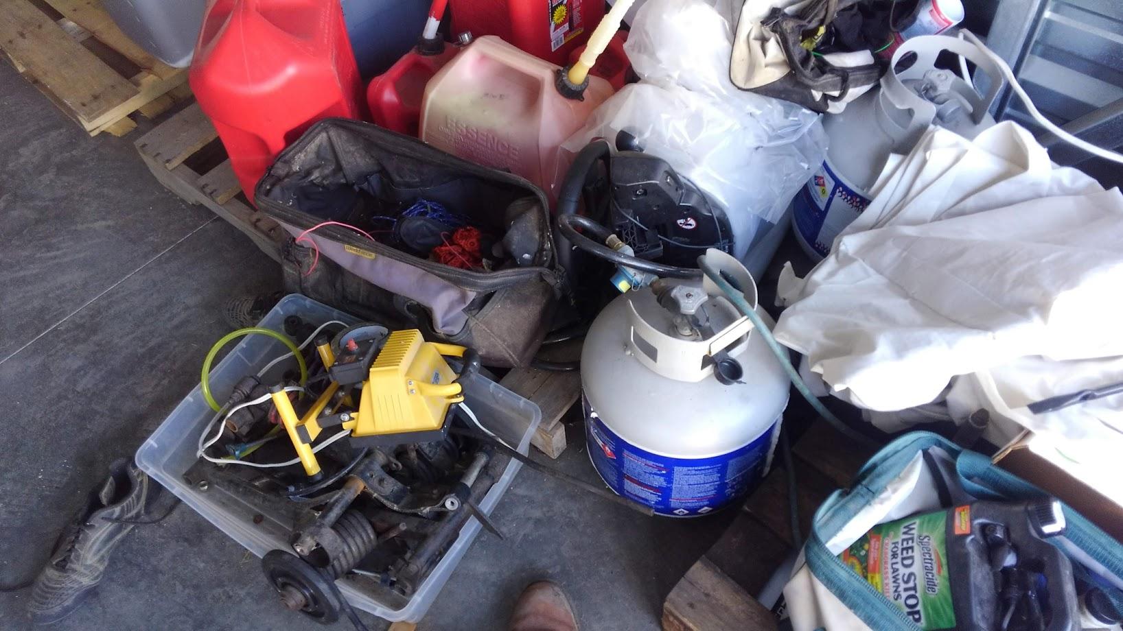 This unit appears to contain tool drawers, mechanics dolly, propane tank. Hitachi table saw, cordless tools, welder's helmet, construction light, printer, wire, wire shelves, gas tanks, nice large cooler, 2 other coolers, large shop vac, drill bits, books, hardware, boxes of items. tool bag, caulk, and miscellaneous.