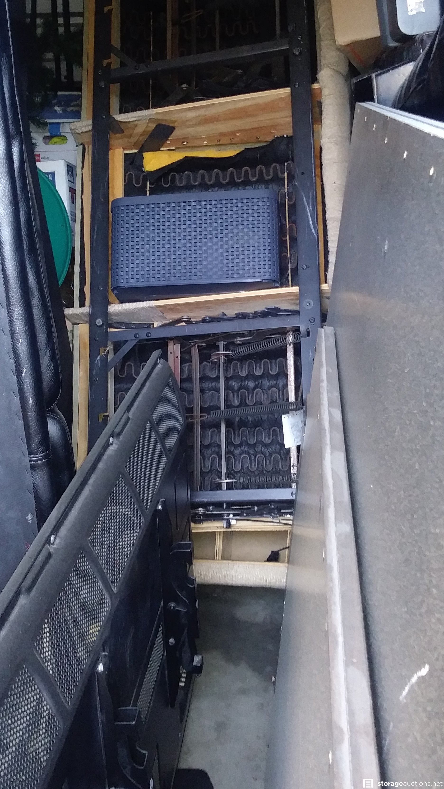 unit appears to contain: boxes, chairs, couches, cabinets, fan, totes, TV, crates, shelves