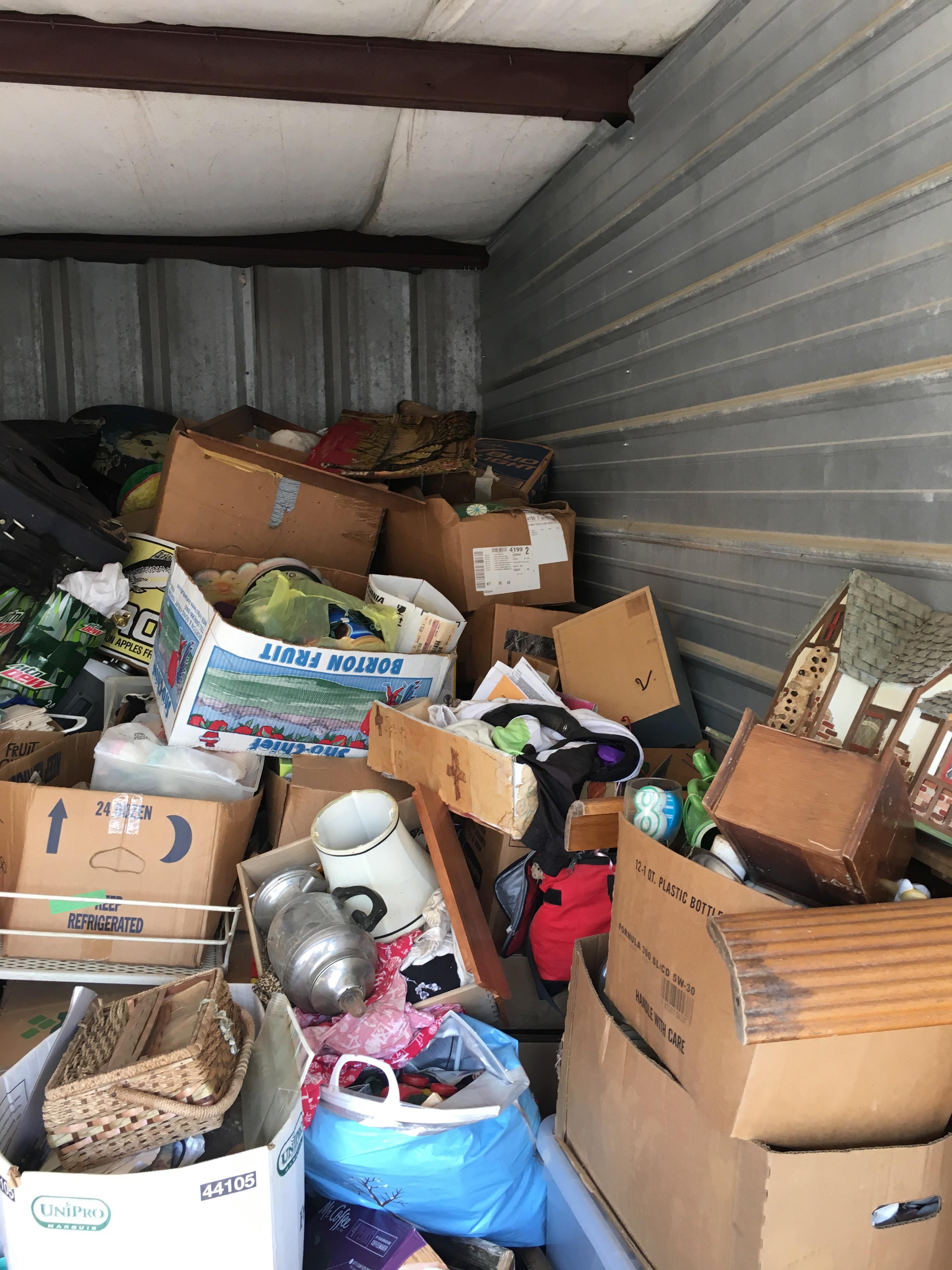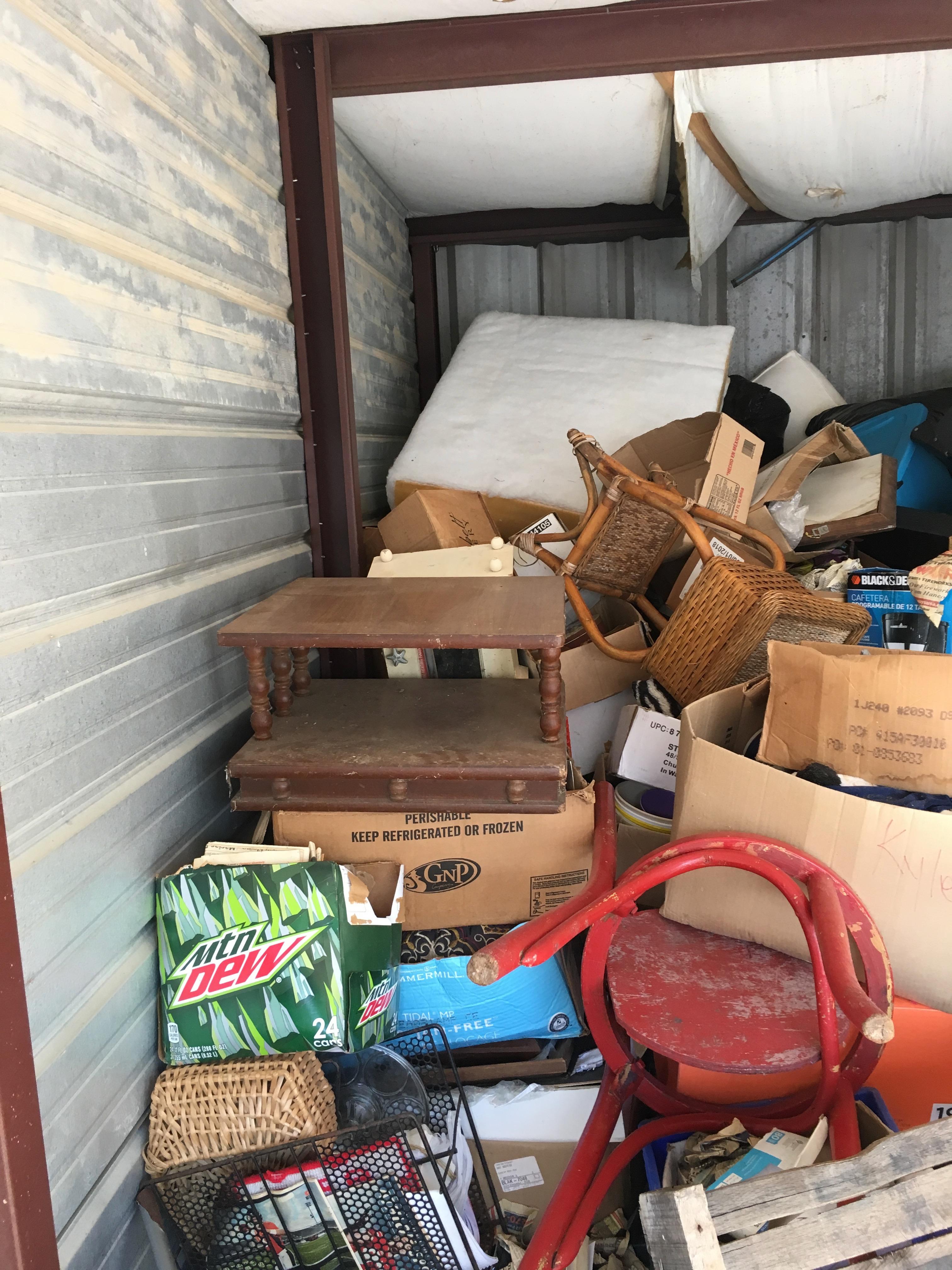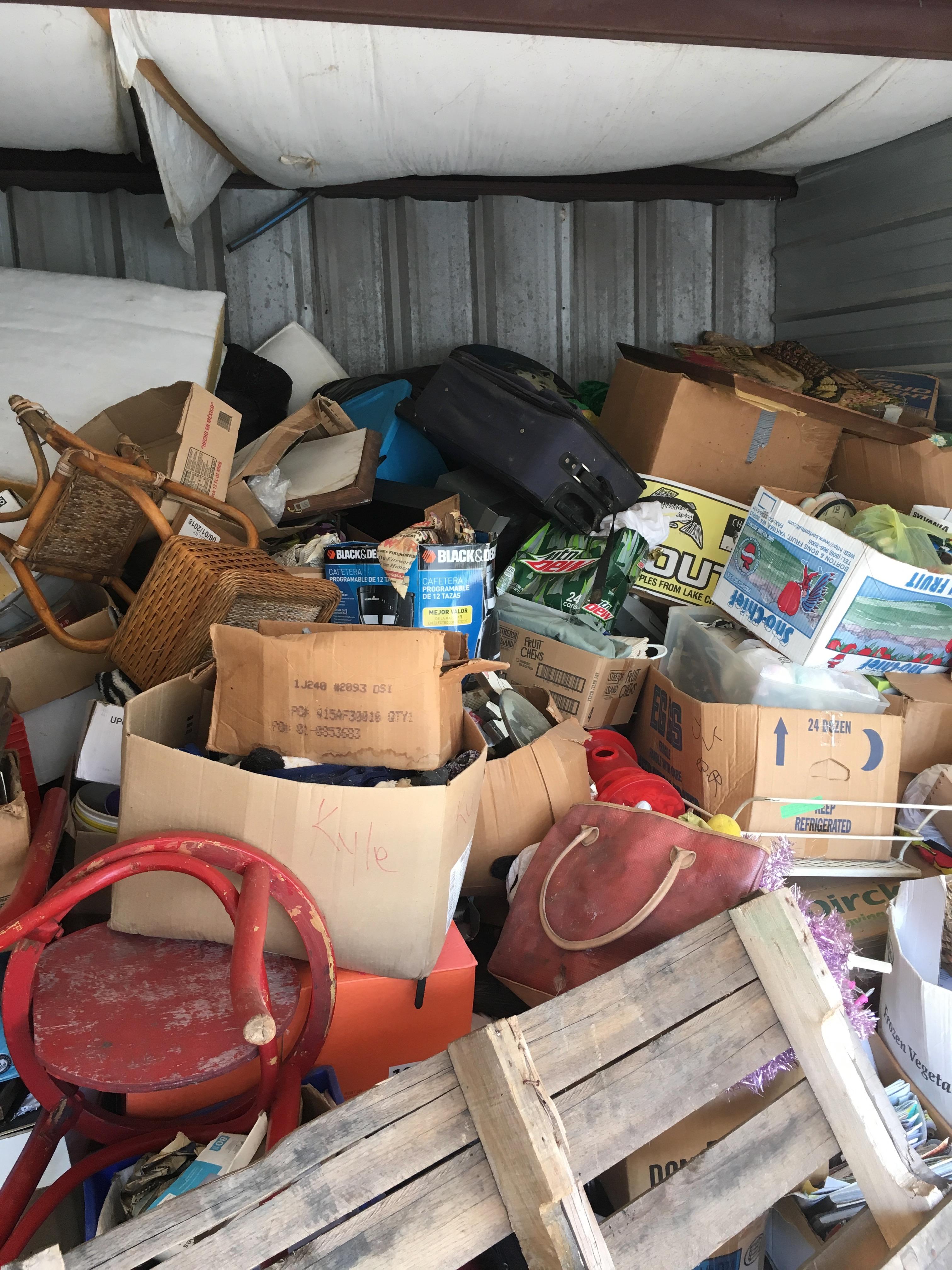 Radiant Heater, computer, tables, suitcases, plastic totes, boxes of stuff.