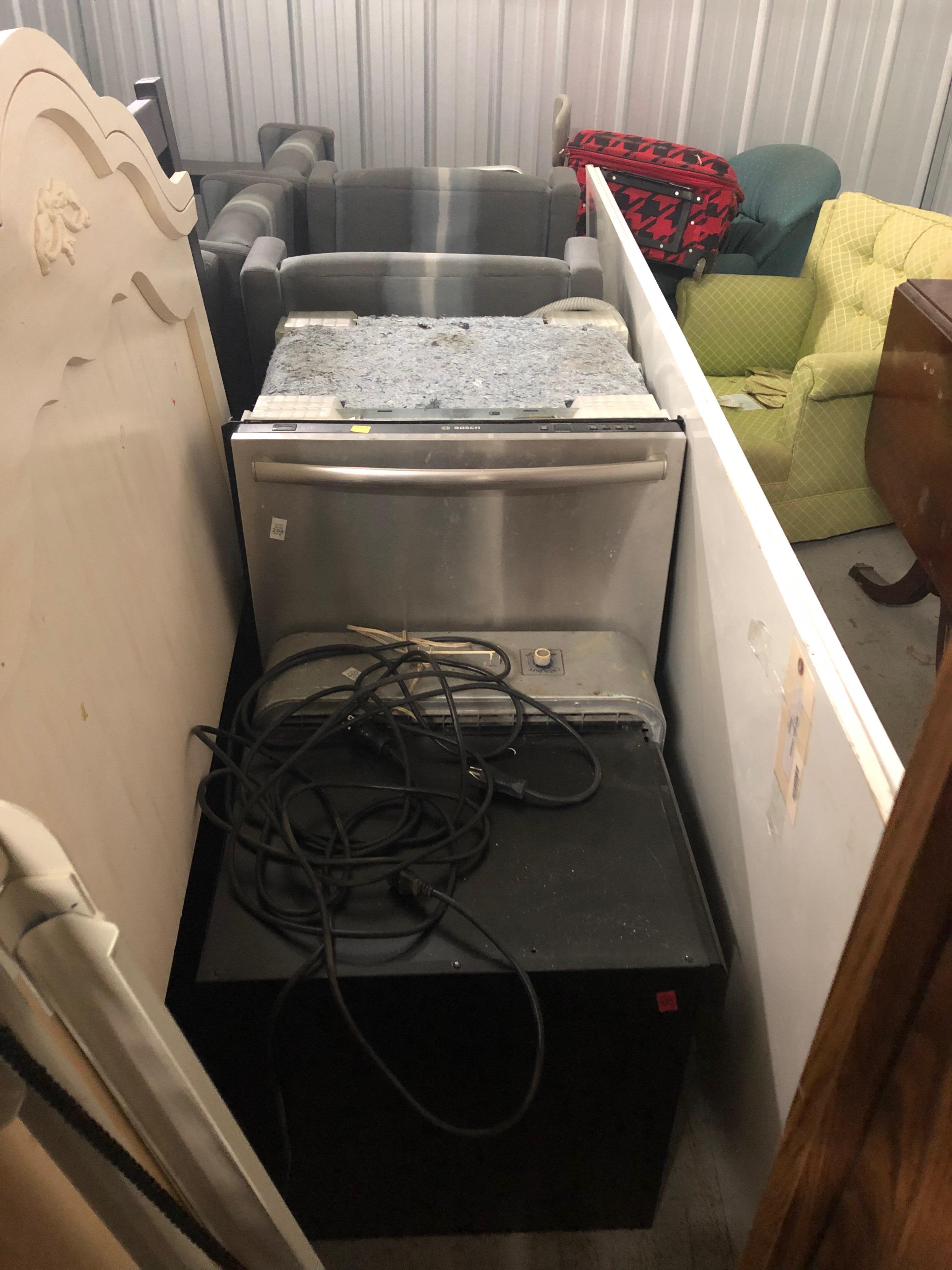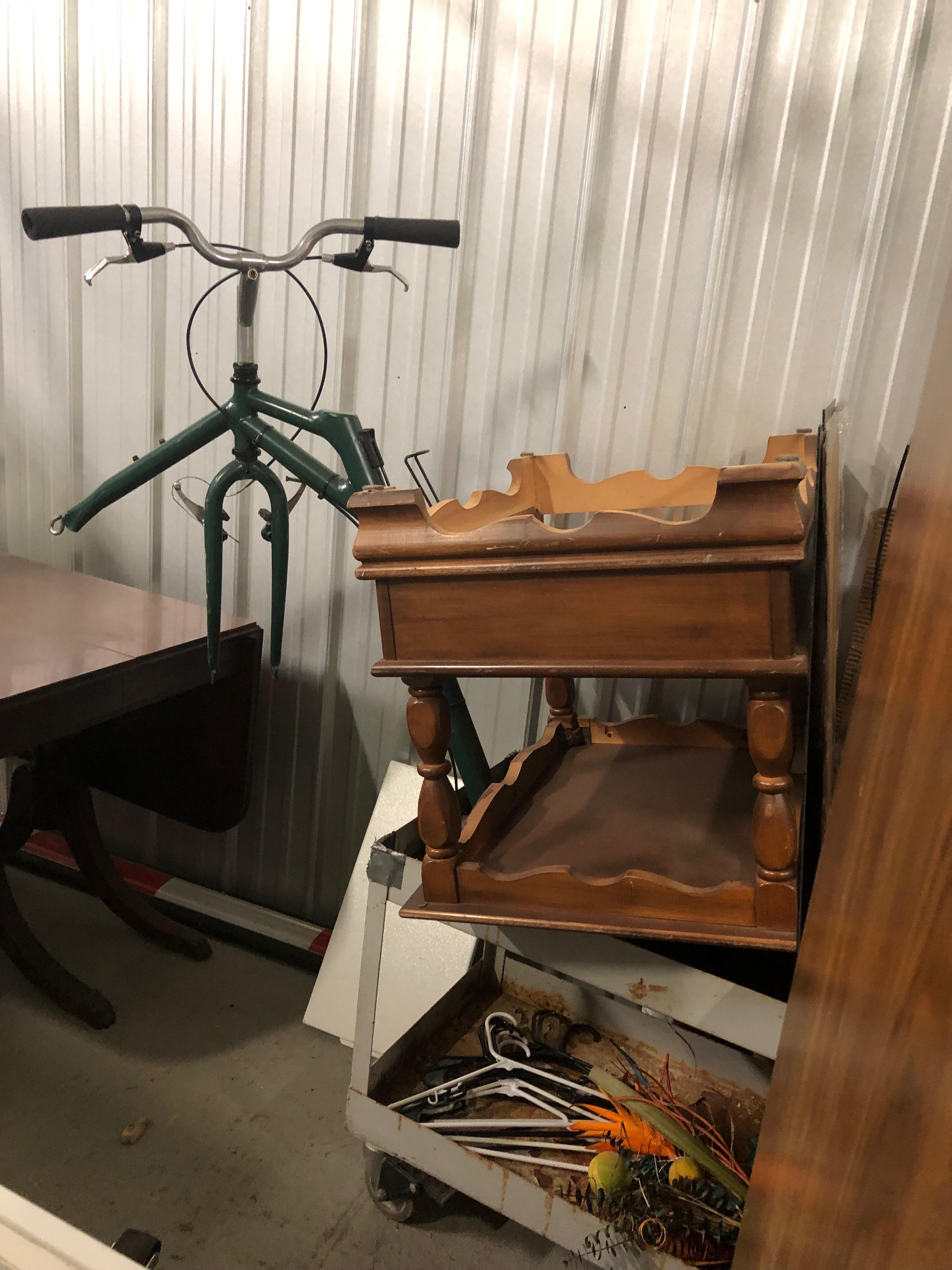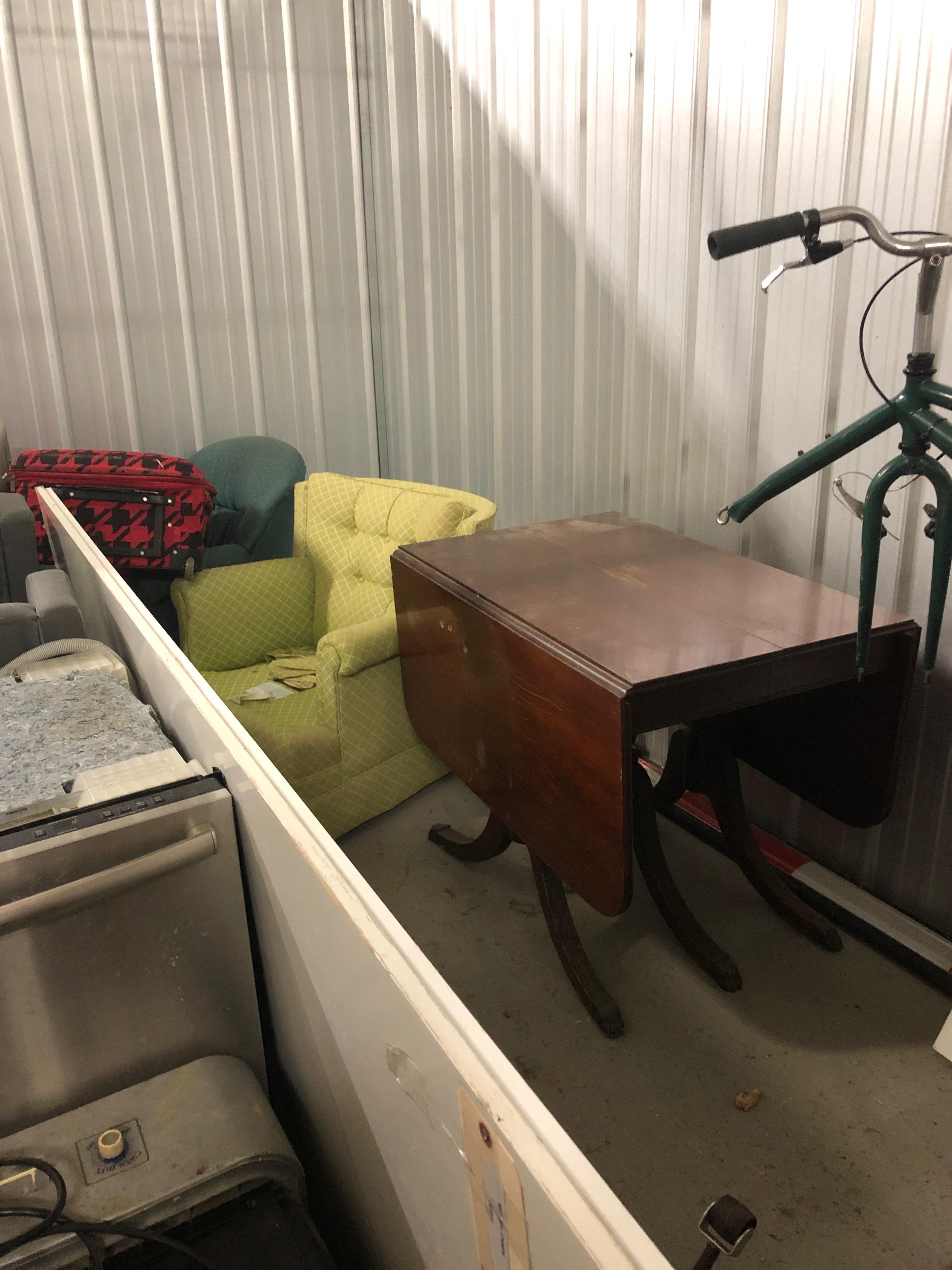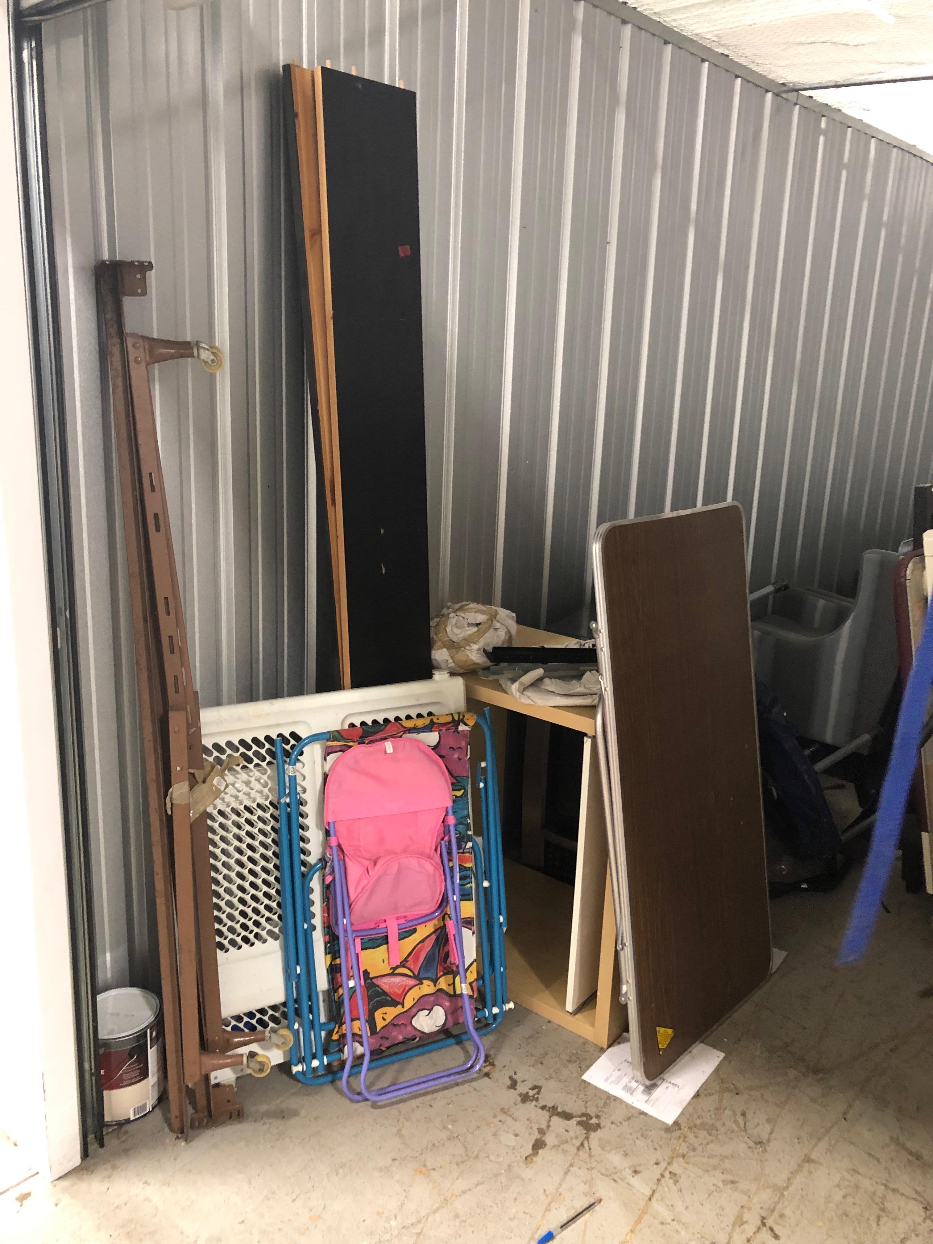 Unit Contents: Small trampoline, toys, bed frame, baby gate, folding table, desk, purse, photography reflector and tripod, suitcase, bicycle frame, chairs, end table, dining table, dishwasher, mini refrigerator, and 6 matching cushioned chairs.