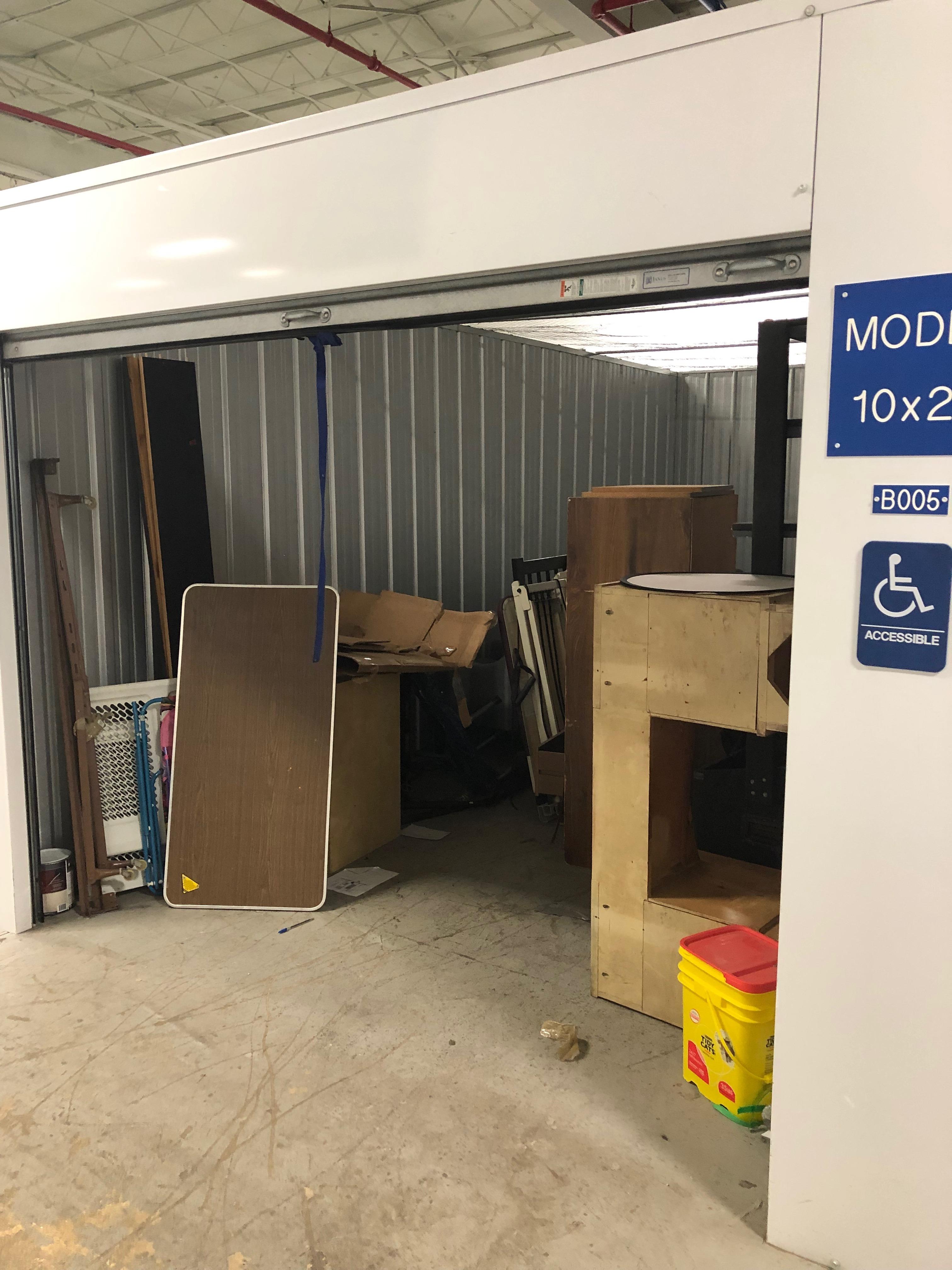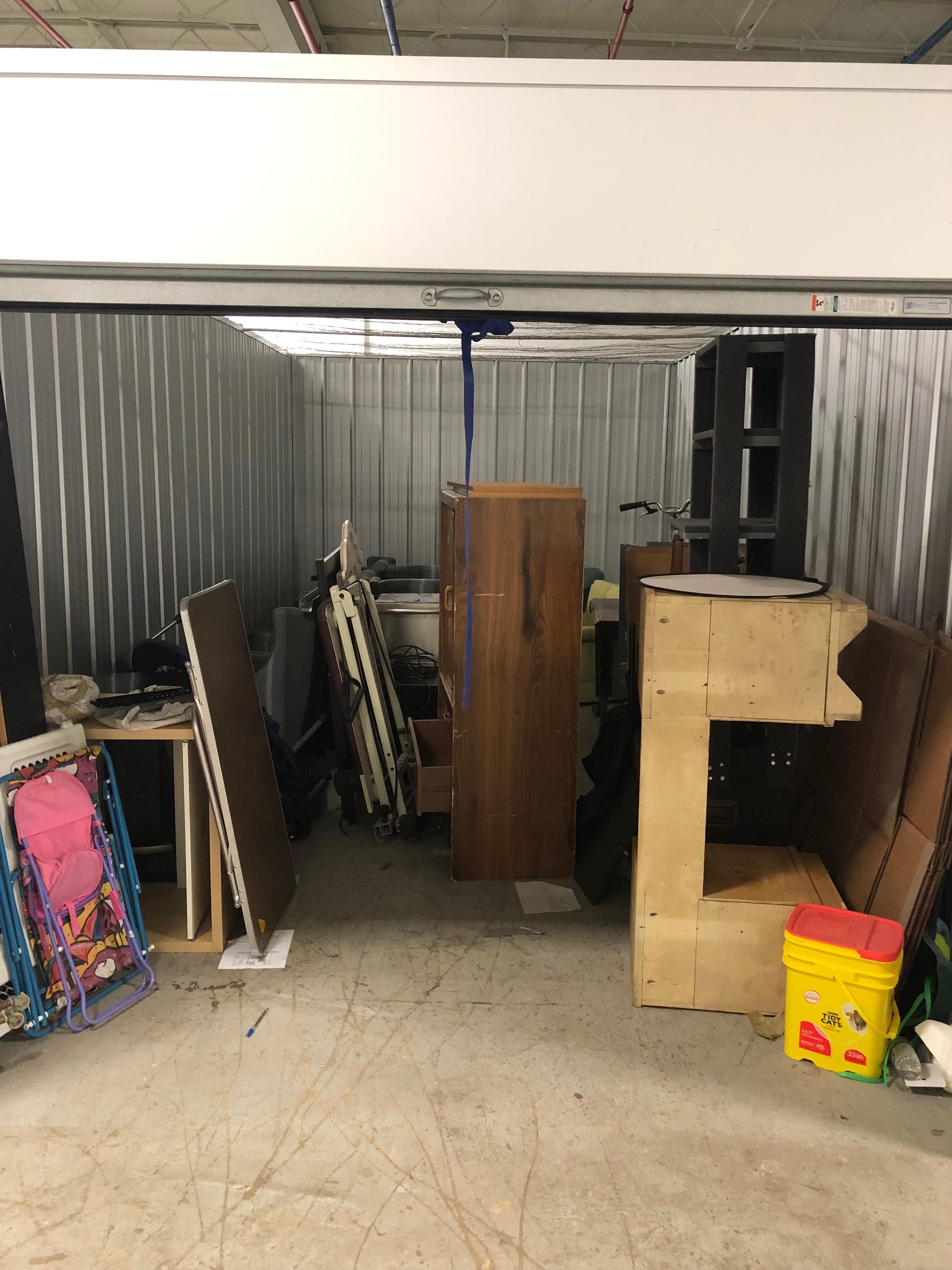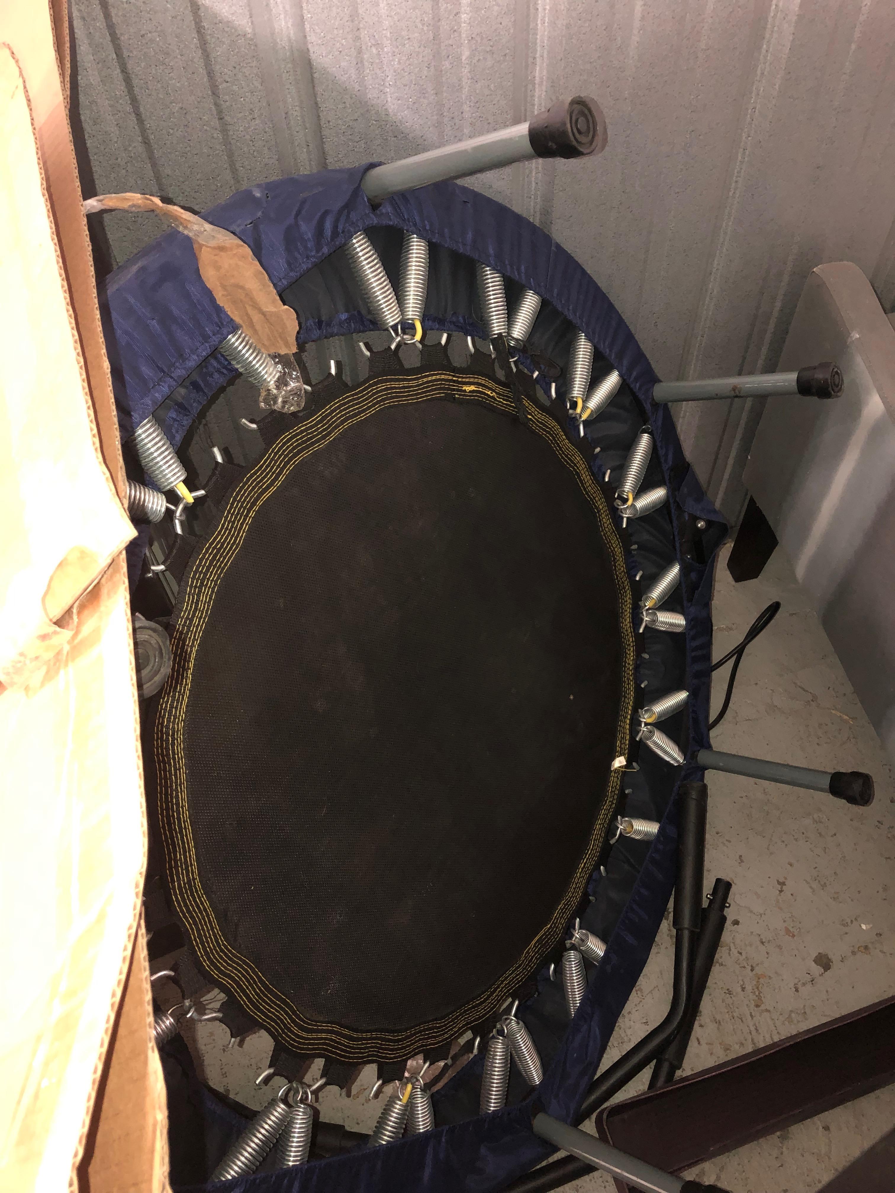 Unit Contents: Small trampoline, toys, bed frame, baby gate, folding table, desk, purse, photography reflector and tripod, suitcase, bicycle frame, chairs, end table, dining table, dishwasher, mini refrigerator, and 6 matching cushioned chairs.