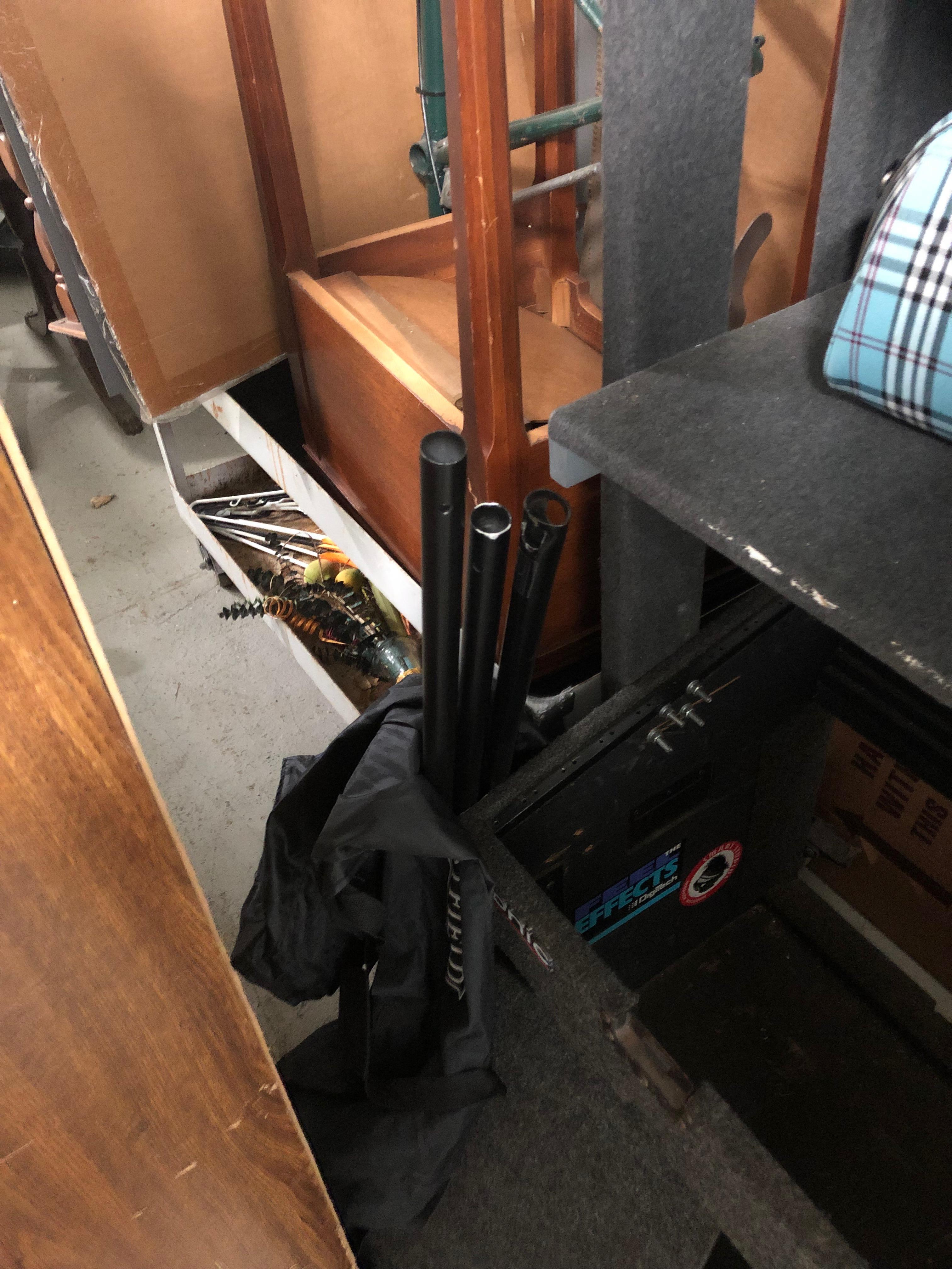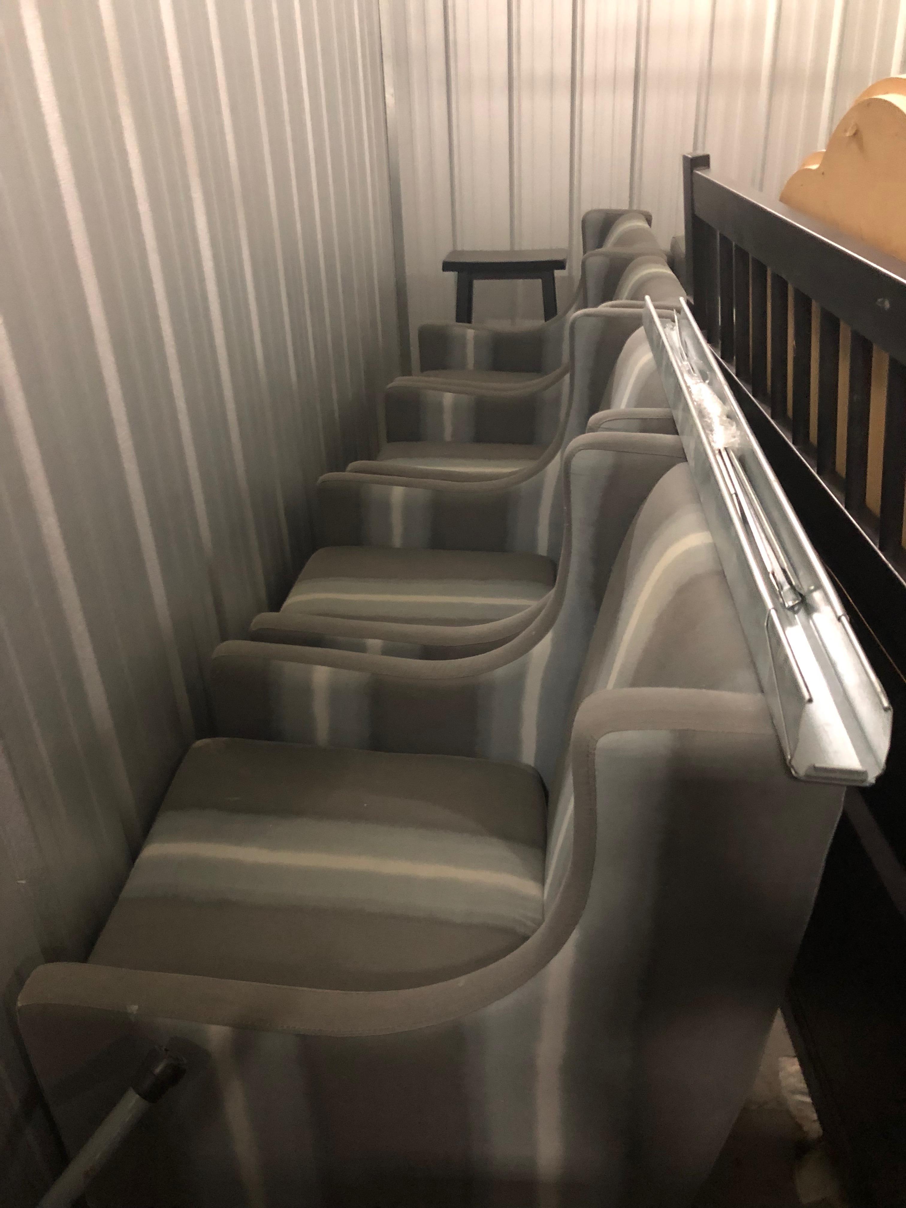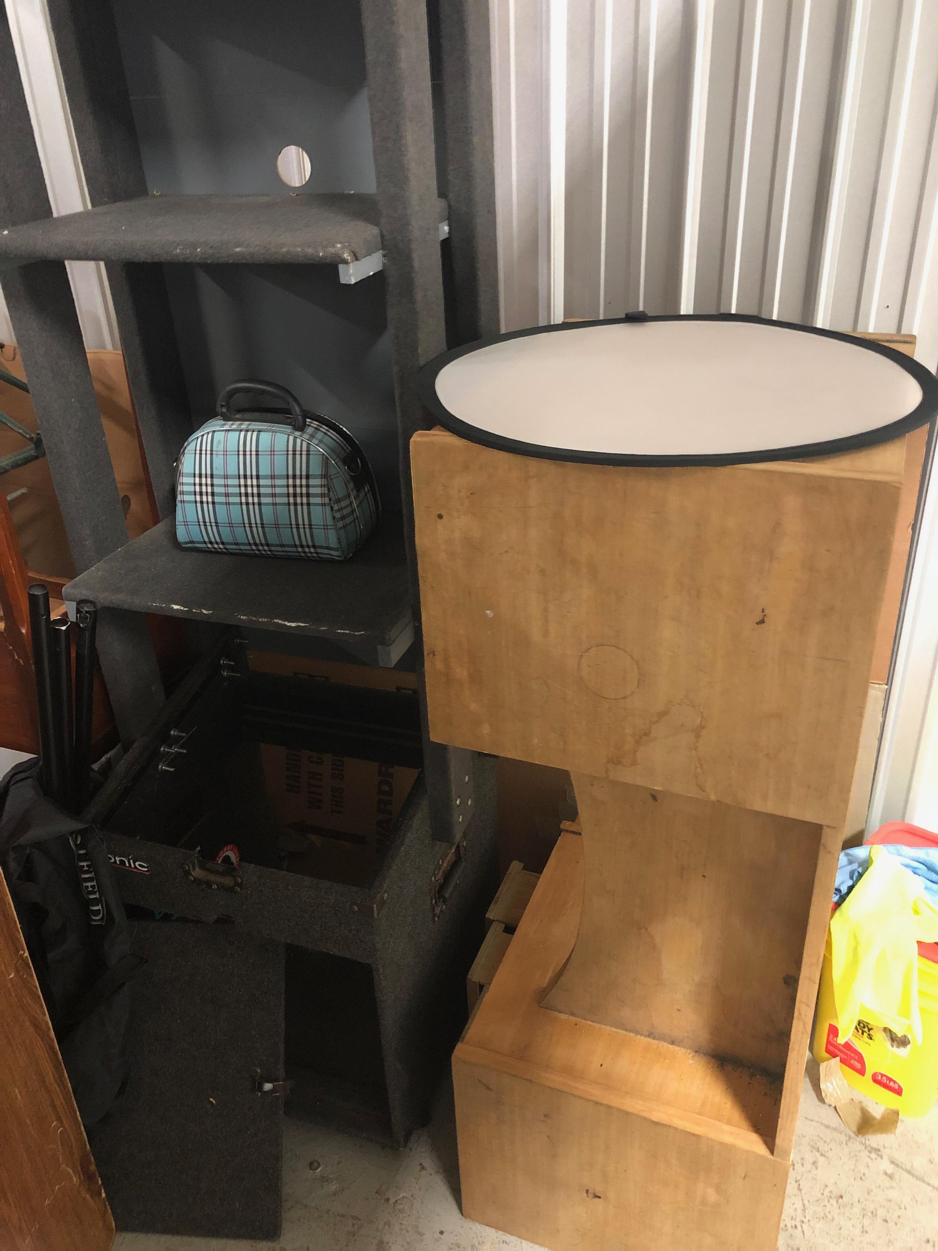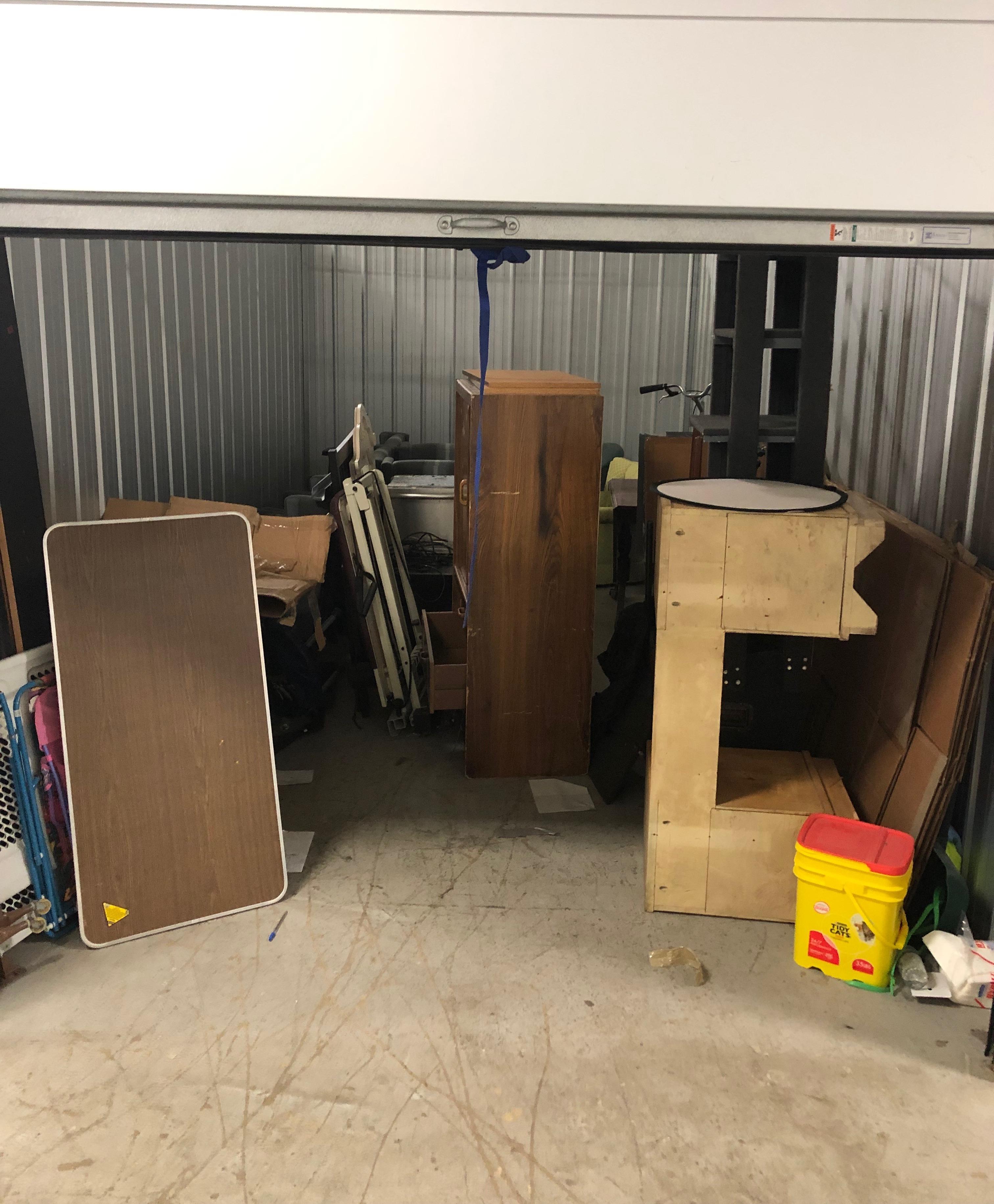 Unit Contents: Small trampoline, toys, bed frame, baby gate, folding table, desk, purse, photography reflector and tripod, suitcase, bicycle frame, chairs, end table, dining table, dishwasher, mini refrigerator, and 6 matching cushioned chairs.