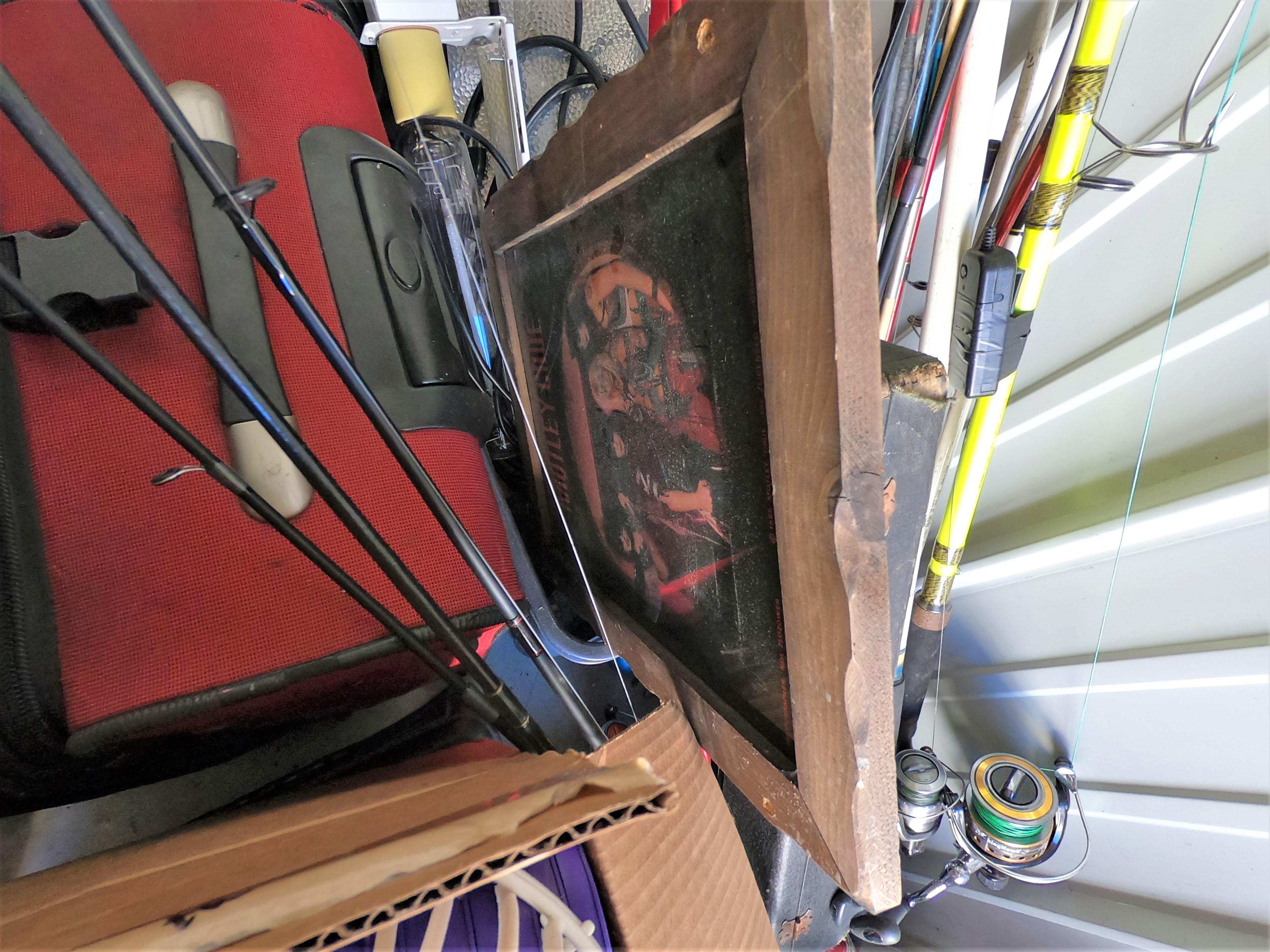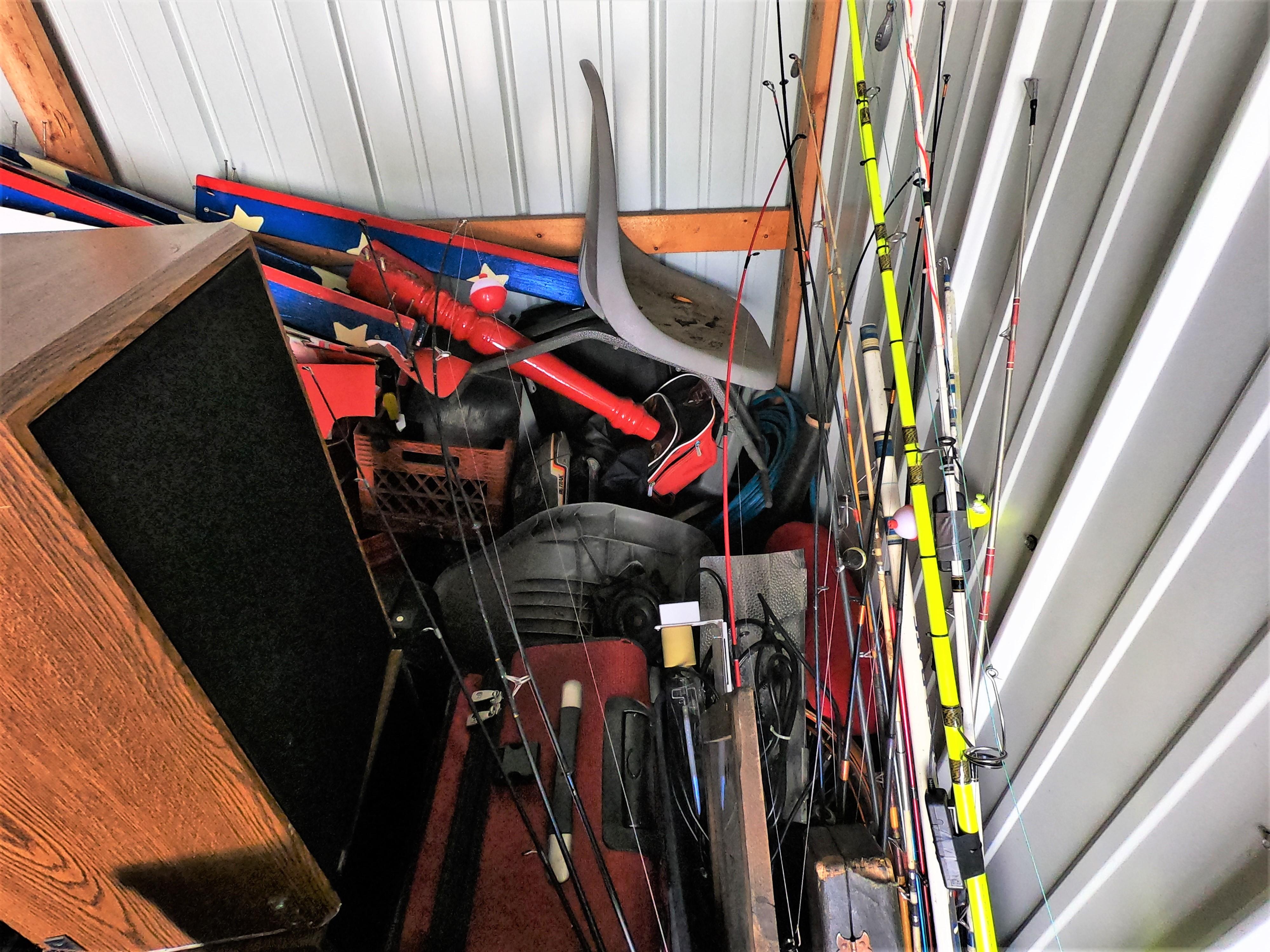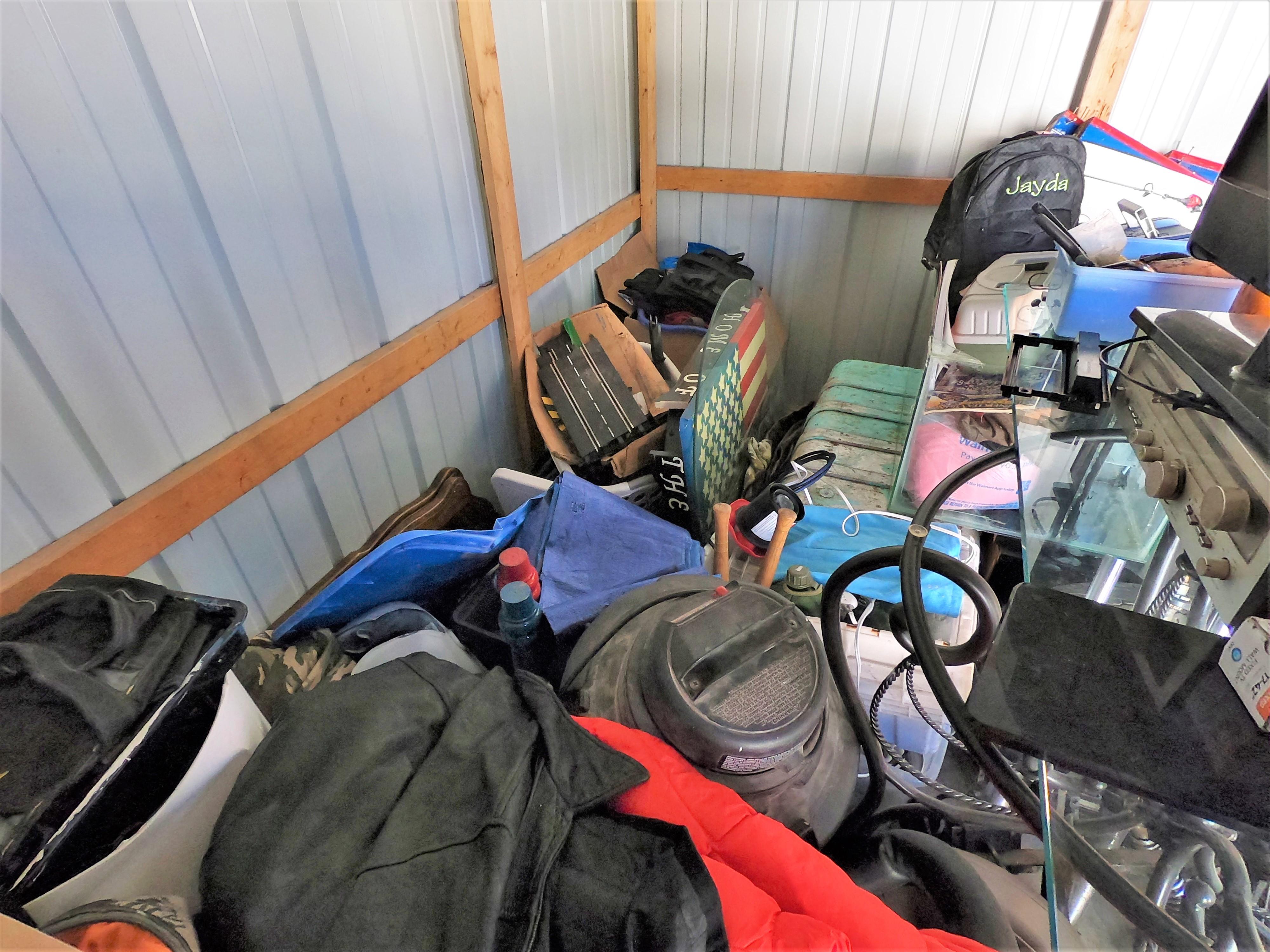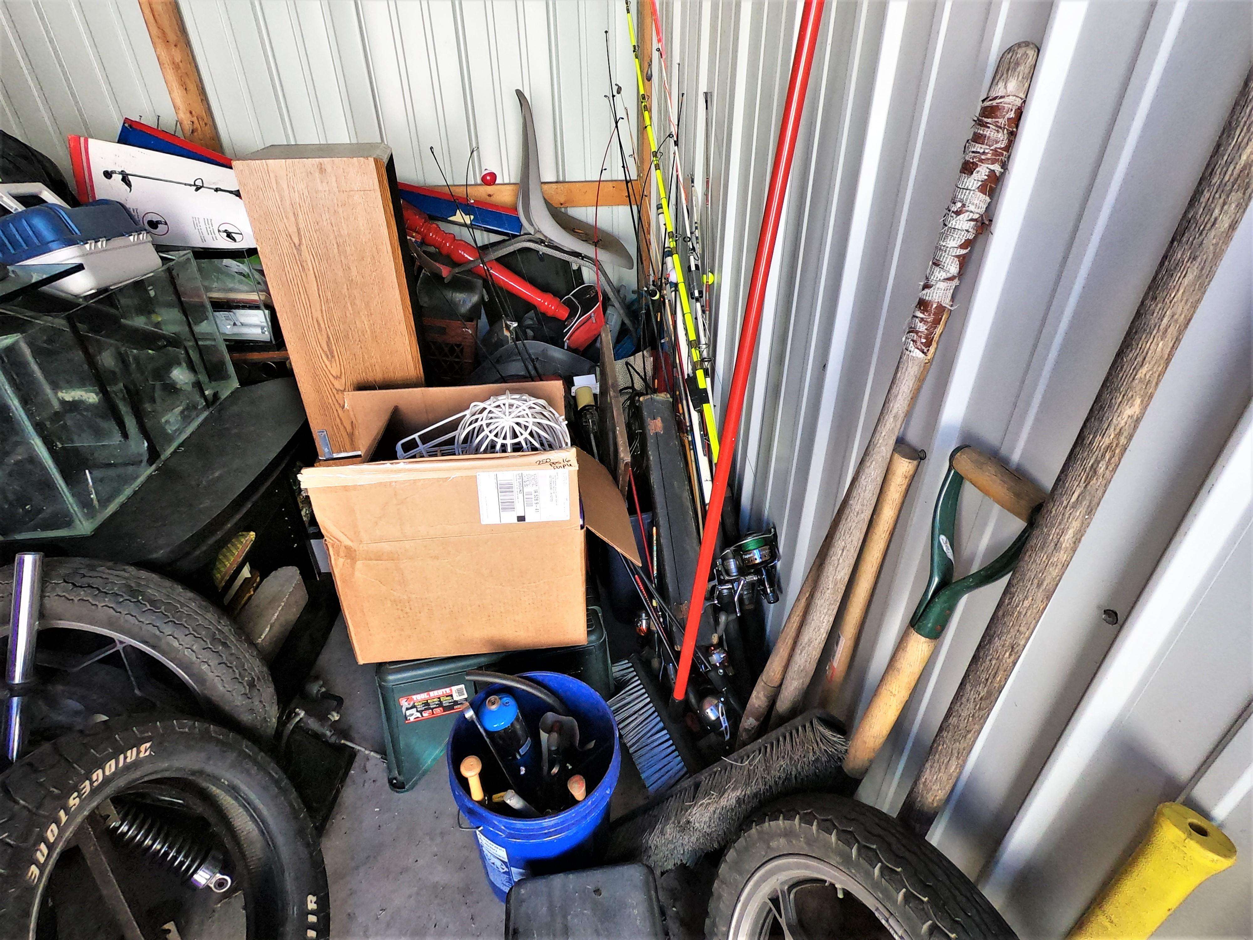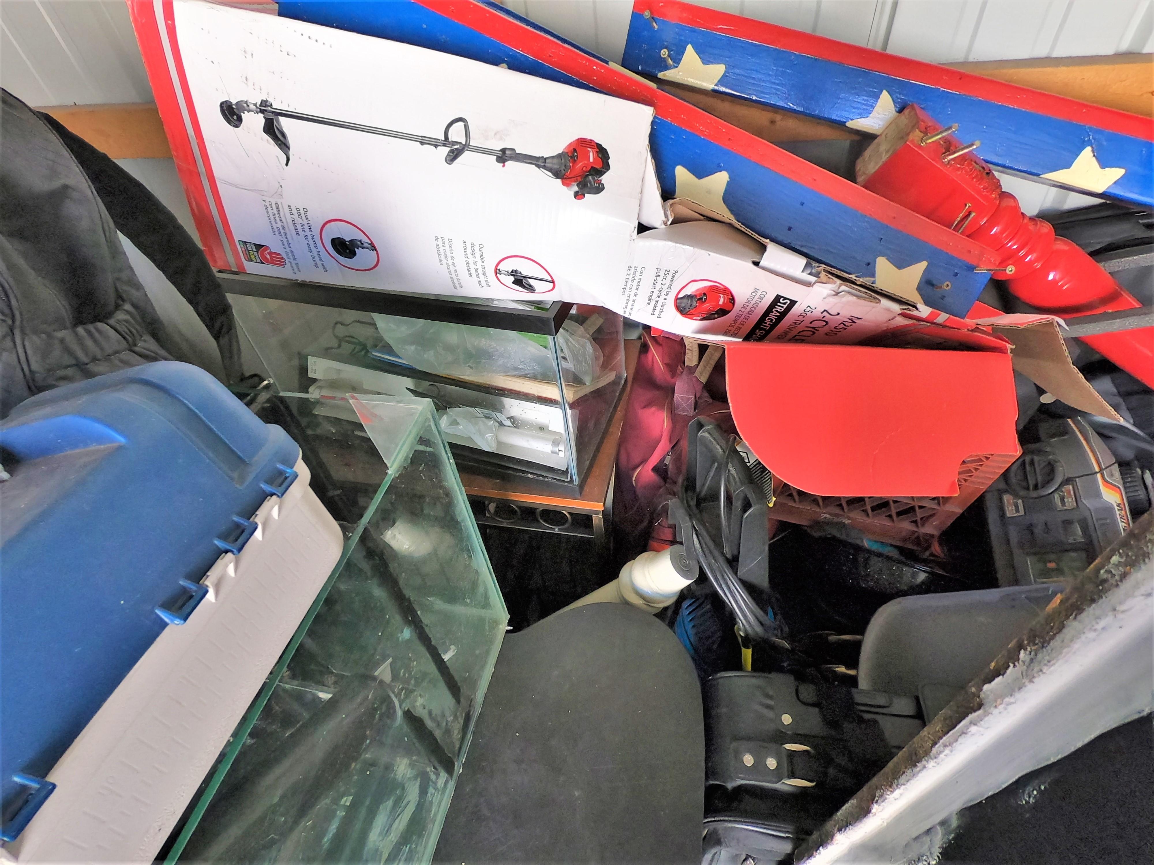 motorcycle parts, flat screen TV, aquariums, shop vac, tools, fishing poles
