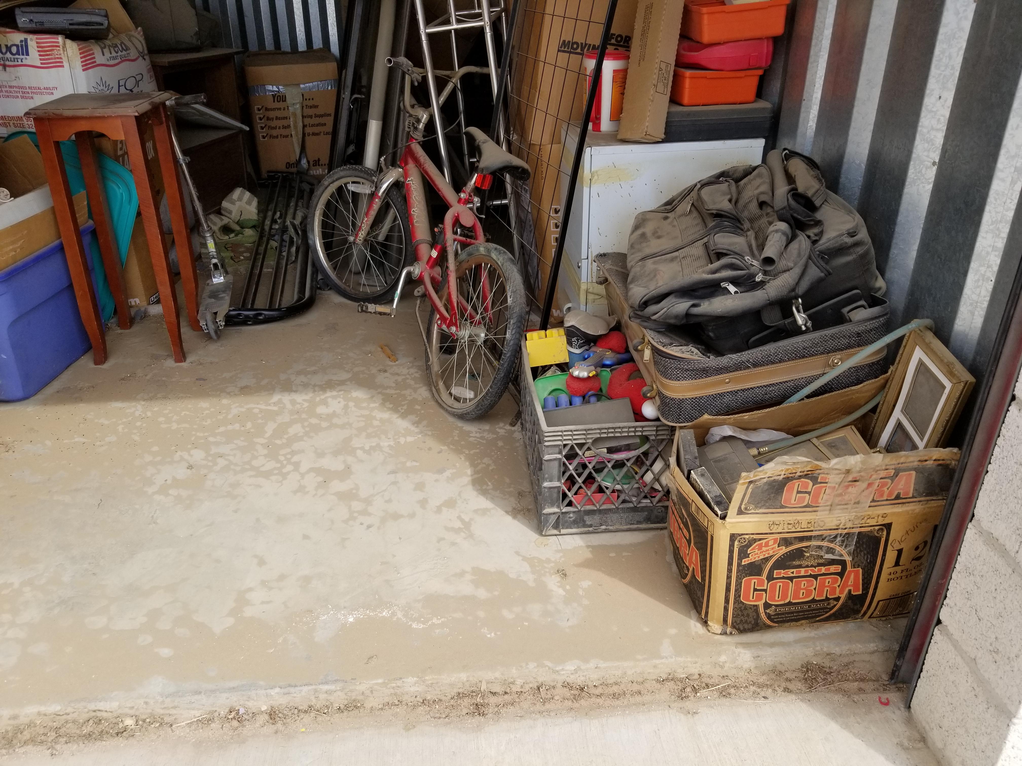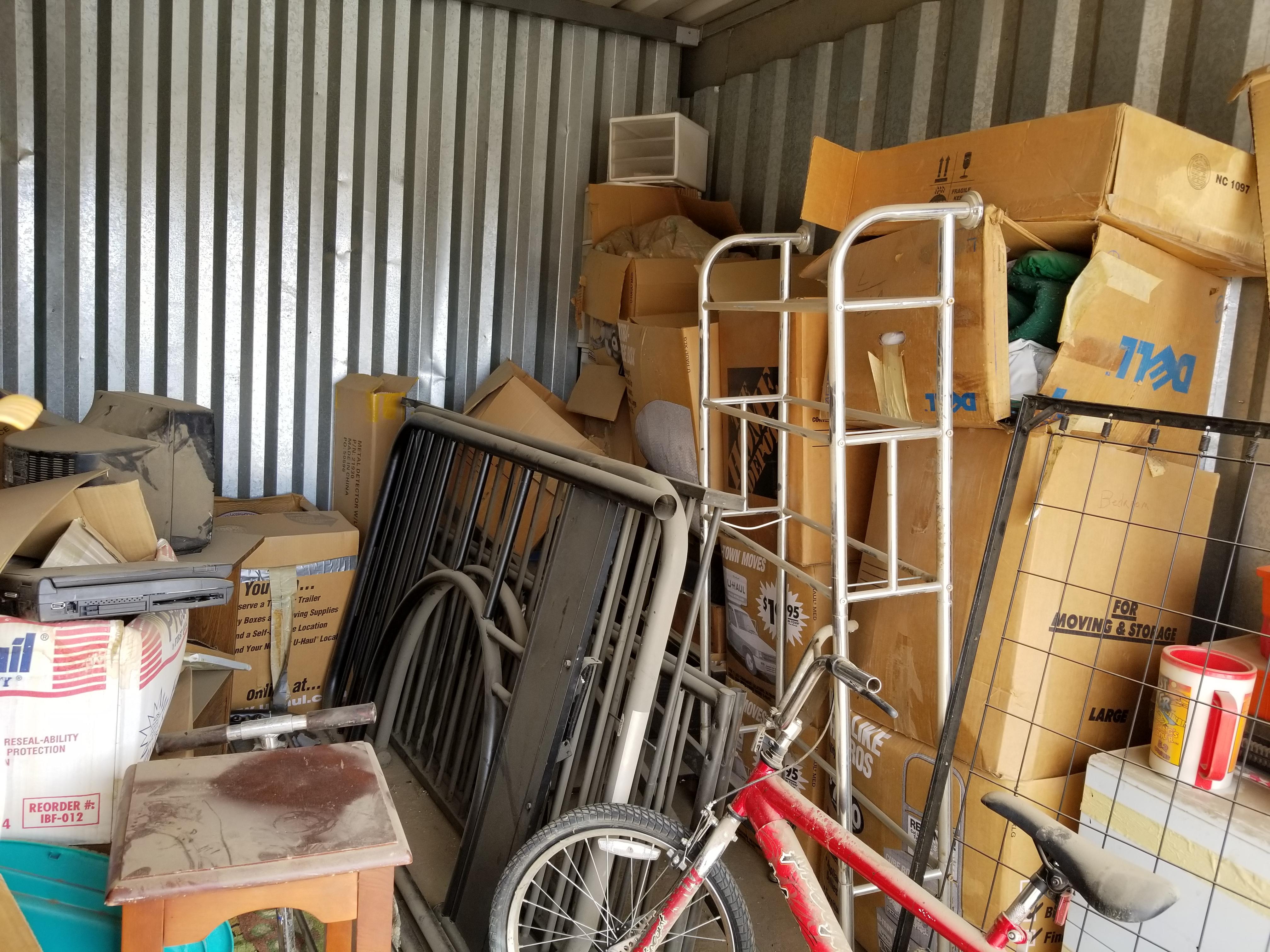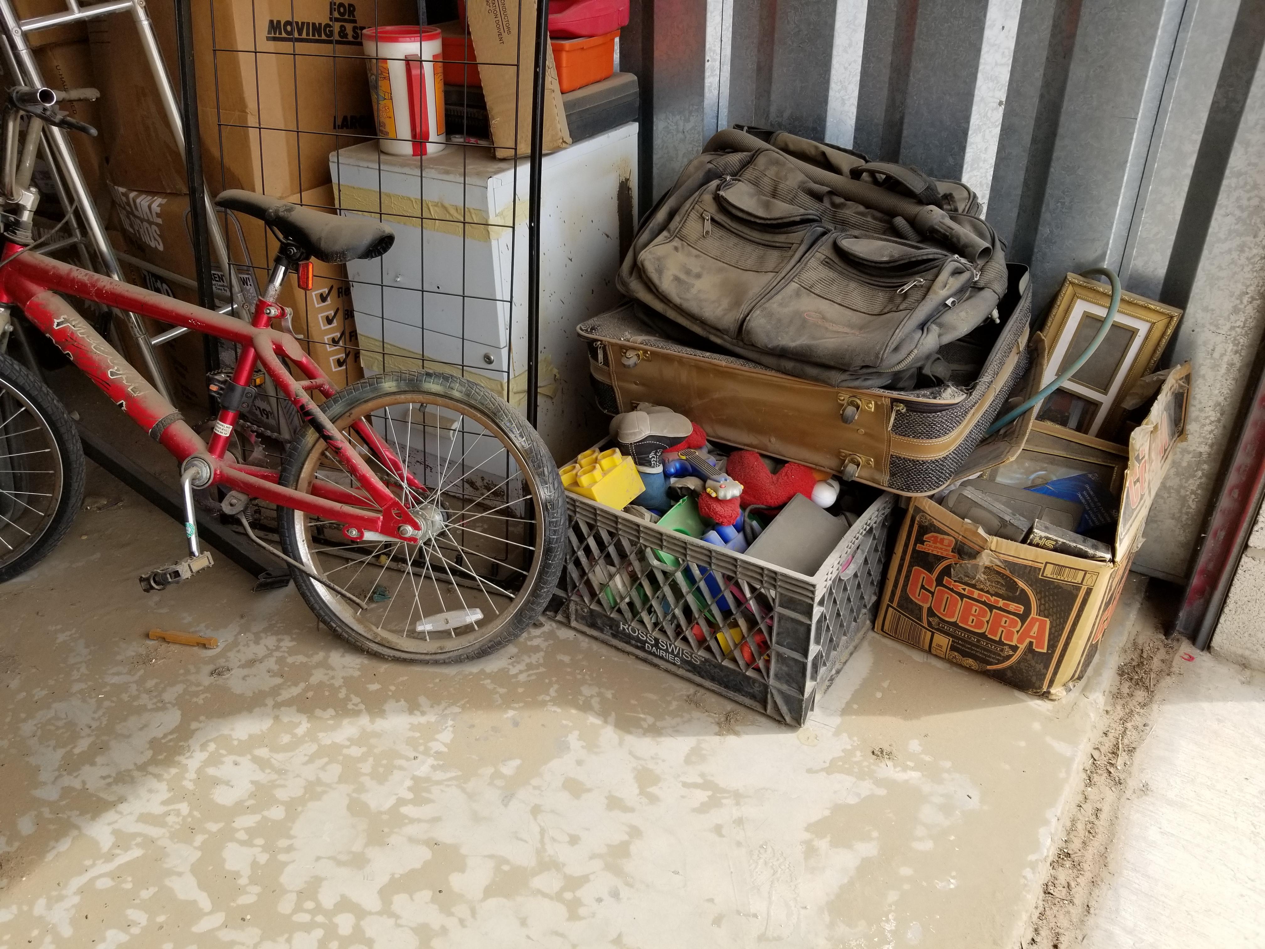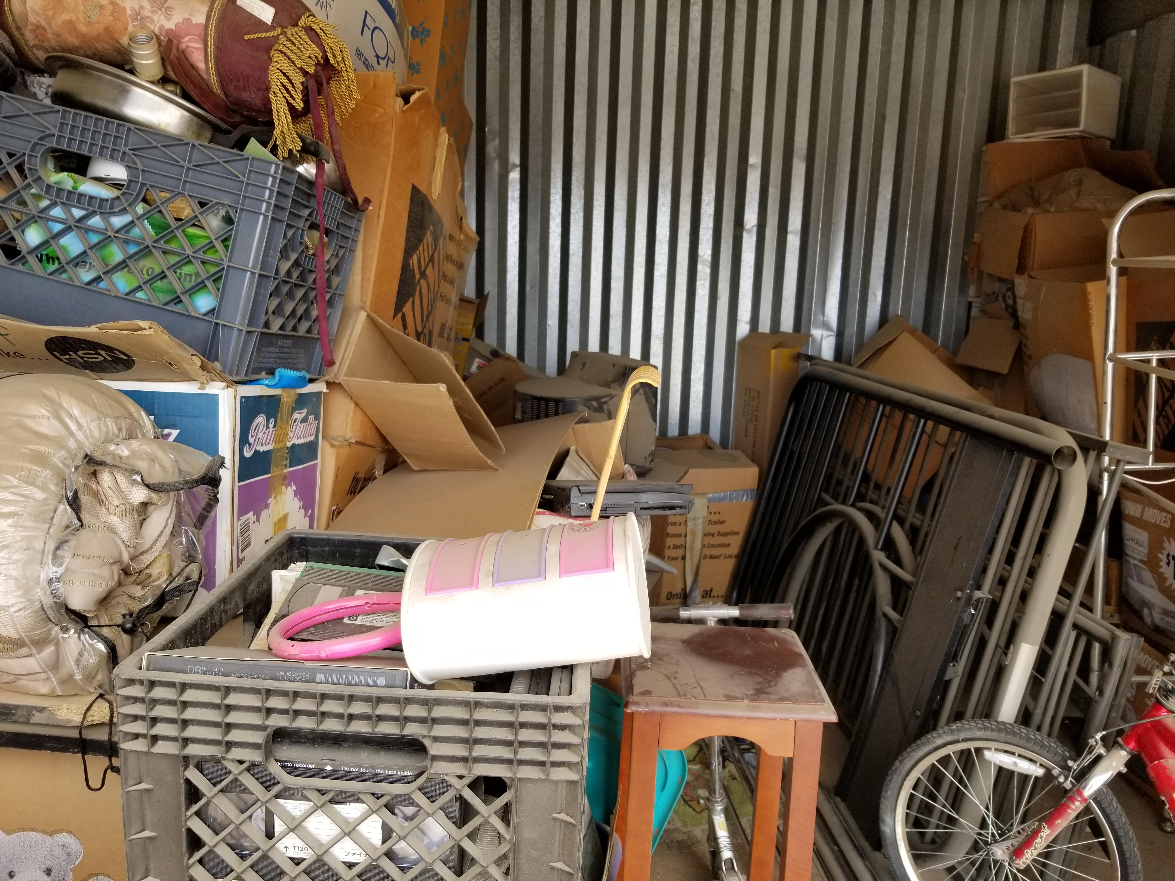 This unit is a 10x15 and looks to have lots of usable items. Bike, suitcaes, bags, toys, razor type scooter, electronics, small tables, bunkbed parts, plastric crates full of items.
