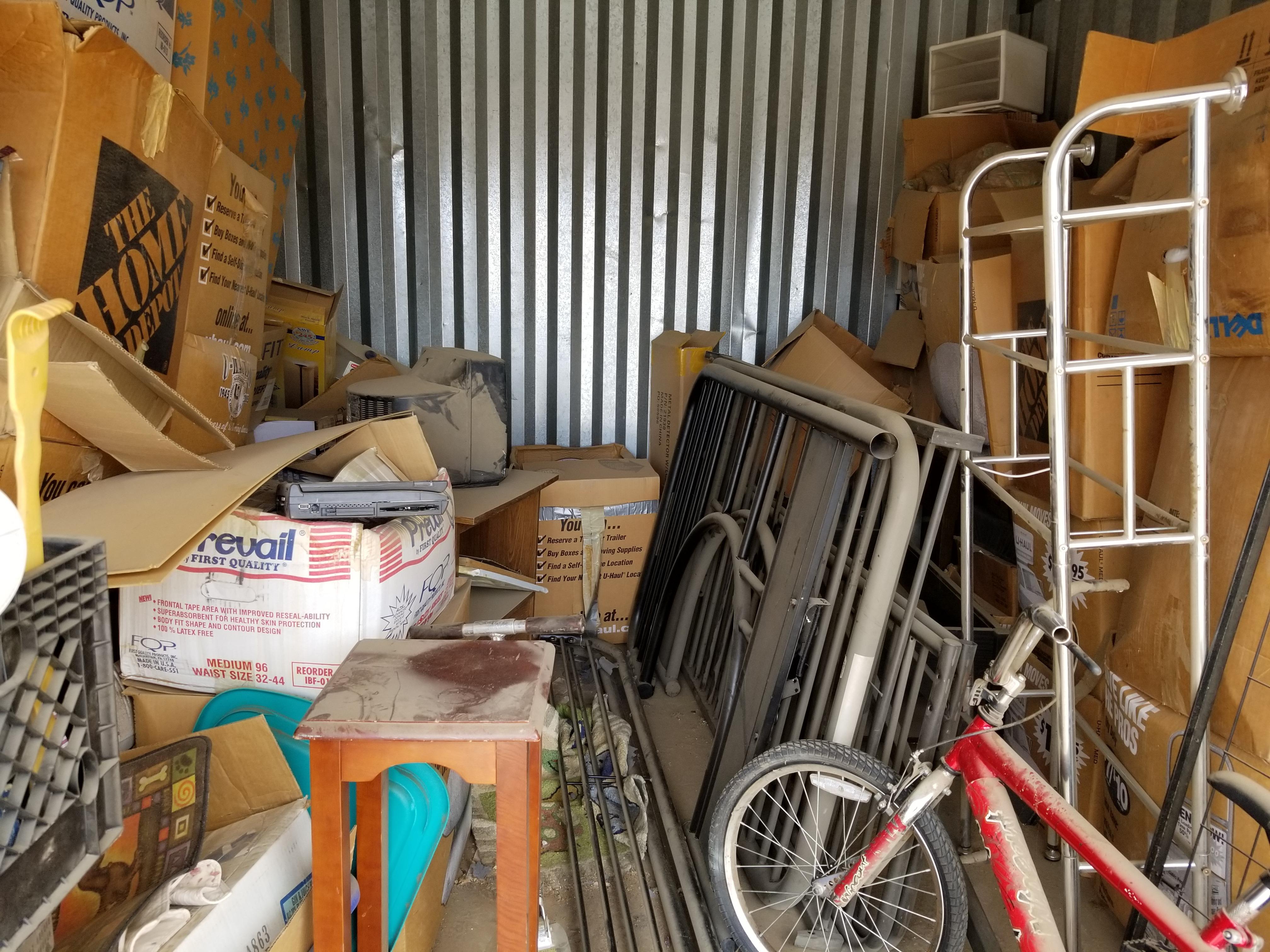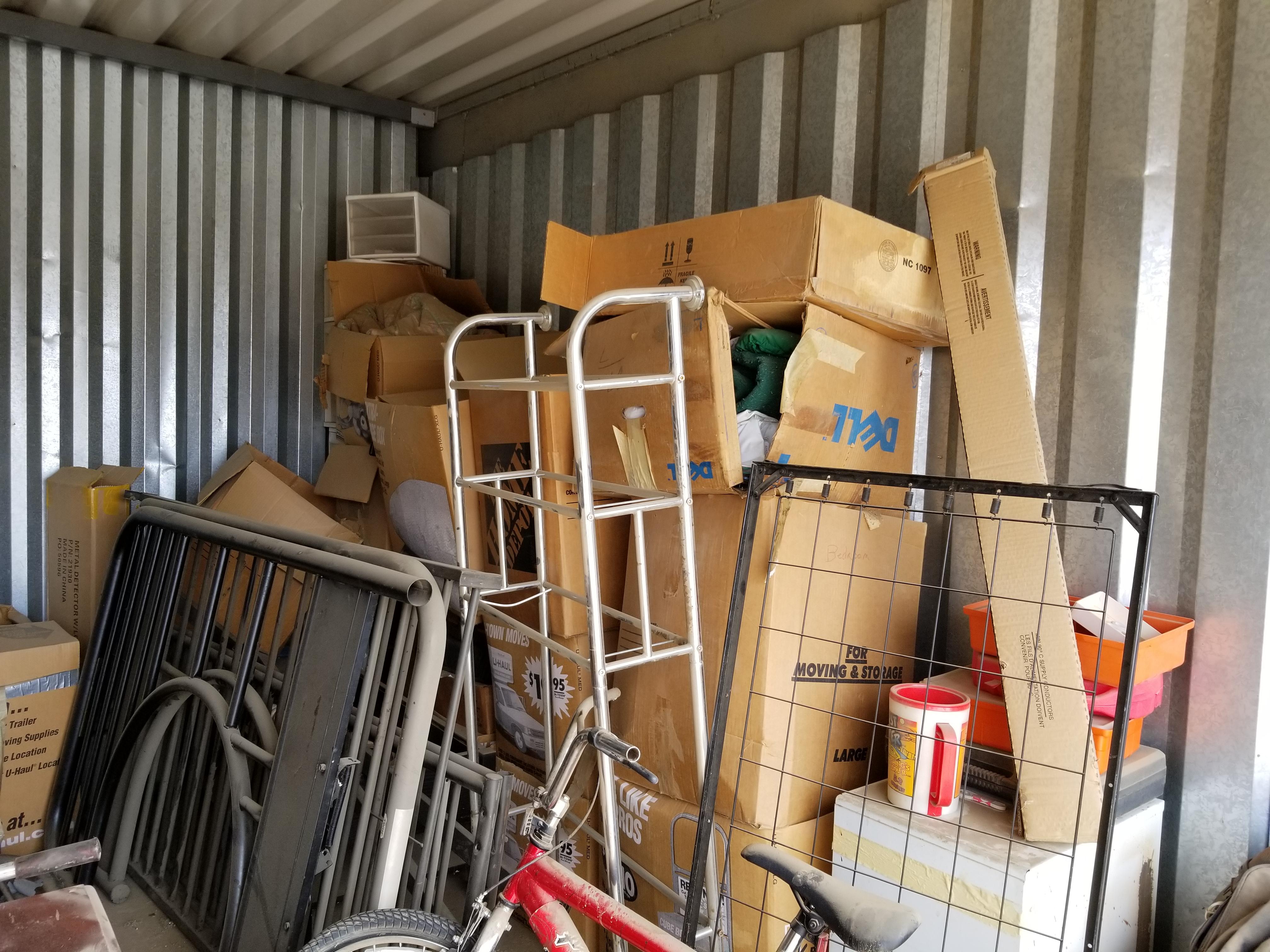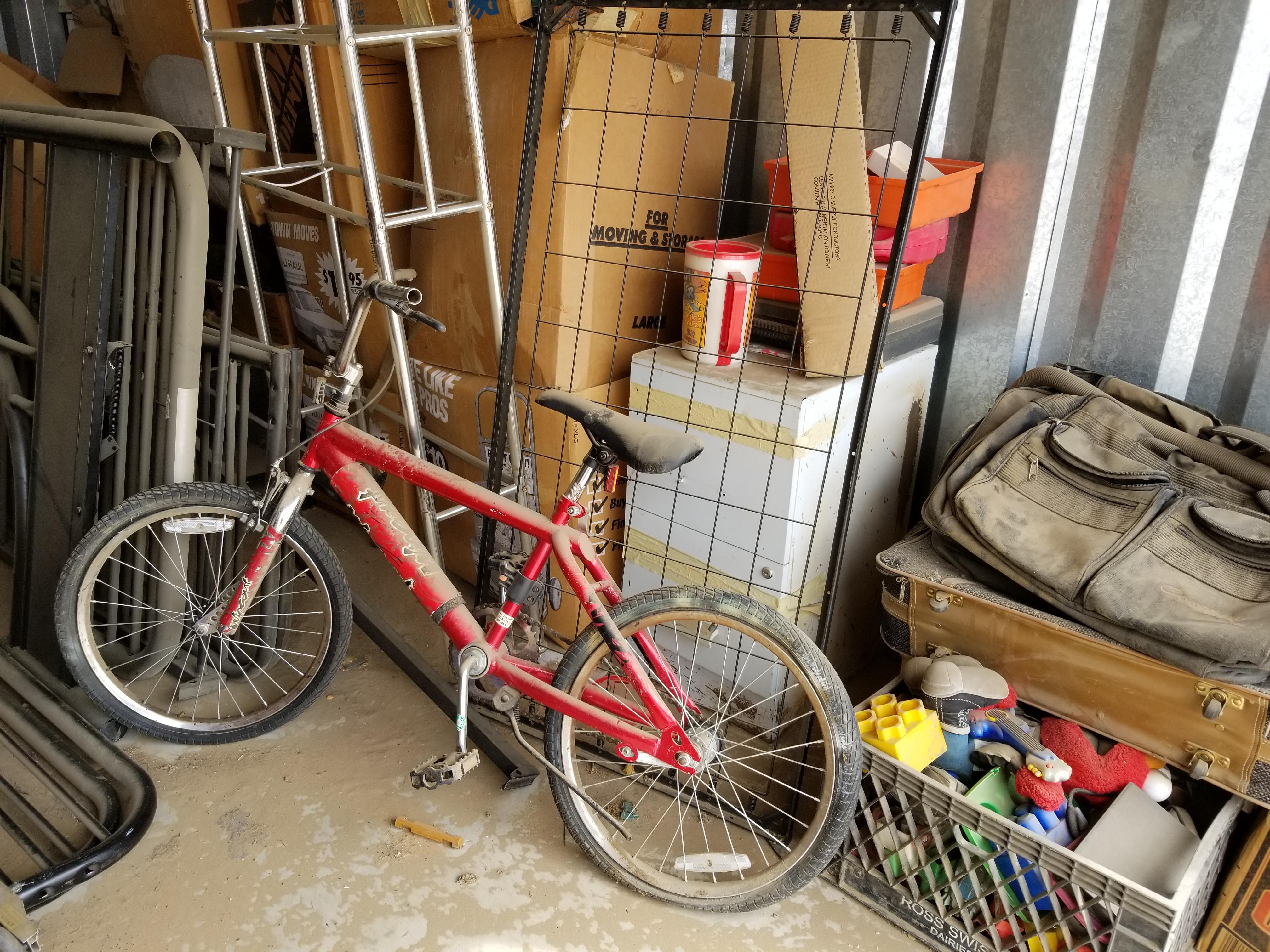 This unit is a 10x15 and looks to have lots of usable items. Bike, suitcaes, bags, toys, razor type scooter, electronics, small tables, bunkbed parts, plastric crates full of items.