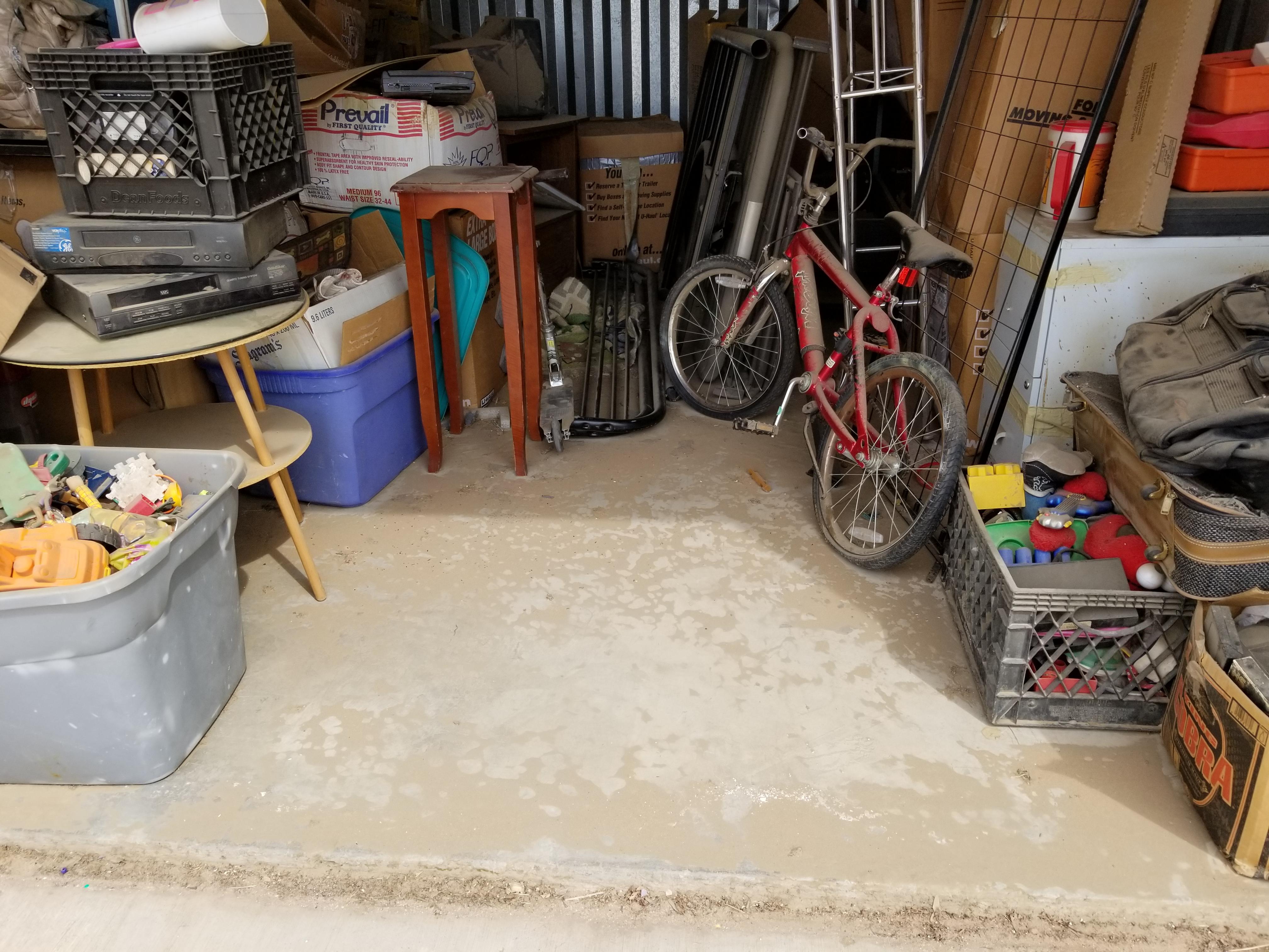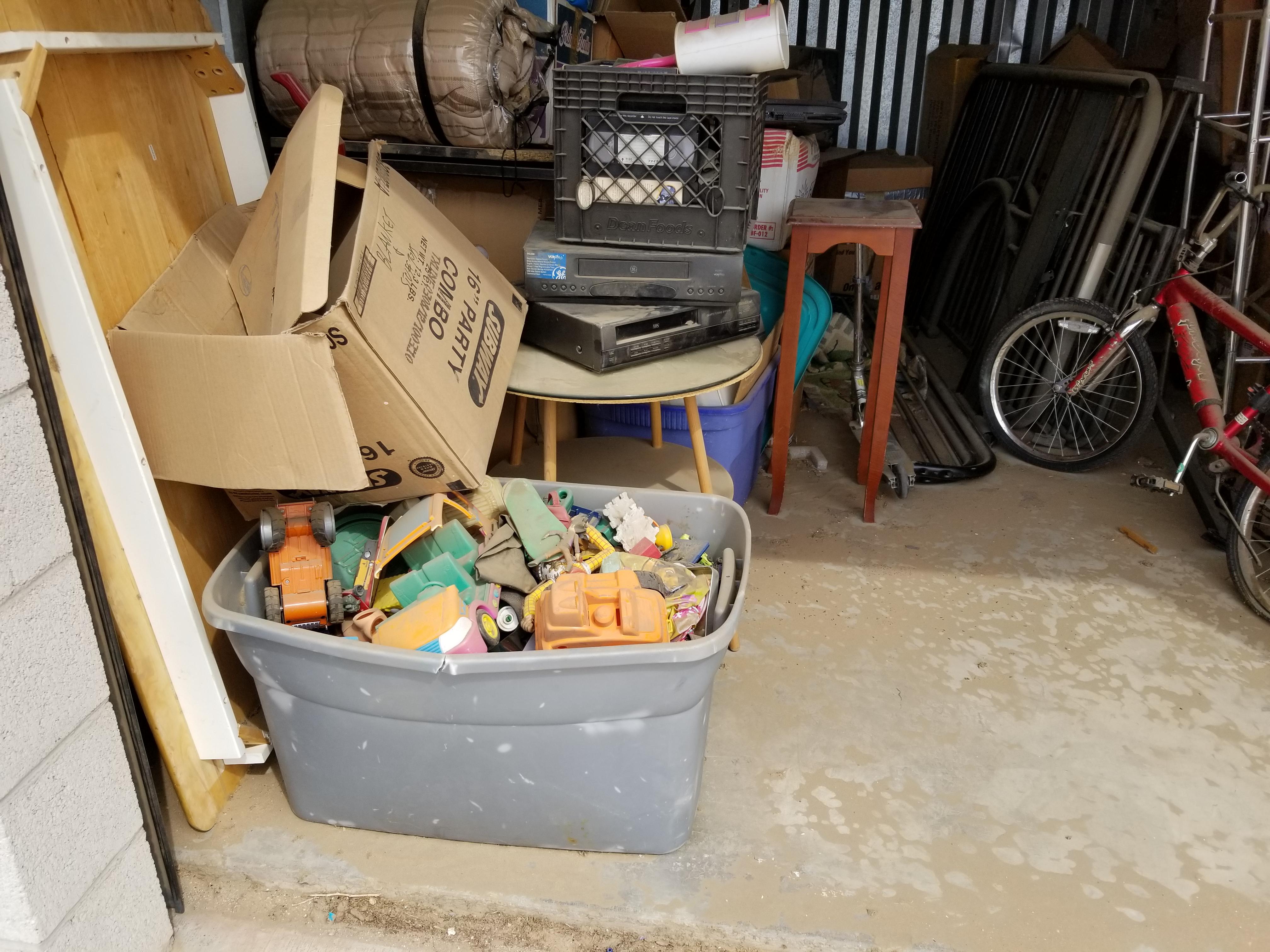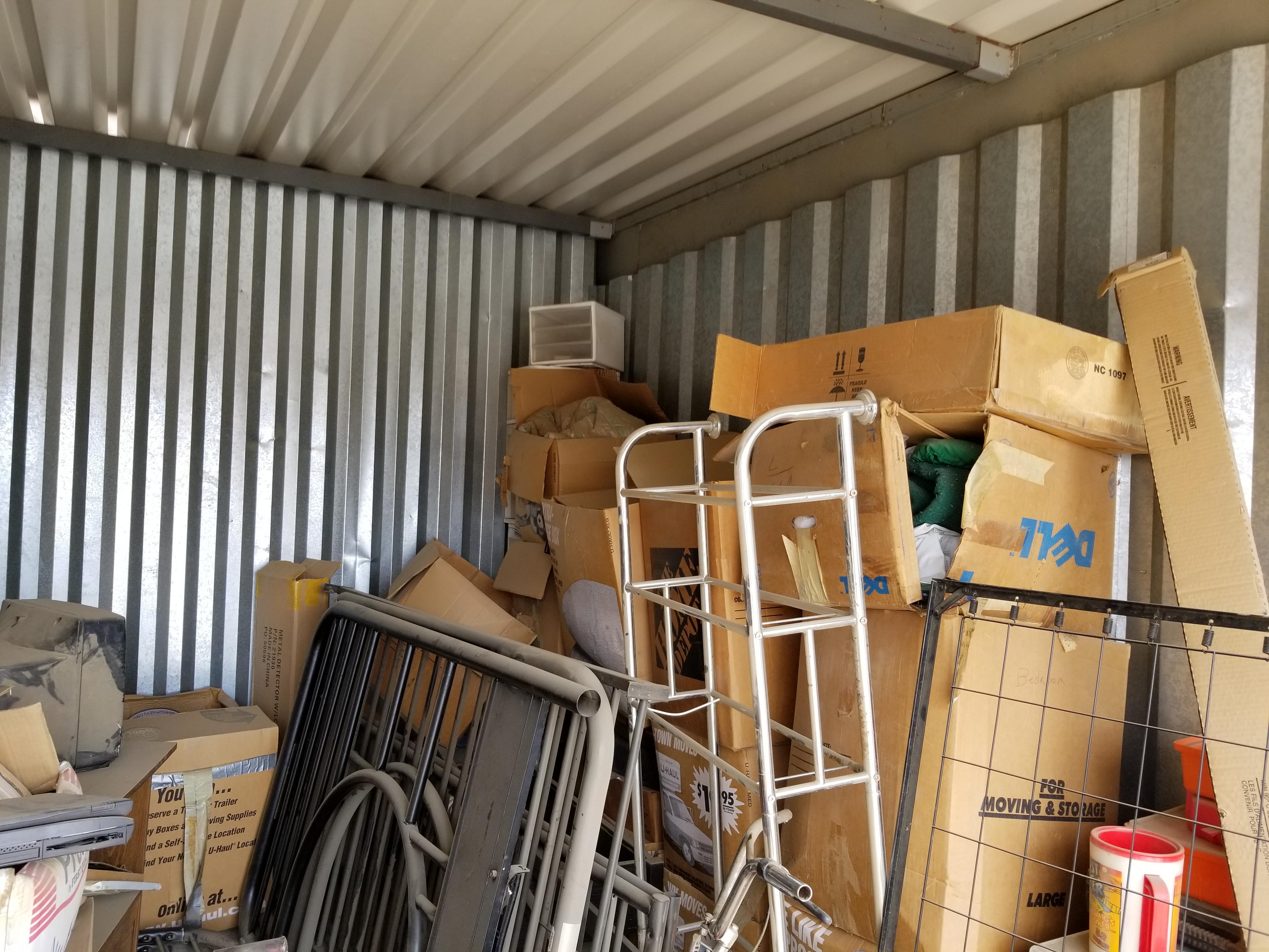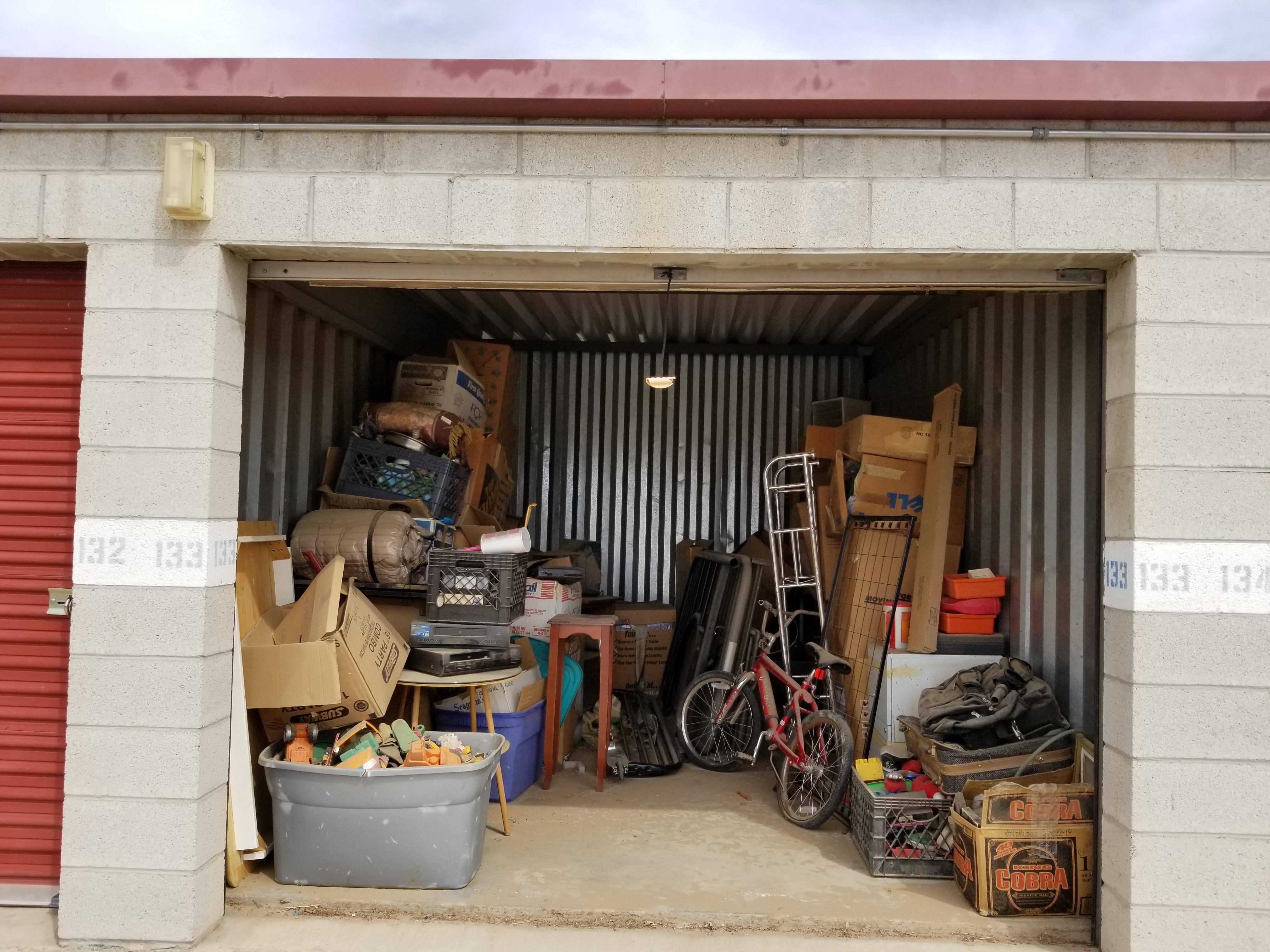 This unit is a 10x15 and looks to have lots of usable items. Bike, suitcaes, bags, toys, razor type scooter, electronics, small tables, bunkbed parts, plastric crates full of items.