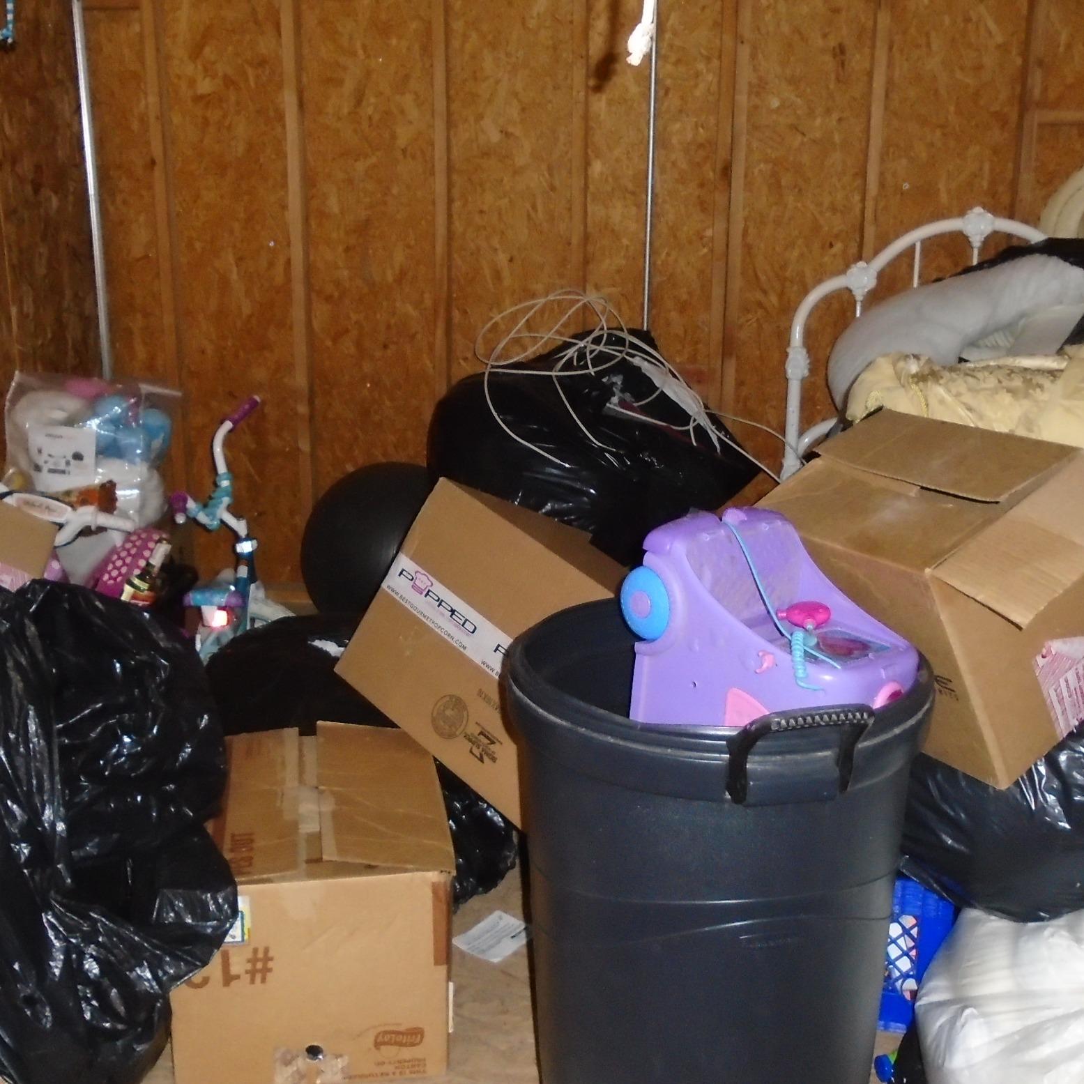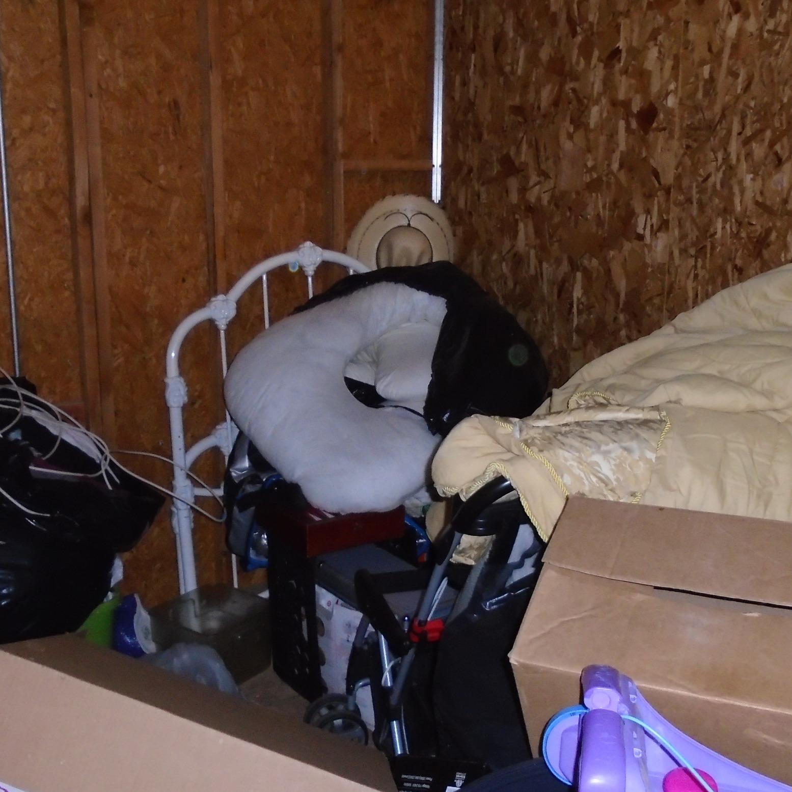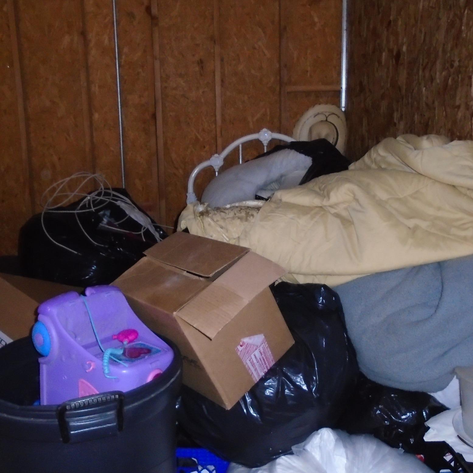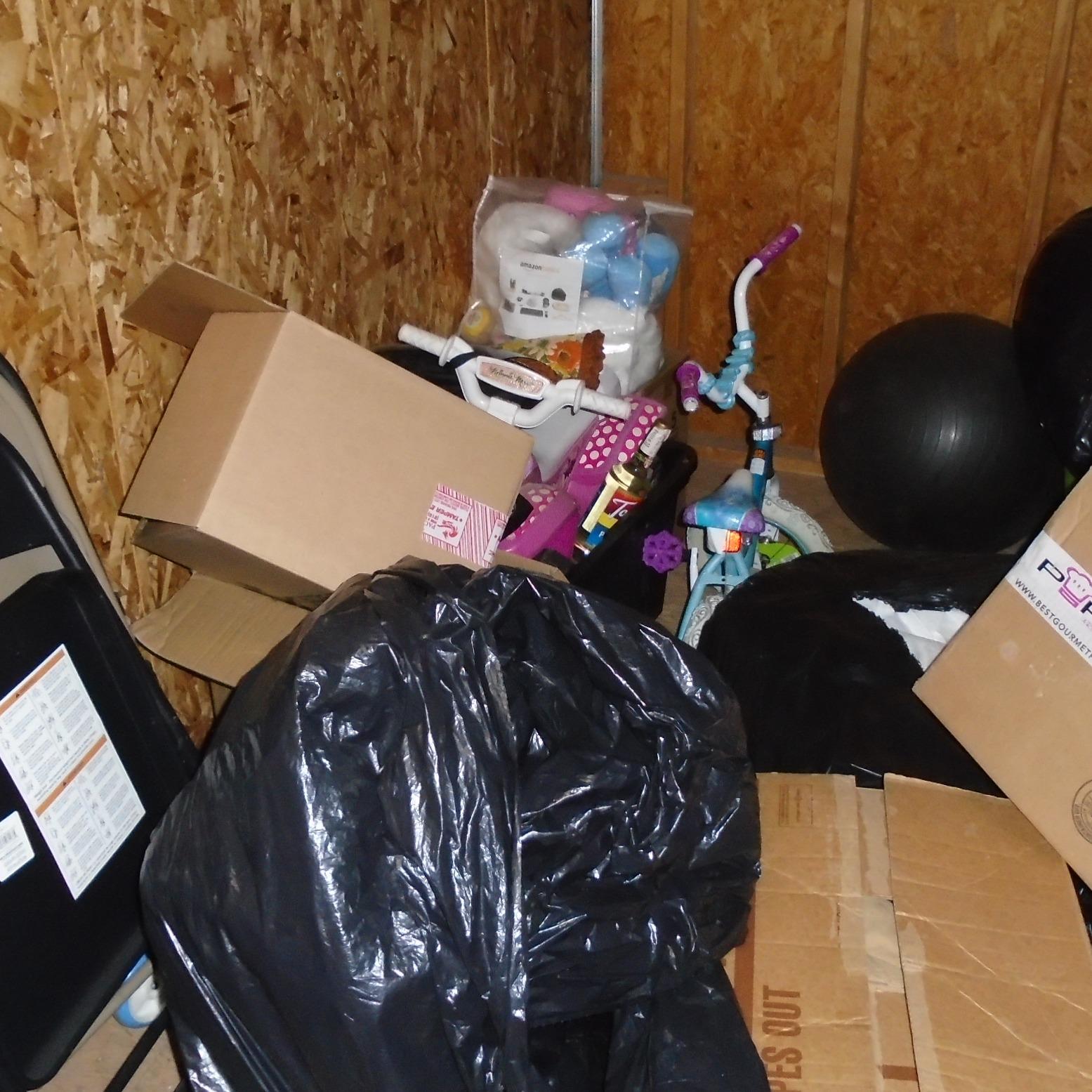 Unit appears to contain bed frame, bicycles, chairs, totes, toys, bags of clothes, bedding items, misc stuff