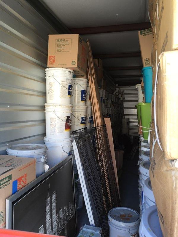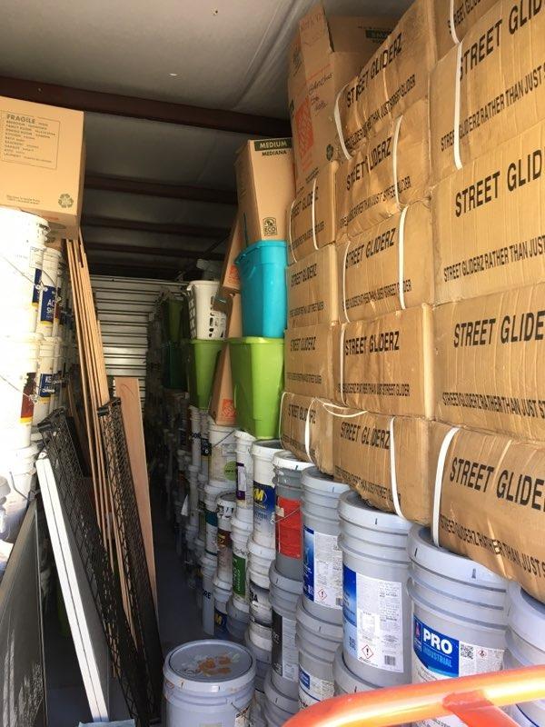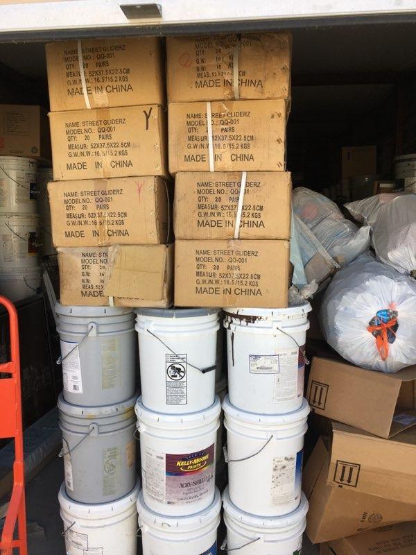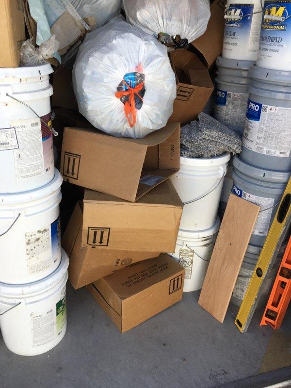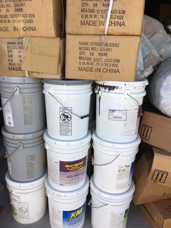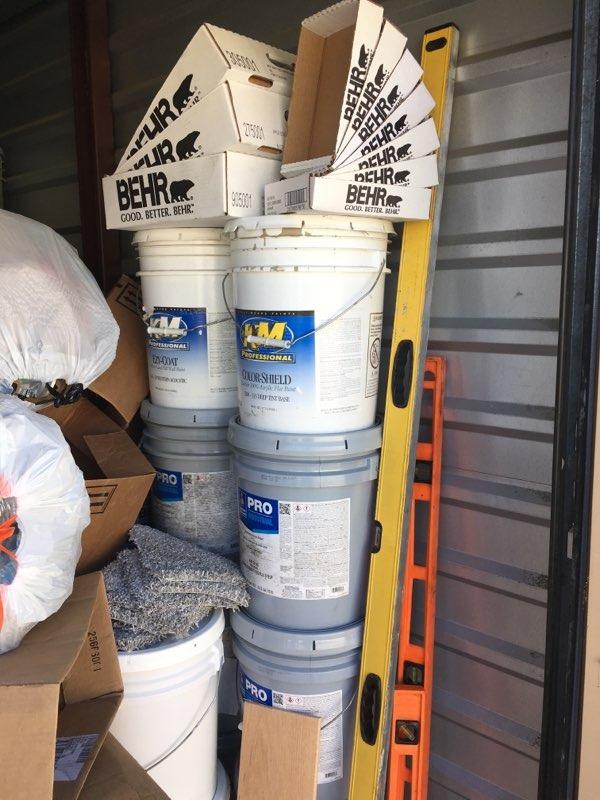 Paint cans, boxes, tools, racks, bins, picture frames, dolly, levelers