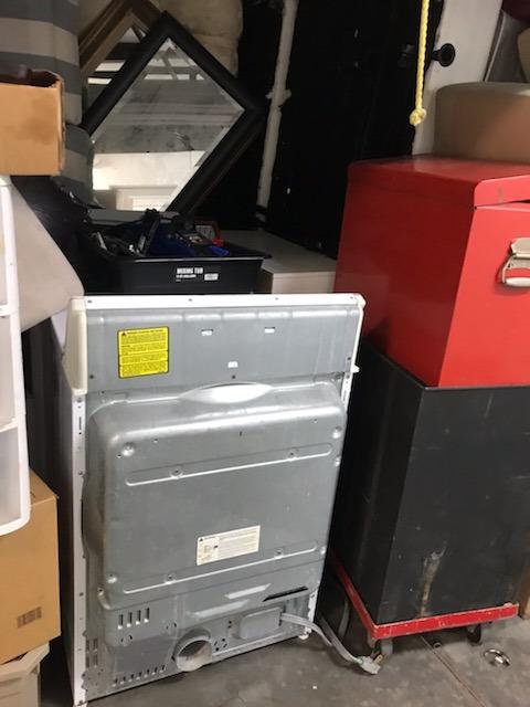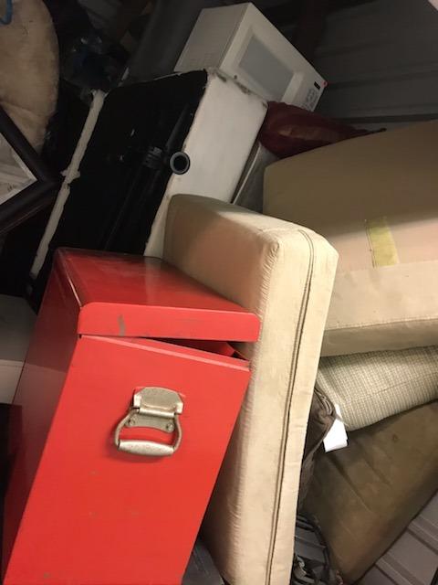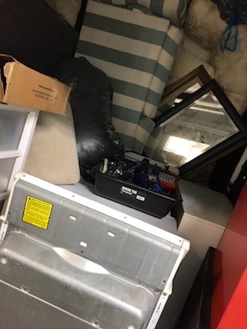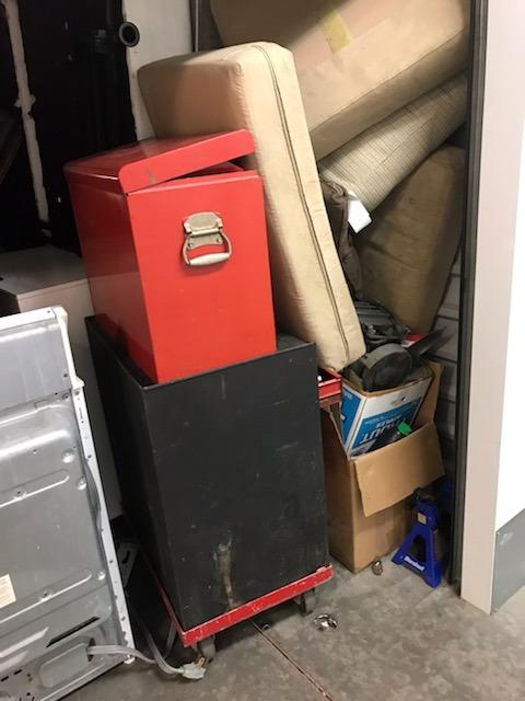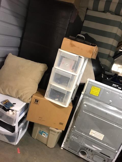 Couch, clothes, bins, washer, dryer, tool boxes, mattress, tools, boxes, misc bags