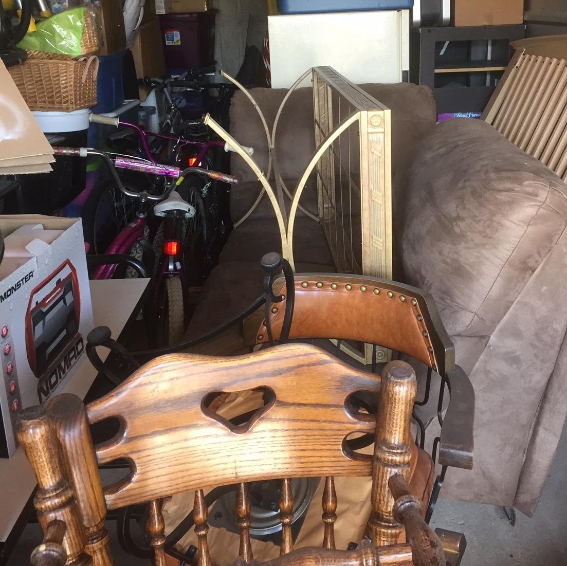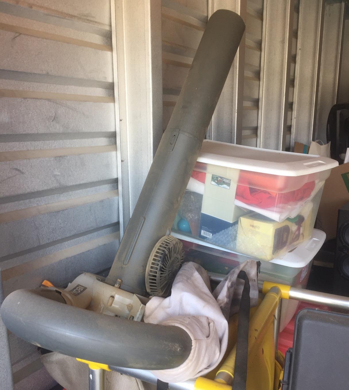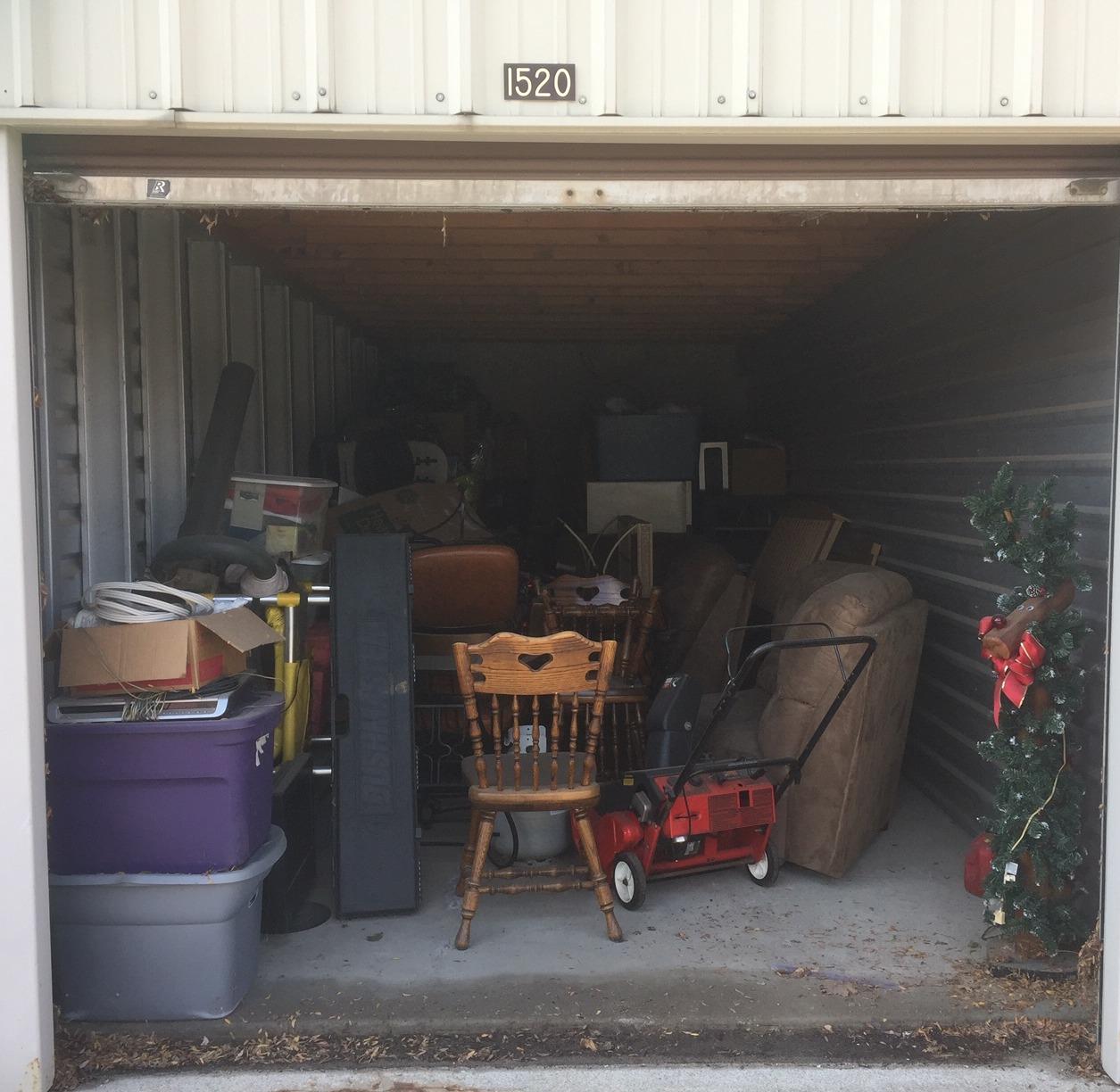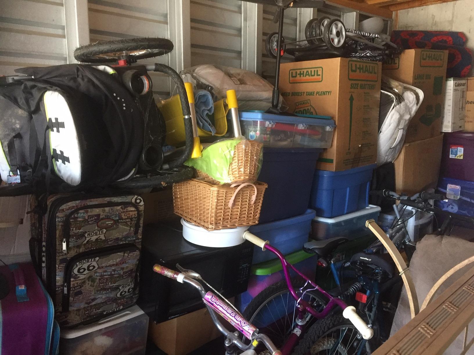 LOTS TO BE HAD IN THIS UNIT - KITCHEN CHAIRS, COUCH, SNOW BLOWER, LEAF BLOWER, BIKES, COFFEE TABLE, HEAD BOARD AND FOOT BOARD, DEEP FREEZE,2- STROLLERS, LUGGAGE, AND LOTS OF BOXES AND TOTES!