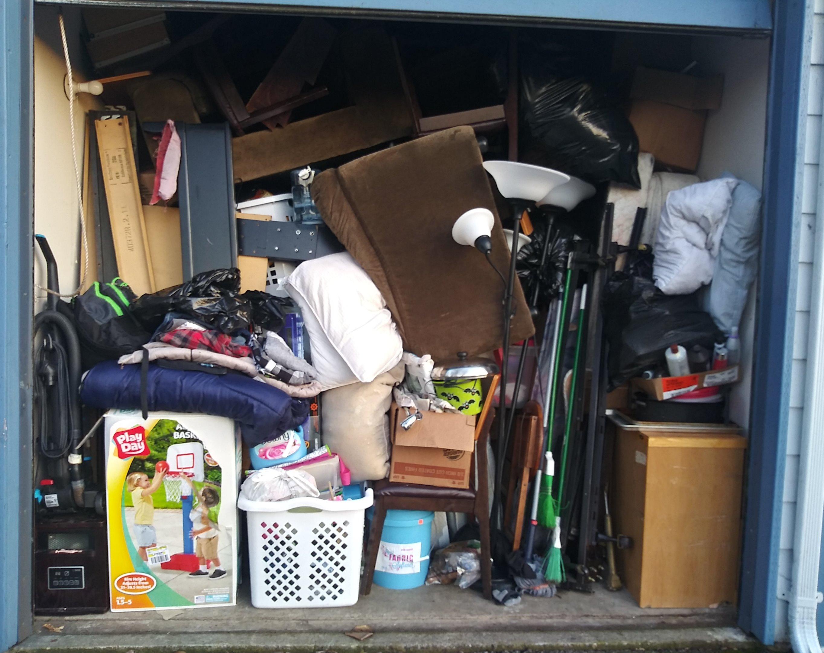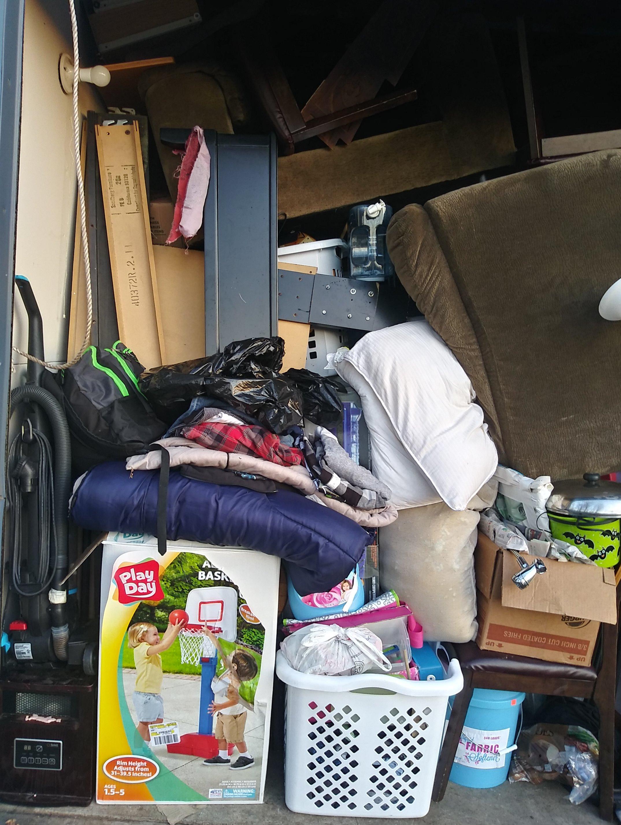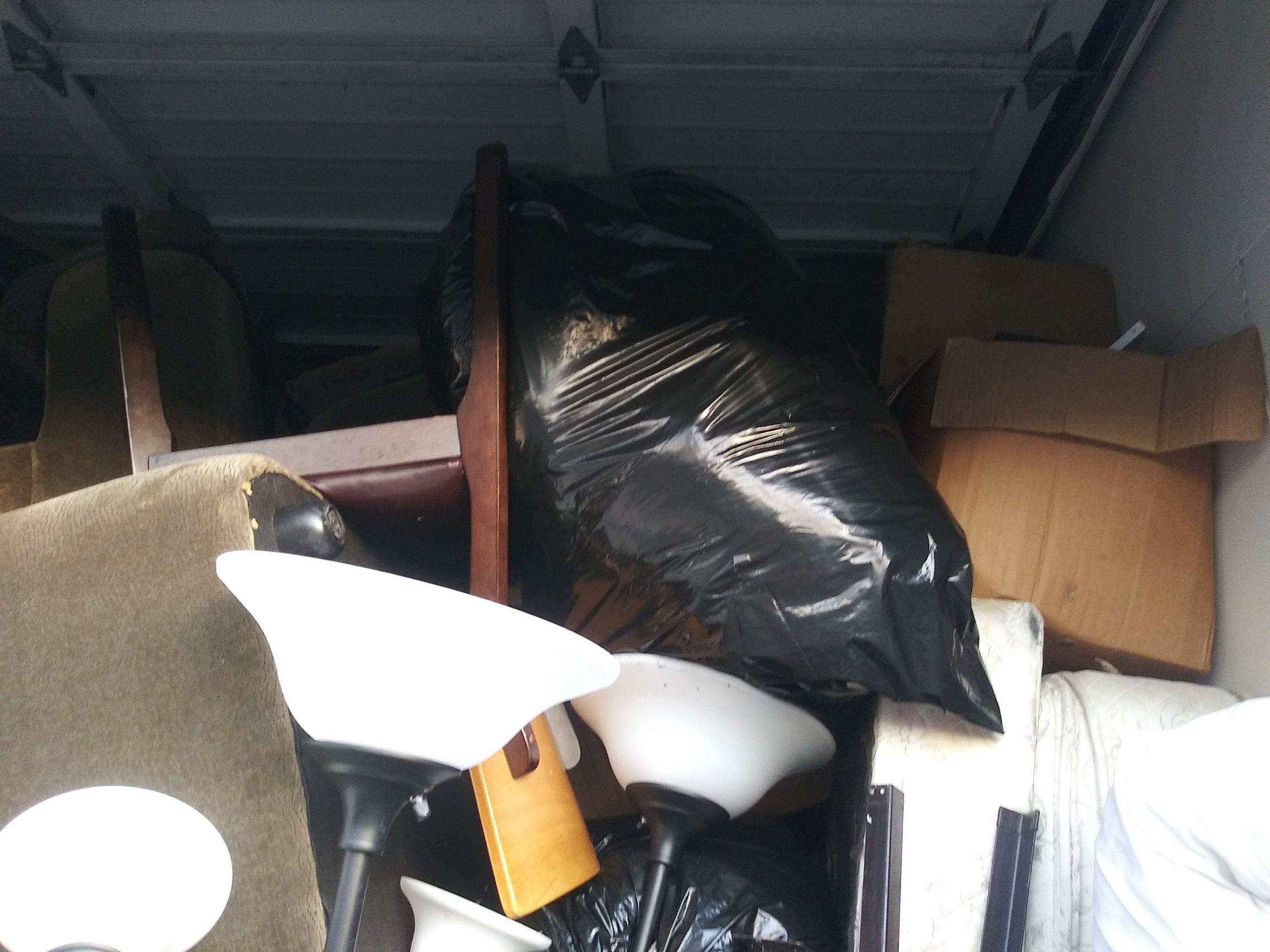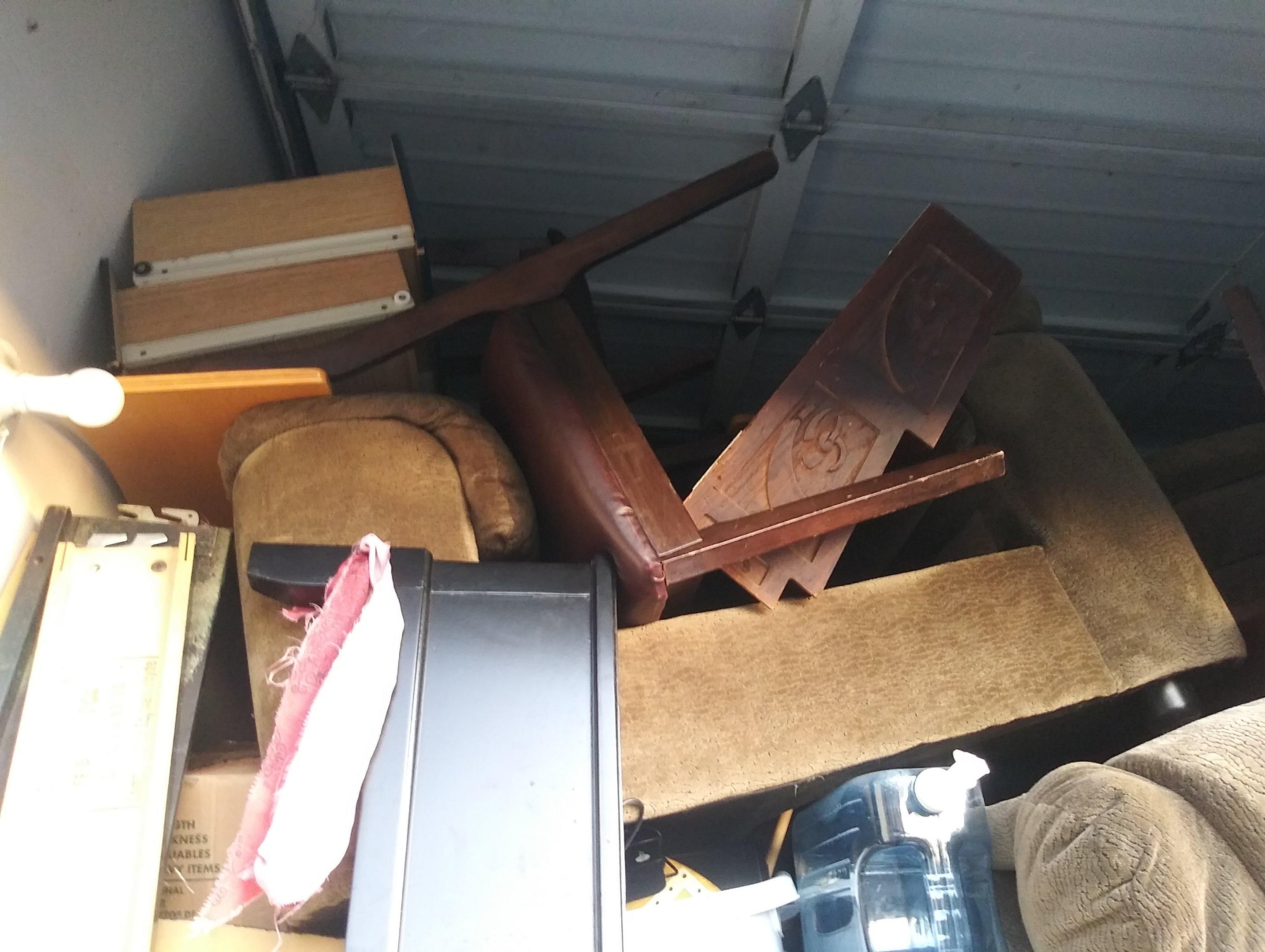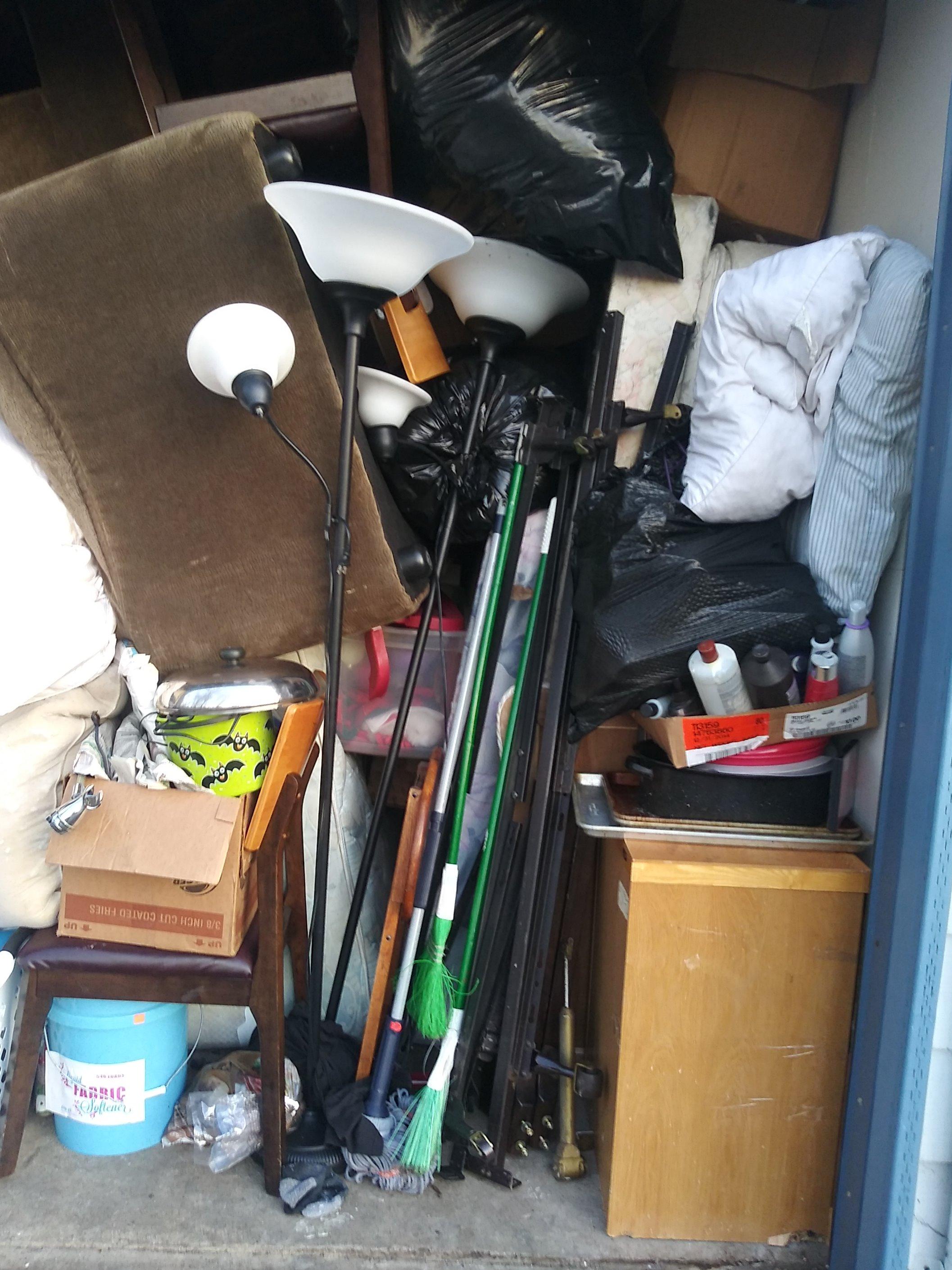 Unit is full from top to bottom: Couch, loveseat, kitchen chairs, Mattresses, wood bed frames, metal bed frames, 2 floor lamps, vacuum, laundry basket, sleeping bag, bedding, pillows, household items, cleaning supplies, clothing, flannel shirts new with tags, backpacks, black bags full, approximately 30-50 boxes.