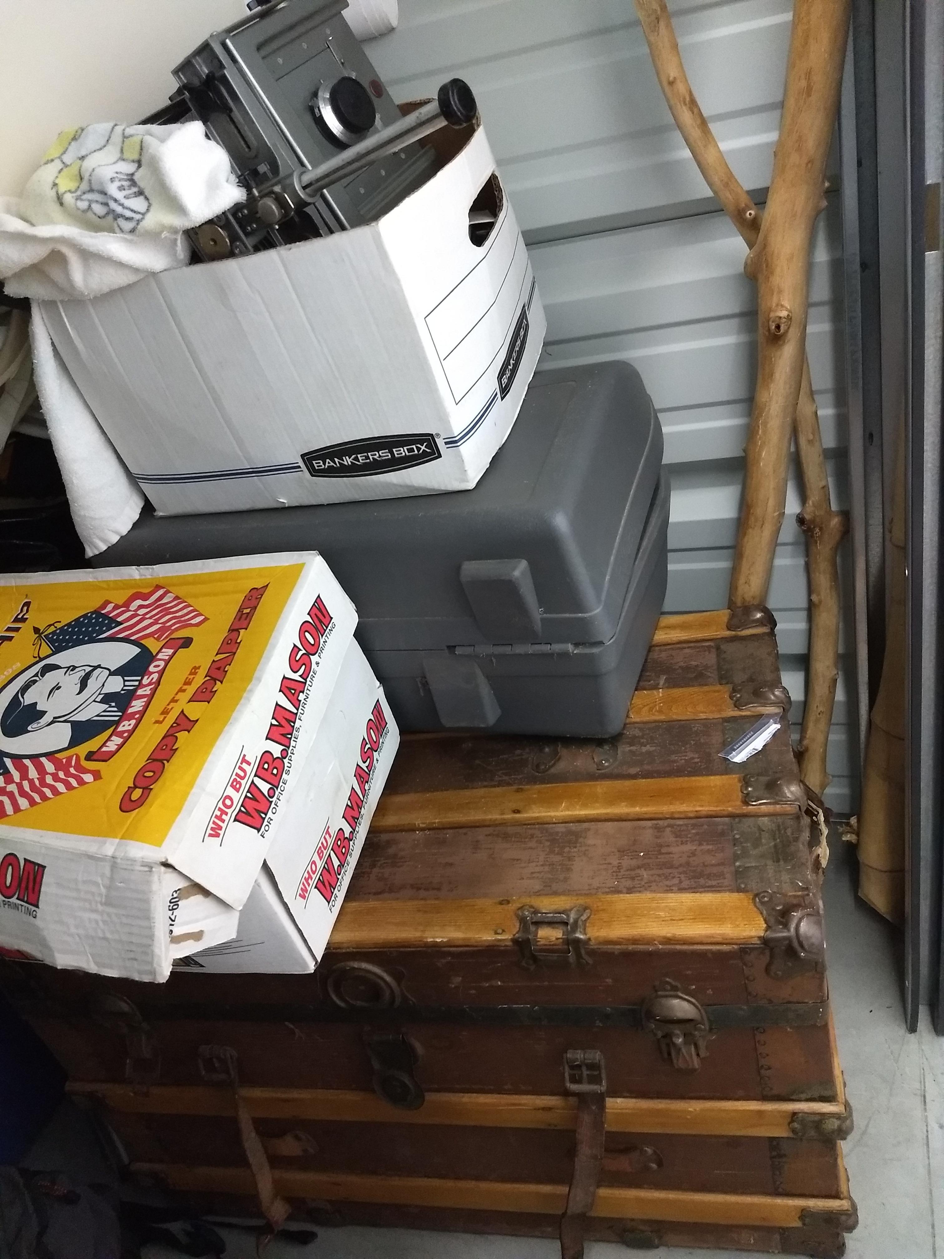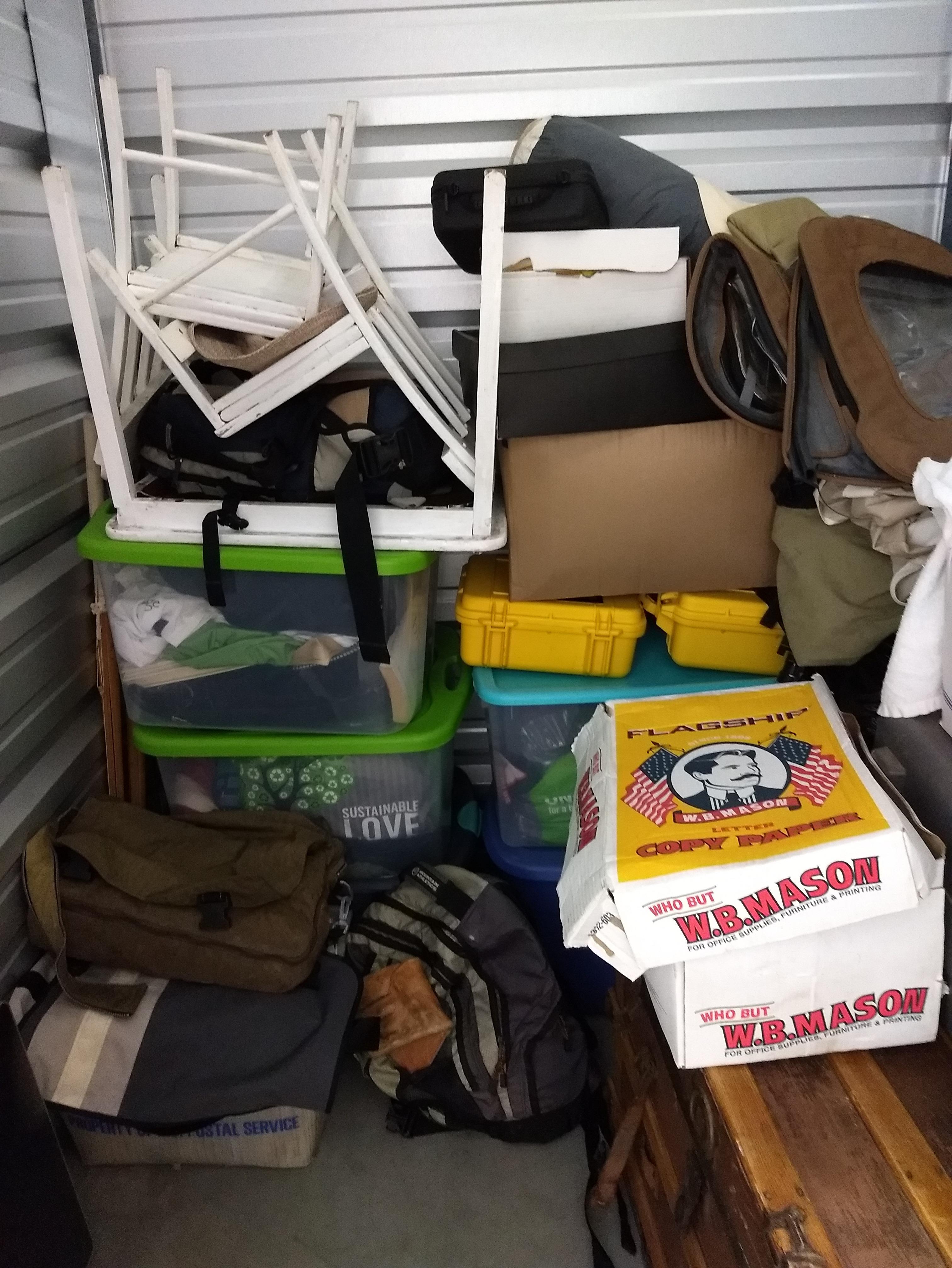 This storage unit contains 6 boxes, 2 child size chairs, 1 child size table, 1 computer screen, 1 trunk, 6 totes, 5 duffel bags, and 1 camera.